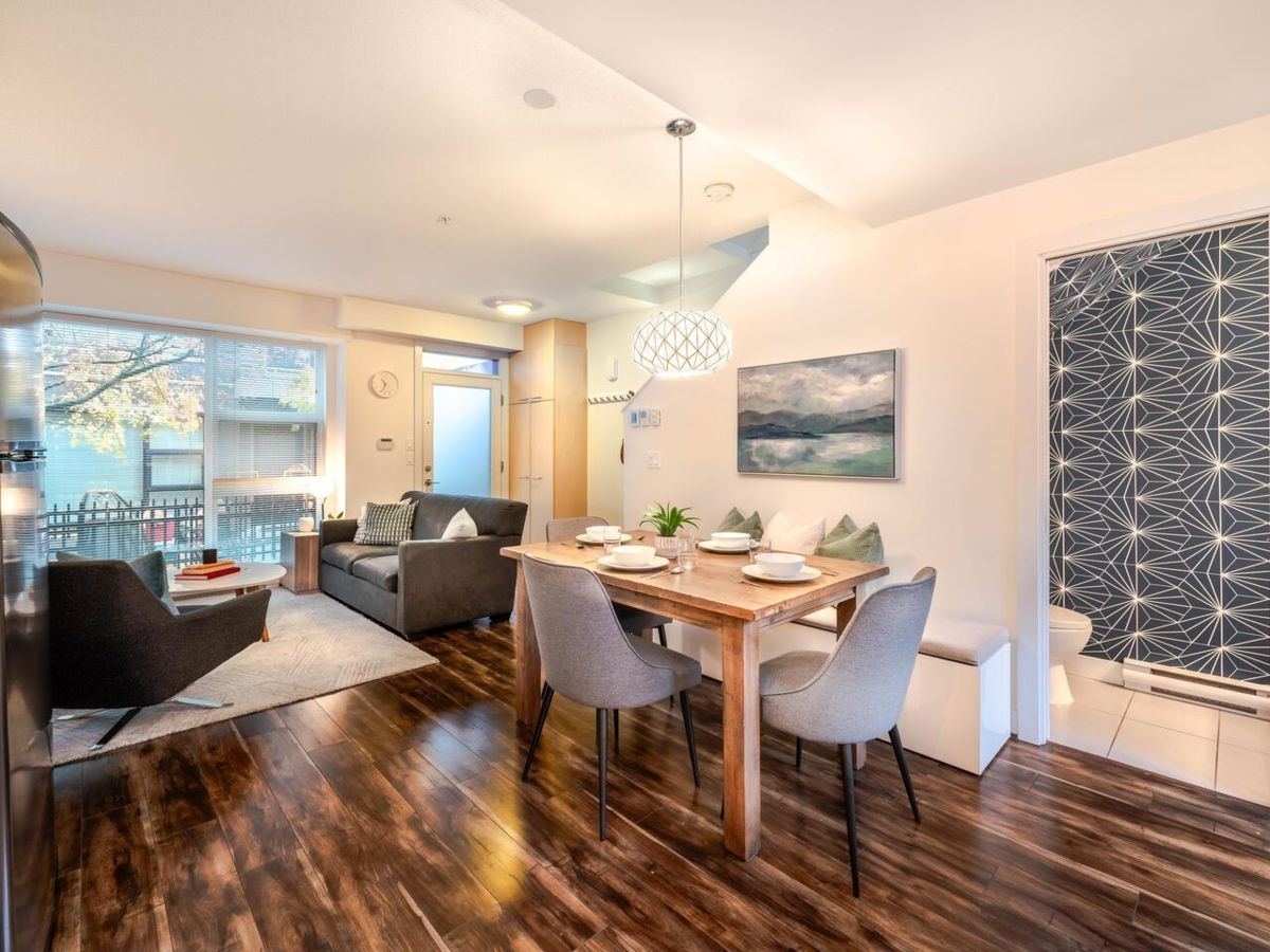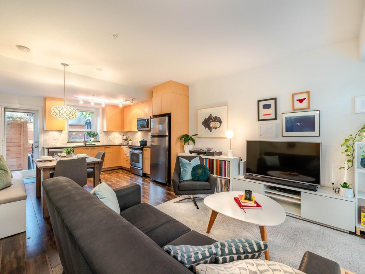 The ideal three bed and den parkside townhome in Mount Pleasant. Efficient layout features open kitchen, dining, and living with a powder room on the main floor. Quartz countertops, stainless steel appliances, contemporary maple cabinetry, hard surface flooring, with both a front patio, and a fully fenced backyard. Upstairs find the spacious primary bedroom with ensuite, and lovely open den for work from home. The top floor includes two nice sized bedrooms and full bath. Take in the park, city, and mountain view from the rooftop deck. Well kept home with updated lighting, ceiling fans, dishwasher, laundry pair, retractable screen doors, and stylish wallpaper. Parking with EV chargers installed, storage, rentals ok, cats and dogs allowed. Open House Sat Nov 9 2-4pm.