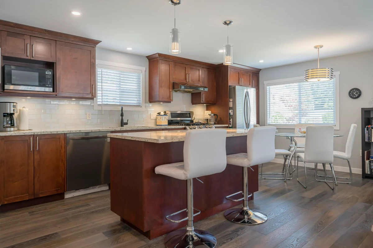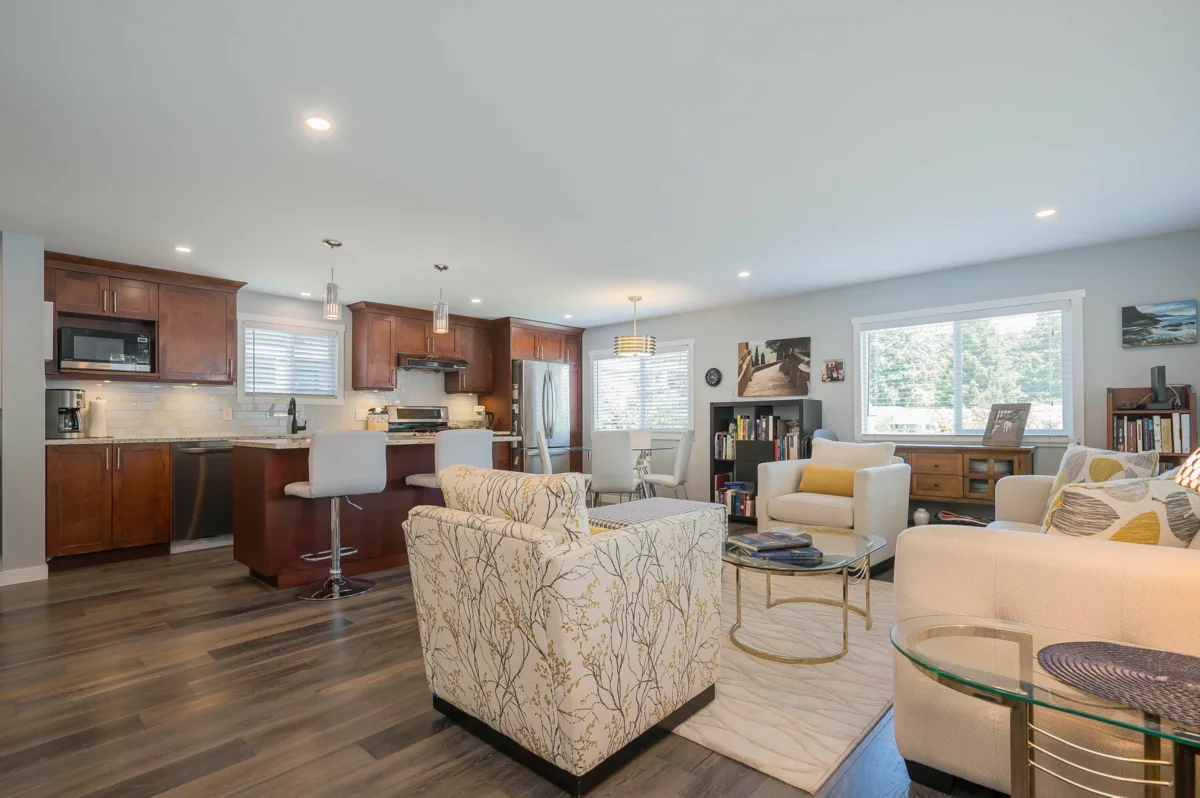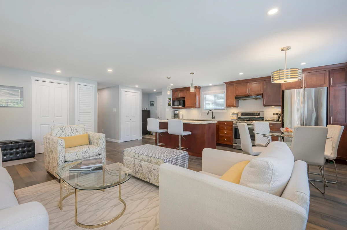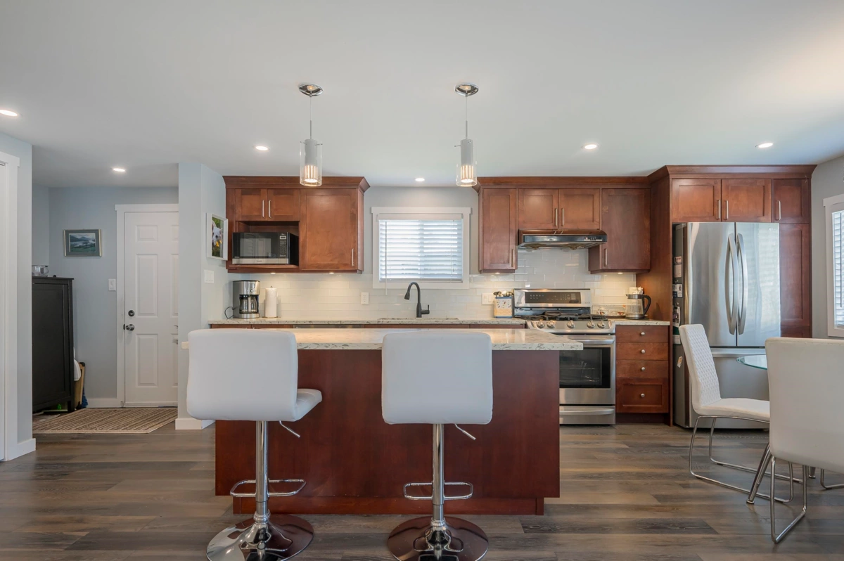 Breakaway Bays, a great community for retirees and families. This renovated home is nestled in a peaceful cul-de-sac steps to the Clubhouse and outdoor heated pool. 2 bdrms, 2bths, spacious open concept living area with large island! Great space to entertain! Large covered sundeck, 7' X 7' new shed, fantastic amenities, including an outdoor heated pool, activity hall for socials, green spaces for relaxation and recreation. With no age restrictions and a welcoming 2 pet policy (Max height 17” at withers) everyone can feel at home here. just a short 5-minute drive to the beach, major shopping centers, and the U.S. border. Recent updates in the last 6 years: furnace/fridge/gas stove/dishwasher. 2025 Updates - New Hot Water tank & Silver Label, Electricity is included in the pad rent!