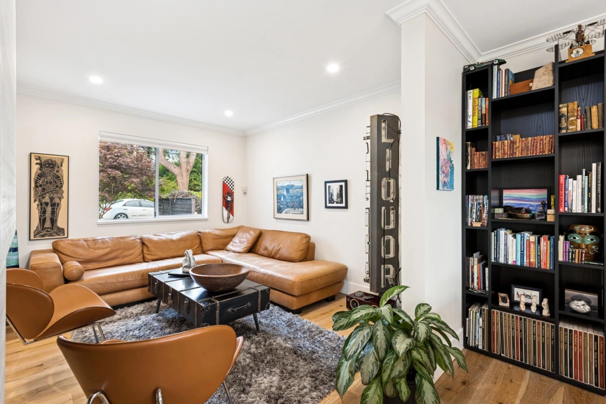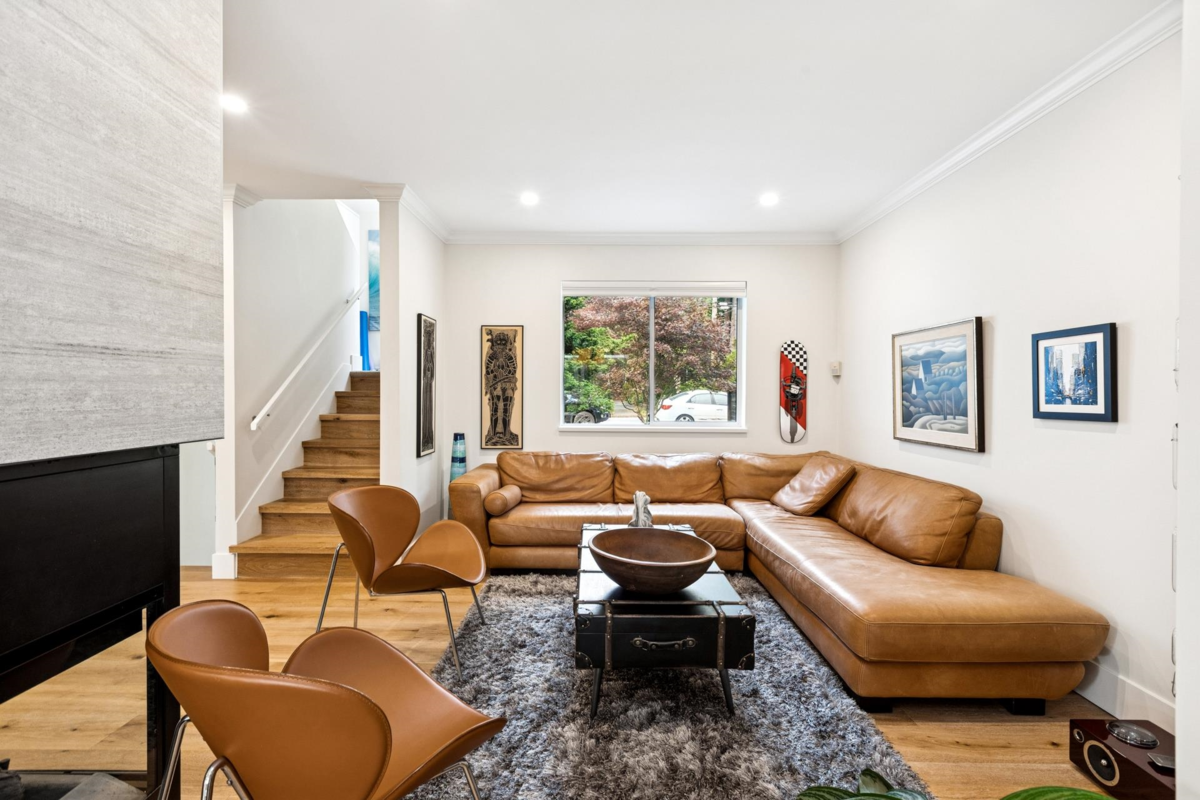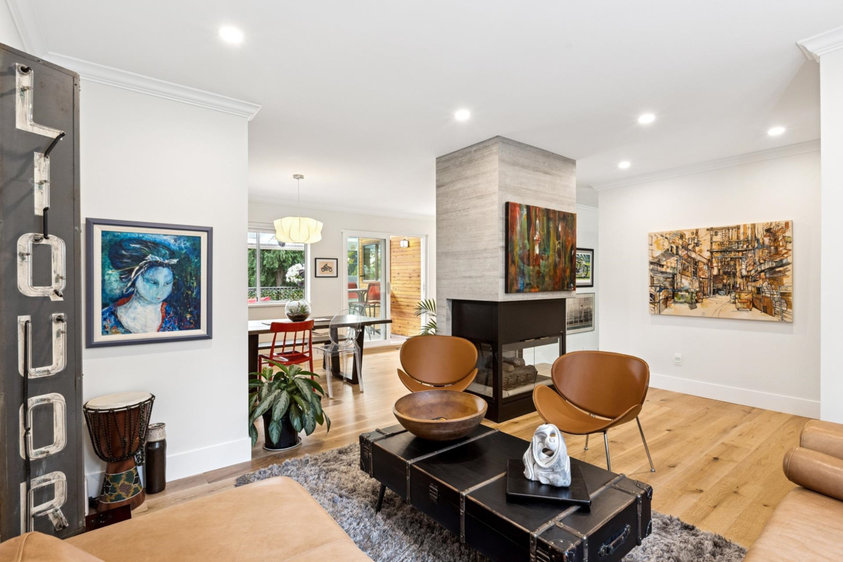 Renovated 4-bed, 4-bath contemporary home on a quiet Central Lonsdale cul-de-sac. The main floor features a gas fireplace living room, large dining area, & redesigned kitchen w/ sleek white cabinetry, quartz counters, S/S appliances, & peninsula. Sliding doors open to a 200+ sq/ft glass-covered deck for year-round use. A family/flex room adds versatility. Upstairs: 3 bdrms including a primary with 2 walk-in closets and 4-piece ensuite. Mid-level offers laundry & open flex space; lower level includes 4th bdrm (great for guests or older family), media room, & double garage access. Extensive 2018 reno's plus recent updates. Outdoor highlights include a terraced backyard, level driveway, & recently improved front landscaping. Steps to Carson Graham Sec, Mahon Park, shops, & Lonsdale amenities.