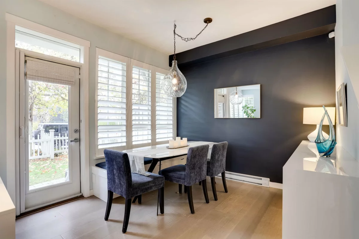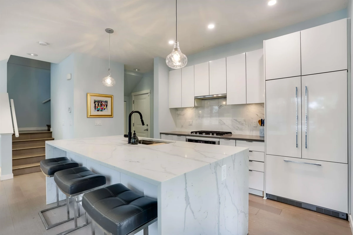 Southwest-corner, two-storey Charterhouse townhome with over 2,000 sq. ft. of fully fenced, irrigated yard plus 300 sq. ft. of covered patio for year-round use. The main level offers 9-ft ceilings and an open layout. The updated kitchen features an enlarged quartz island with waterfall edges, integrated fridge and dishwasher, and a five-burner gas cooktop. Engineered hardwood and California shutters run throughout, and the dining area includes a built-in banquette with storage. Upstairs are three bedrooms and a landing suitable for an office. The primary has 10'6 ceilings and a five-piece ensuite, with two additional well-sized bedrooms. Extra-wide side-by-side garage adds convenience. Located beside the Links at Hampton Cove and full access to The Hampton Club.