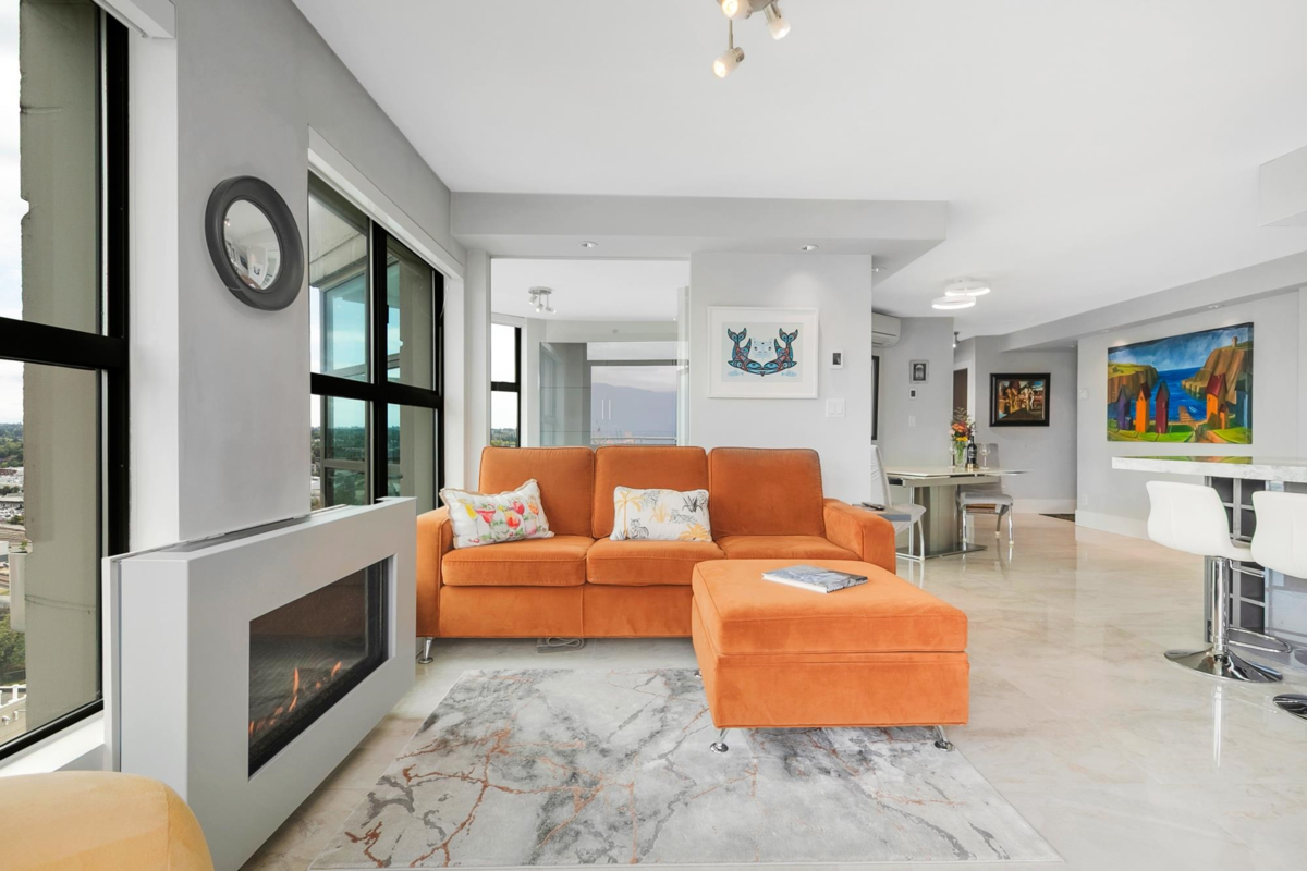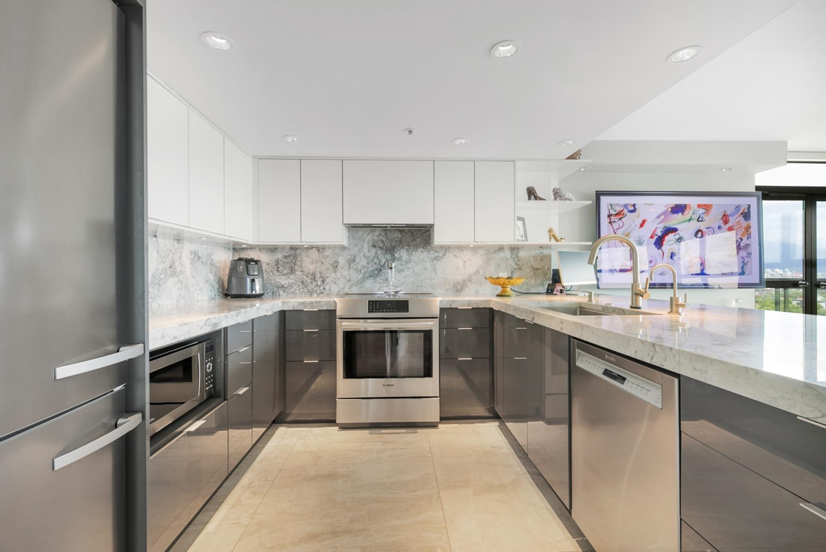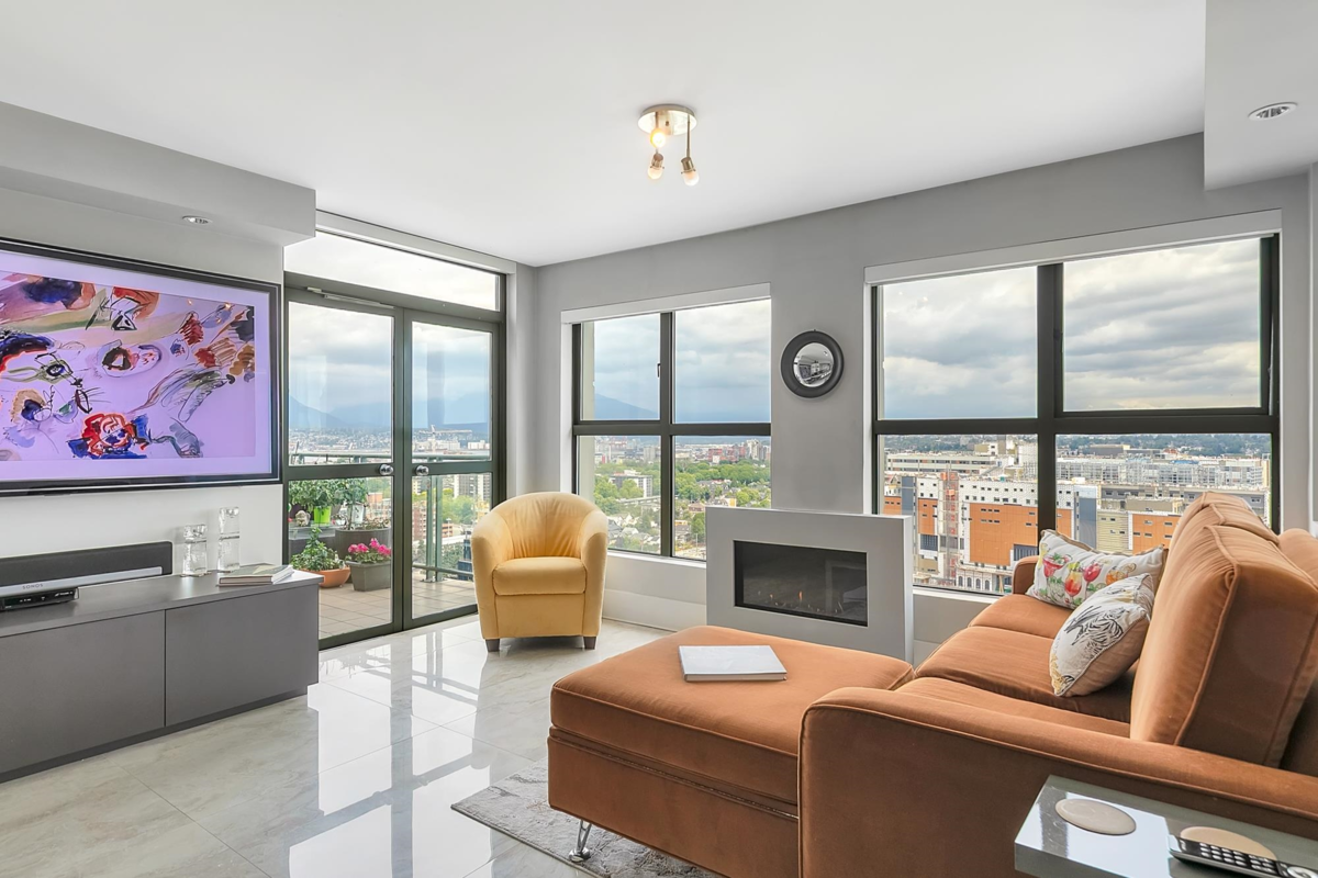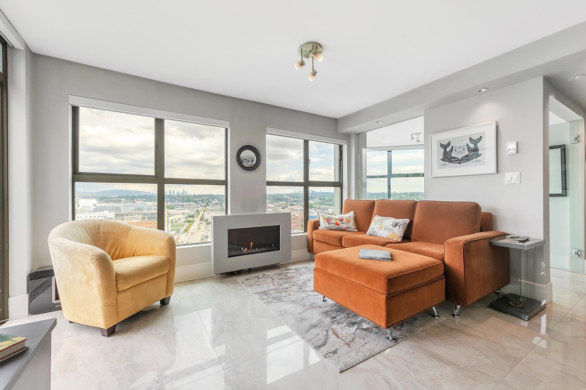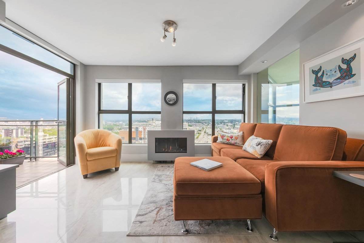 Enjoy expansive 180 degree views of Vancouver's skyline from the stunning North Shore mountains to bright Burnaby. This beautifully renovated 2 bed, 2 bath condo offers modern touches & style that feel brand new like AC/heat pump & in-floor heating throughout. A sleek induction cooktop, stunning countertops plus high-end Miele, Bosch appliances elevate the modern kitchen with open concept to living room with gas fireplace & north-side patio. The large primary with WIC, & luxurious marble bathroom, opens to the second sun soaked south-patio. Just a steps to Science world, skytrain, & Olympic Village where shops, cafes, restaurants, & breweries await. Built by Bosa, The National has many upgrades over the years & includes 2 parking (EV), storage, indoor pool, gym & sauna. Call now!
