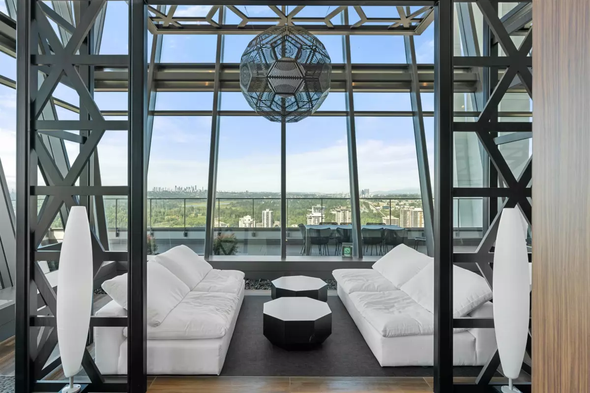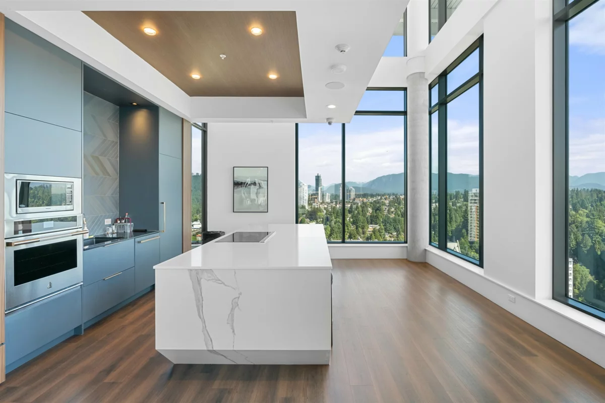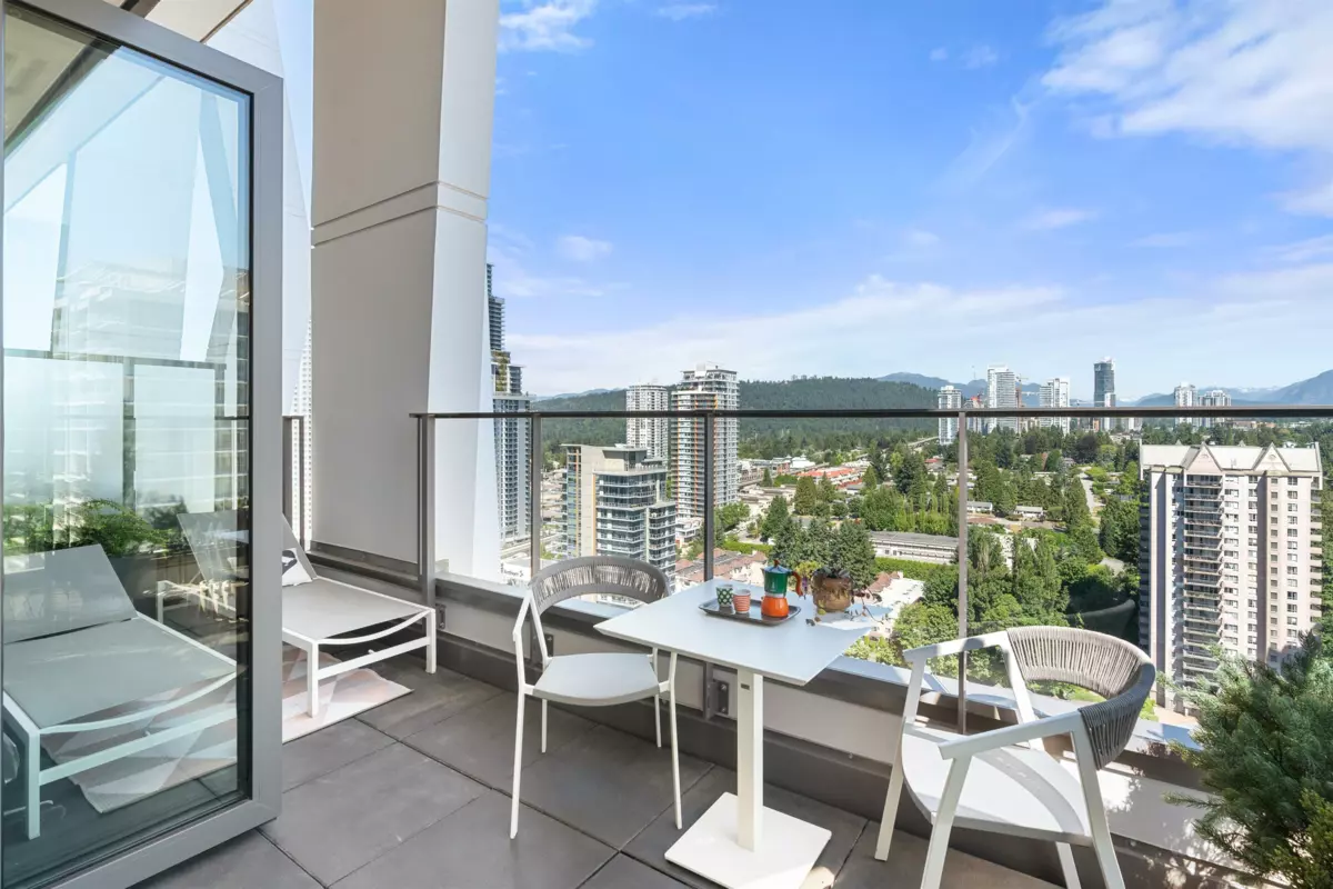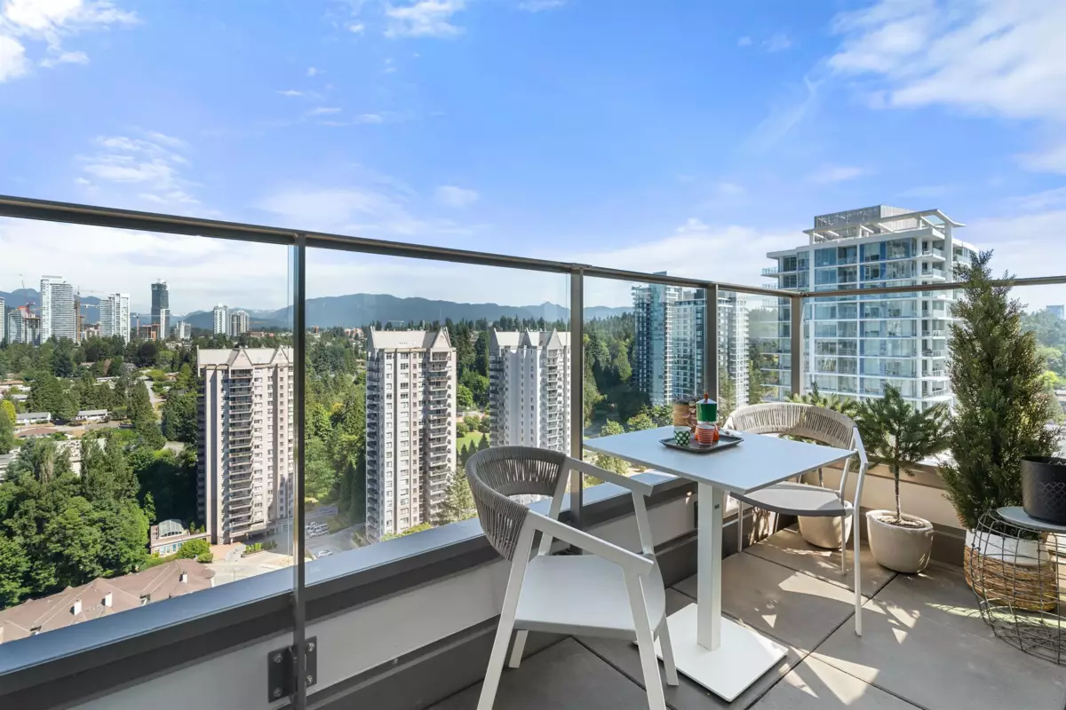 **EXQUISITE NEW 2-LEVEL 1220 sq ft Skyhomes! Stunning panoramic views of North Shore Mountains & Mount Baker! Luxurious features throughout! Modern kitchen: 2 Blomberg fridges, Miele wall oven & 5 burner gas cooktop, quartz counters, porcelain backsplash + ample storage. Sun-filled Master, walk-in closet & beautiful ensuite, 2nd bdrm, full bthrm + 2nd storey entry. Overheight ceilings, A/C, GLASS FOLDING WALL SYSTEM to terrace w/ gas hook up. Amenities: gym, pool, hot tub, sauna, outdoor BBQ & firepit. Penthouse: Zen garden, games rm, lounge, kitchen & dining, all with panoramic views! 2 parking, side-by-side, & 1 locker. Walk to Skytrain & Lougheed Town Centre.