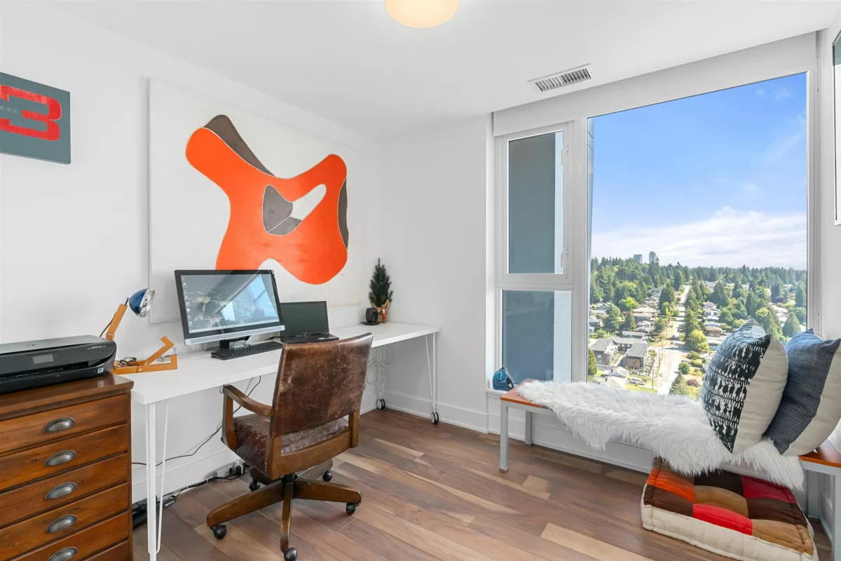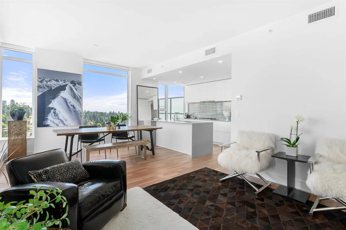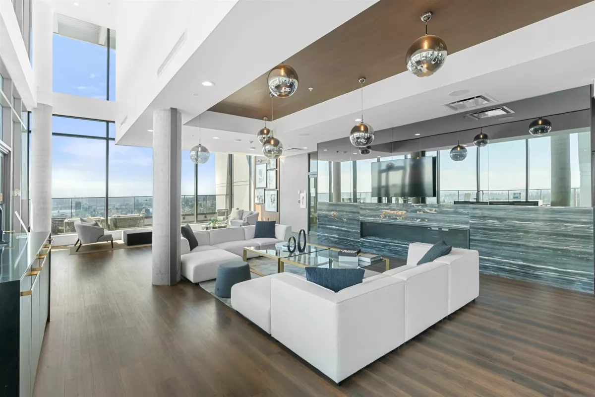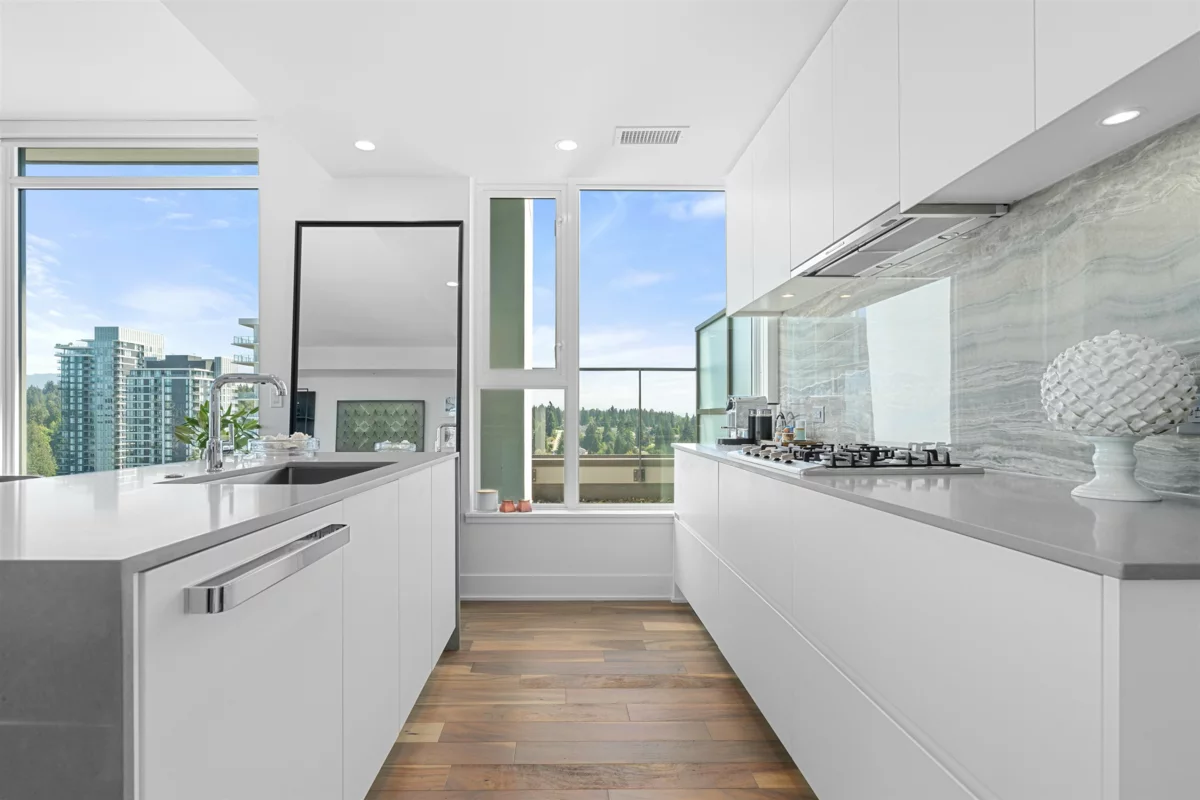 **EXQUISITE NEW 2-LEVEL 1220 sq ft Skyhomes! Stunning panoramic views of North Shore Mountains & Mount Baker! Luxurious features throughout! Modern kitchen: 2 Blomberg fridges, Miele wall oven & 5 burner gas cooktop, quartz counters, porcelain backsplash + ample storage. Sun-filled Master, walk-in closet & beautiful ensuite, 2nd bdrm, full bthrm + 2nd storey entry. Overheight ceilings, A/C, GLASS FOLDING WALL SYSTEM to terrace w/ gas hook up. Amenities: gym, pool, hot tub, sauna, outdoor BBQ & firepit. Penthouse: Zen garden, games rm, lounge, kitchen & dining, all with panoramic views! 2 parking, side-by-side, & 1 locker. Walk to Skytrain & Lougheed Town Centre.