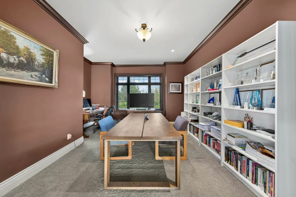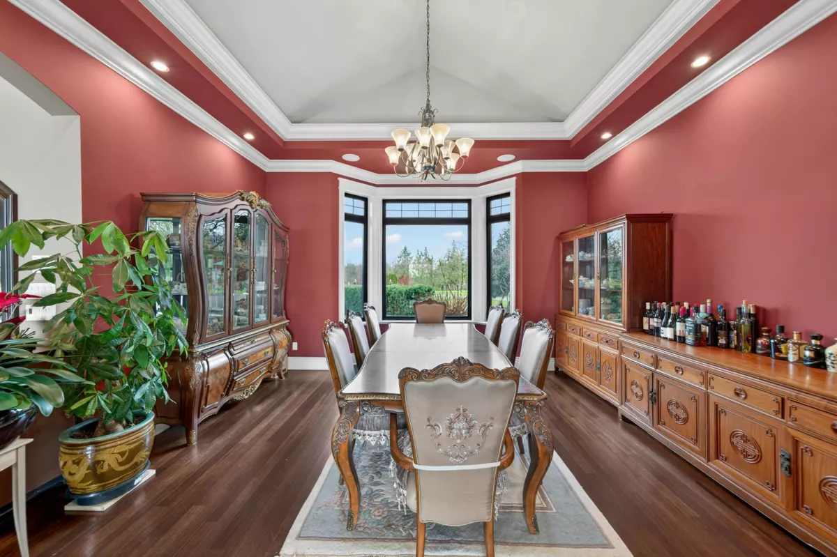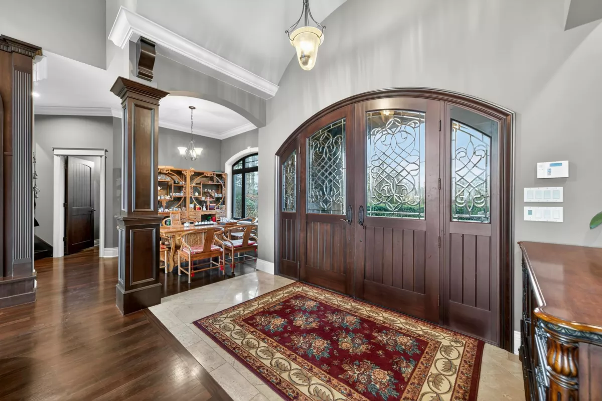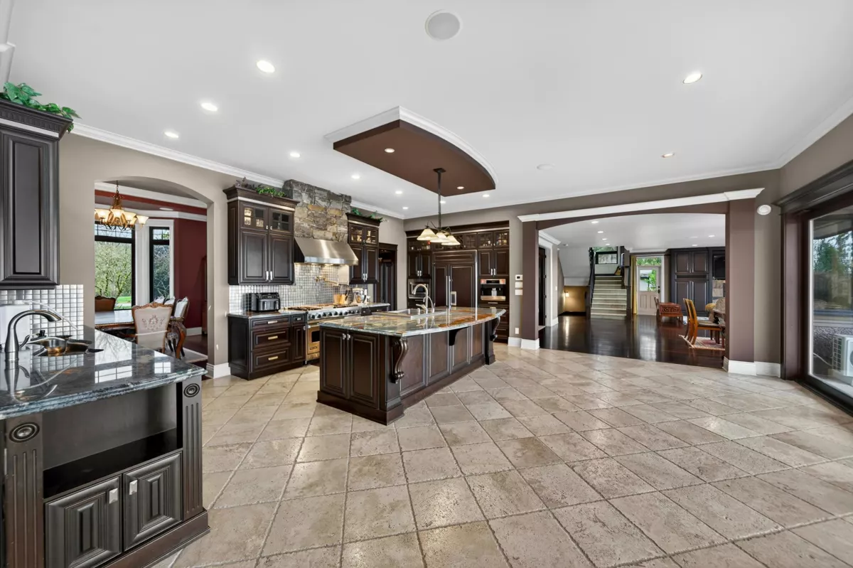 Set on approximately 2.5 acres with panoramic views of the Fraser River and surrounding mountains, this French-inspired estate offers over 7,300 sq.ft. of refined living. The home features four bedrooms, a den, and six bathrooms. Main living areas flow into a gourmet kitchen and butler's pantry with Spanish tile flooring, Italian blue marble countertops, a Viking professional six-burner gas cooktop with dual ovens, Sub-Zero refrigerator, and Miele dishwasher and coffee system. The main-floor primary suite offers walk-out access to the pool and hot tub, a walk-in closet, and spa-inspired ensuite. A triple garage with high ceilings includes a finished open space above. Manicured grounds feature a terrace, pool, outdoor kitchen, covered lounge, and built-in BBQ - ideal for entertaining.