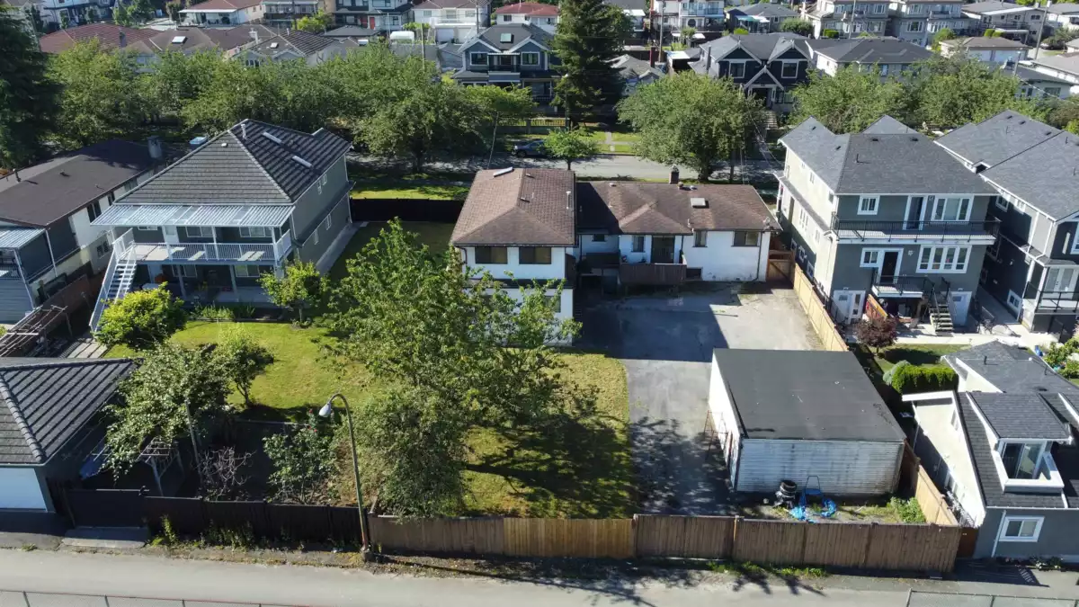 LIVE OR BUILD. Excellent, quiet, central residential 72 x 143 lot (10, 378 sf) suitable for multi-unit development. Subdividable into two 36'x143'lots. Level lot on beautiful tree-lined street with both front and back lane access in Collingwood/Victoria area. First time to market in 50 years. Great holding investment and perfect for an extended family - large home is in solid condition. Main house has 4 bedrooms, 2 baths and full basement. Additional separate entry townhome (1559 sf) has 3 bedrooms, den and 2 baths. Bright, southern exposure with clear views to mountain from the kitchen and back deck.
