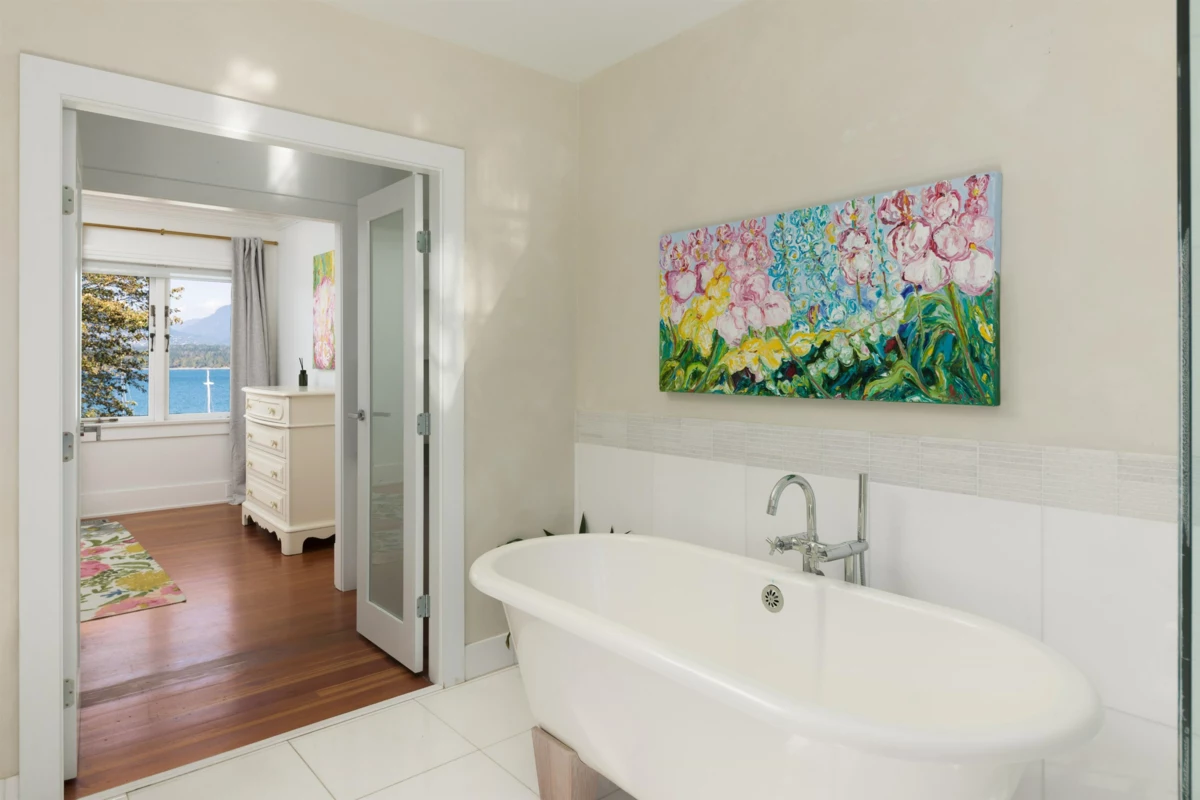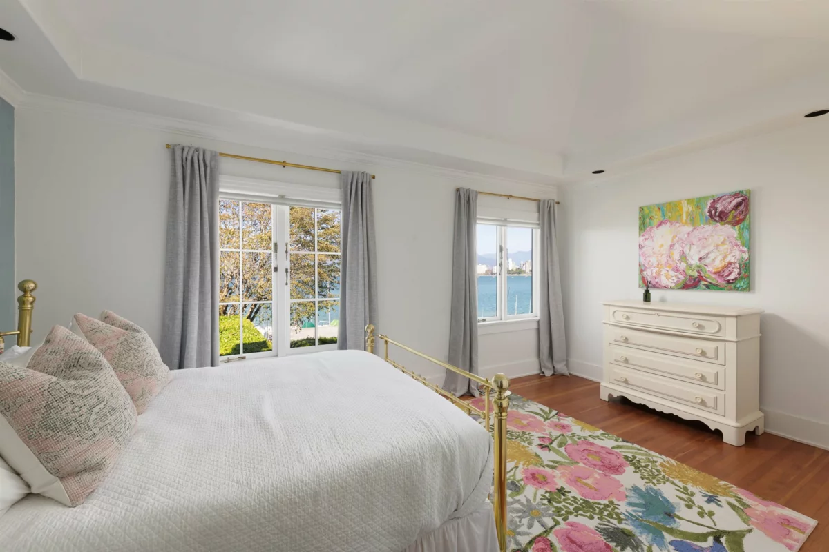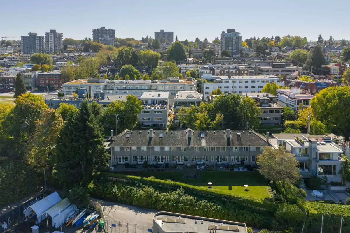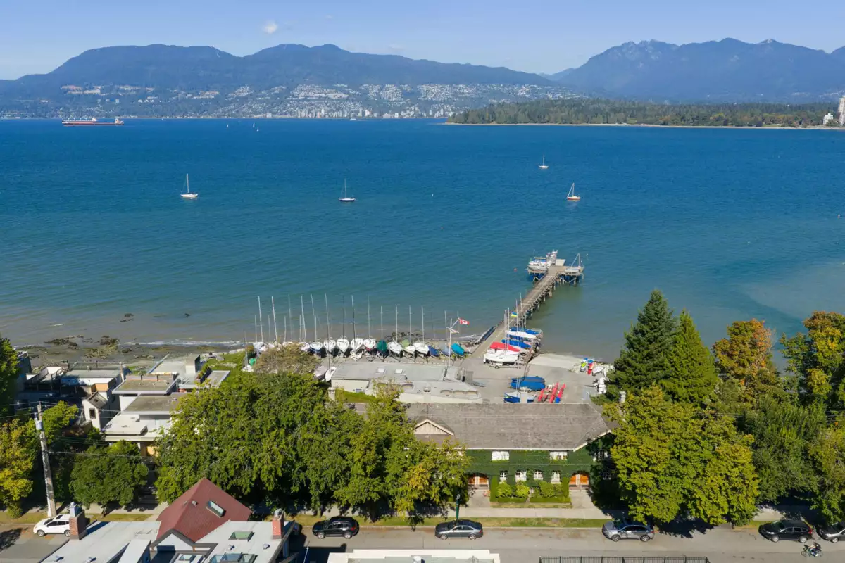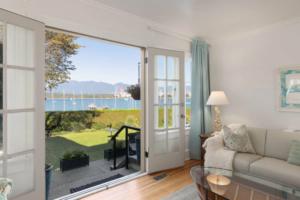 Iconic Waterfront Ivy Townhome on Lower Point Grey Road. One of only eight ivy-covered residences on this quiet, prestigious street, this rare corner home is surrounded by landscaped grounds with the beach and ocean just steps away. Extra windows frame expansive water views, the city skyline, the North Shore mountains, and sailboats drifting past. The kitchen, wrapped in windows and centered on a generous island, flows into bright living spaces with hardwood floors, a gas fireplace, and French doors opening to a patio and gardens. Upstairs, the primary retreat offers a walk-in closet and spa bath with freestanding tub. The lower level adds flexible space for bedrooms, office, or recreation, with renovated bath, laundry, and storage. EV parking and bike storage included.