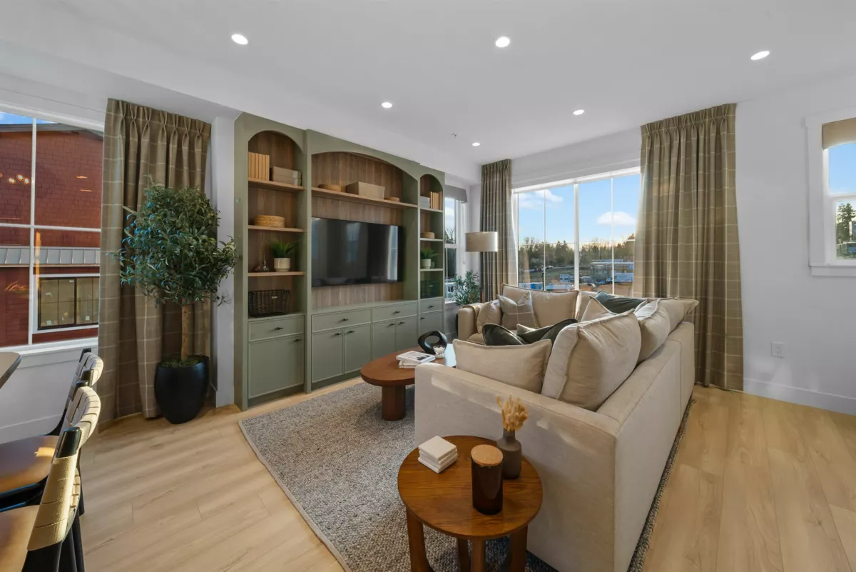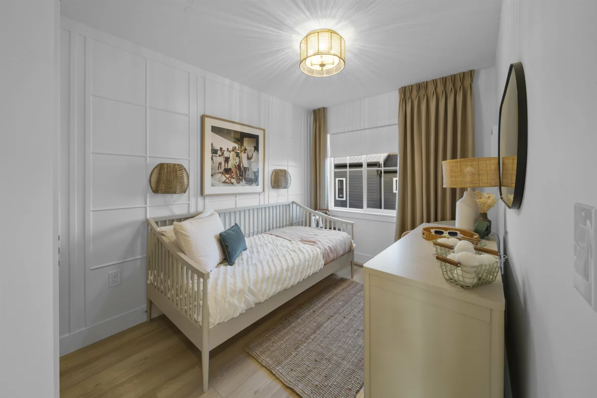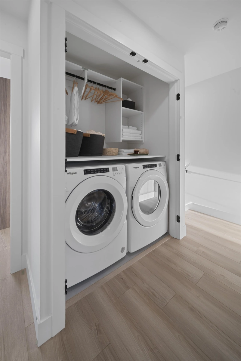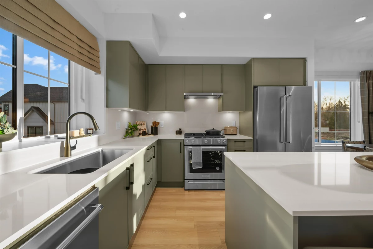 MOVE-IN READY at LATIMER WALK by award-winning Zenterra Developments. This bright, modern 3-bedroom home features a stylish kitchen with a full KitchenAid appliance package, ideal for everyday living and entertaining. Enjoy laminate flooring throughout, air conditioning, forced-air gas heating, and hot water on demand for year-round comfort. This south/east/north-facing corner home backs onto a 5m greenbelt and includes a spacious fenced backyard. Additional features include a BBQ gas hookup, garburator, and built-in wood closet organizers. Only 5 homes remain. Show home open Saturday–Thursday, 12–5 PM.