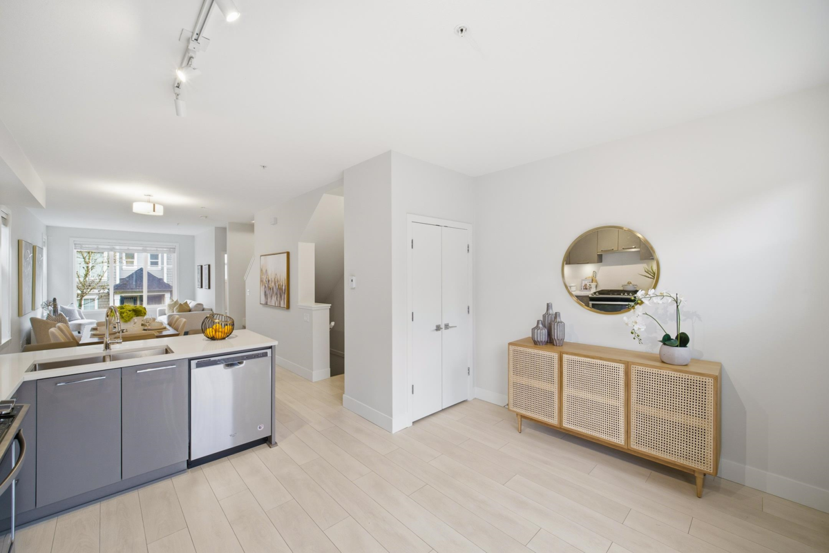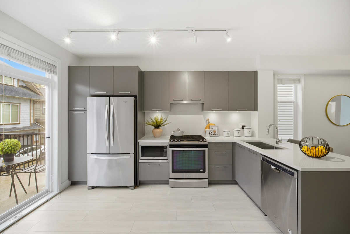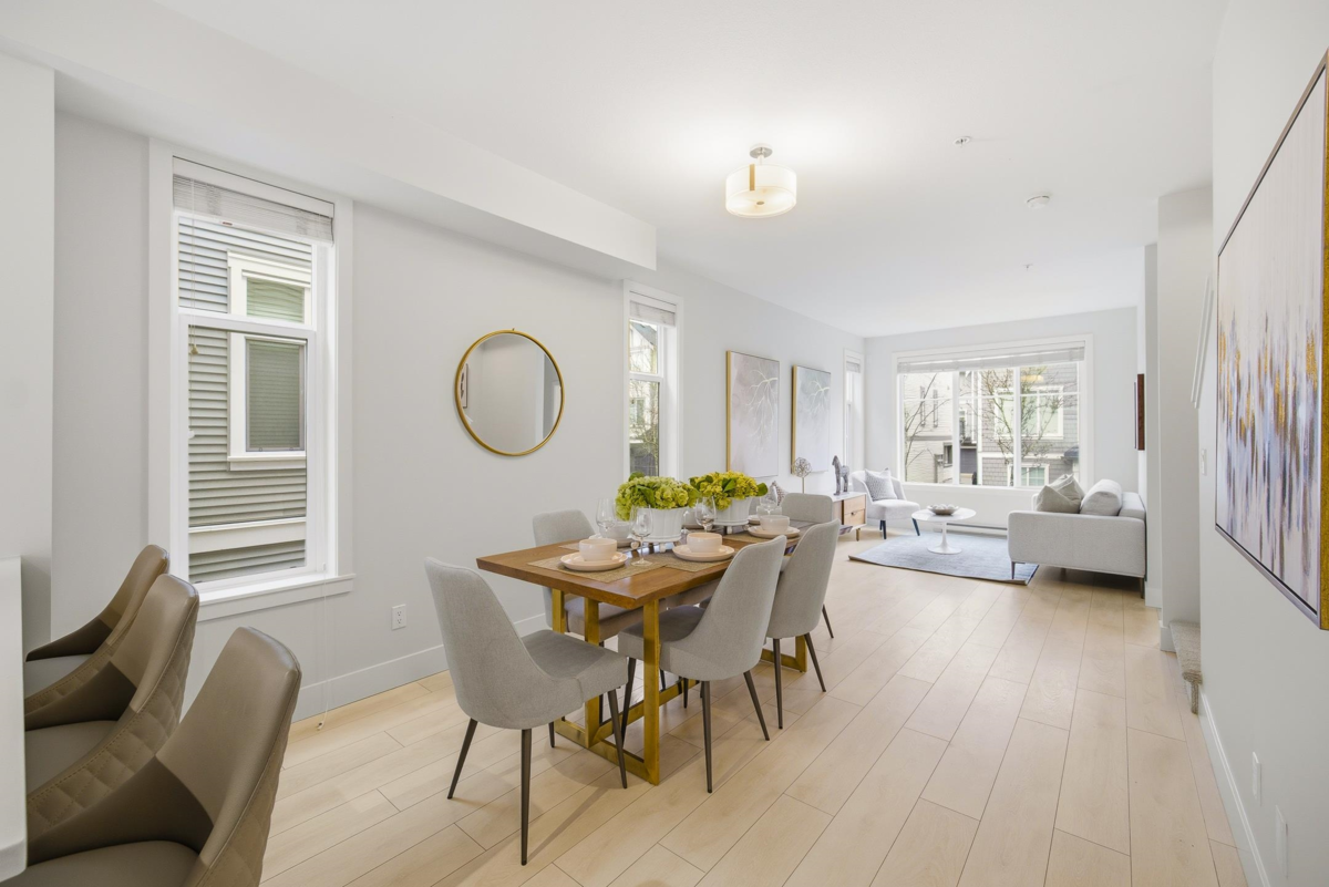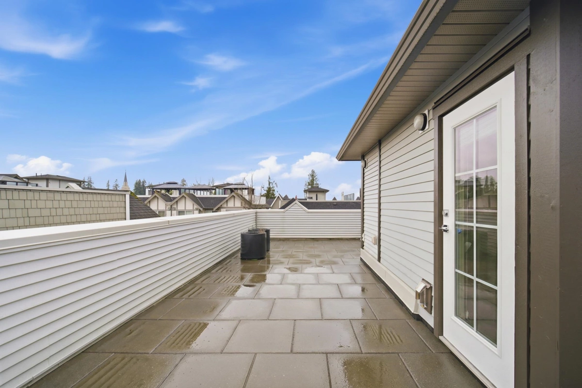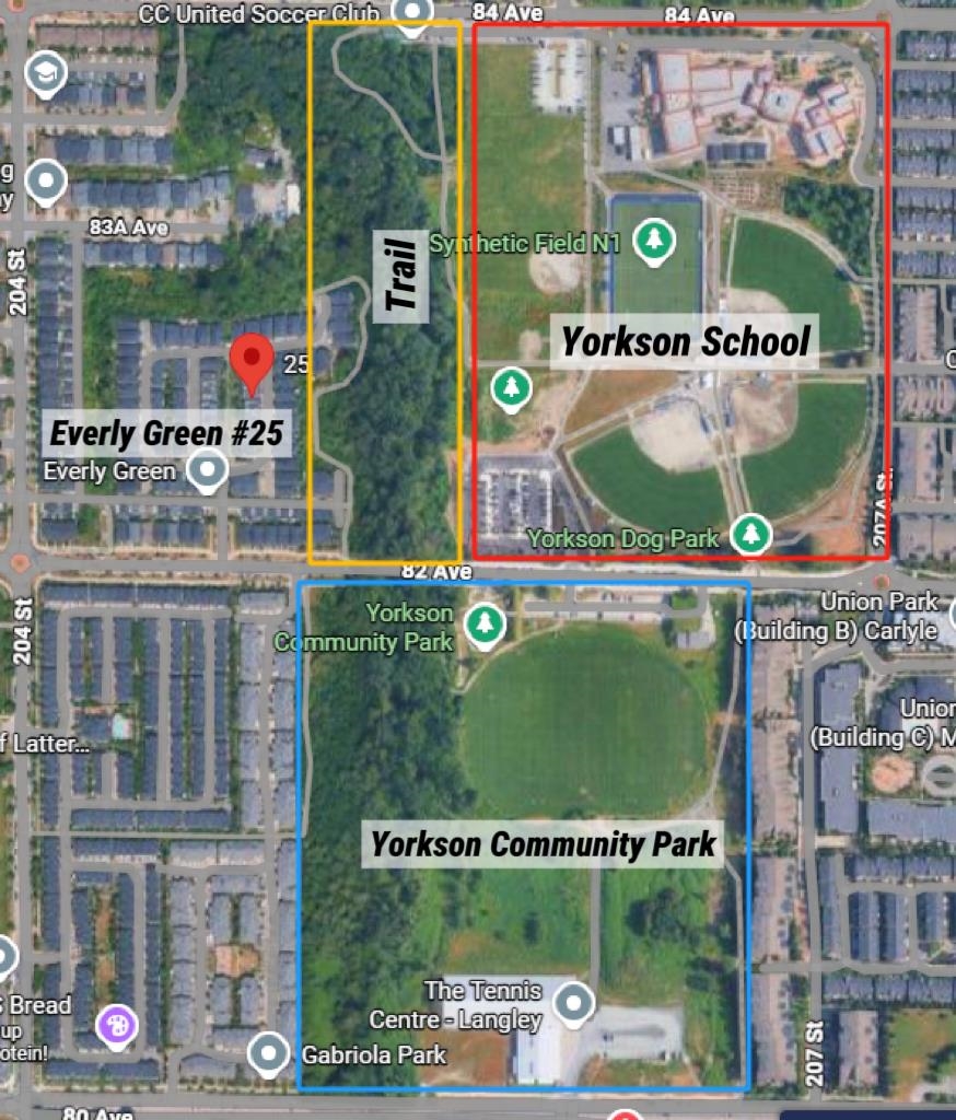 Welcome to Everly Green, a highly sought-after townhome community by StreetSide Development in Willoughby Heights. This bright end unit offers 1,485 sq ft of thoughtfully designed living space with 3 bedrooms + den and 2.5 bathrooms. Corner exposure, oversized windows, and 9-ft ceilings fill the home with natural light. The open-concept main floor features a modern kitchen and a versatile den, perfect for a home office. Enjoy a fenced west-facing front yard with a playground just steps away, plus a balcony and a private rooftop patio ideal for BBQs and entertaining. The east-facing garage overlooks quiet single-family-style homes for added privacy. Steps from Yorkson Creek Middle School, Yorkson Community Park, shopping, Carvolth Bus Exchange, and Highway 1. Open House: Jan 17 & 18, 2–4 PM