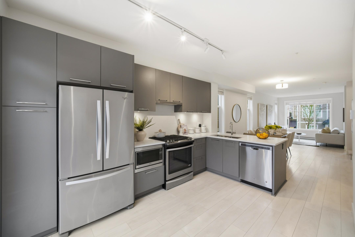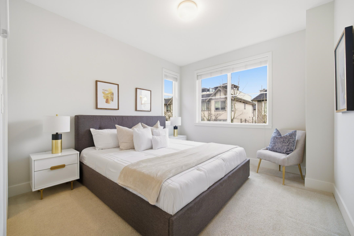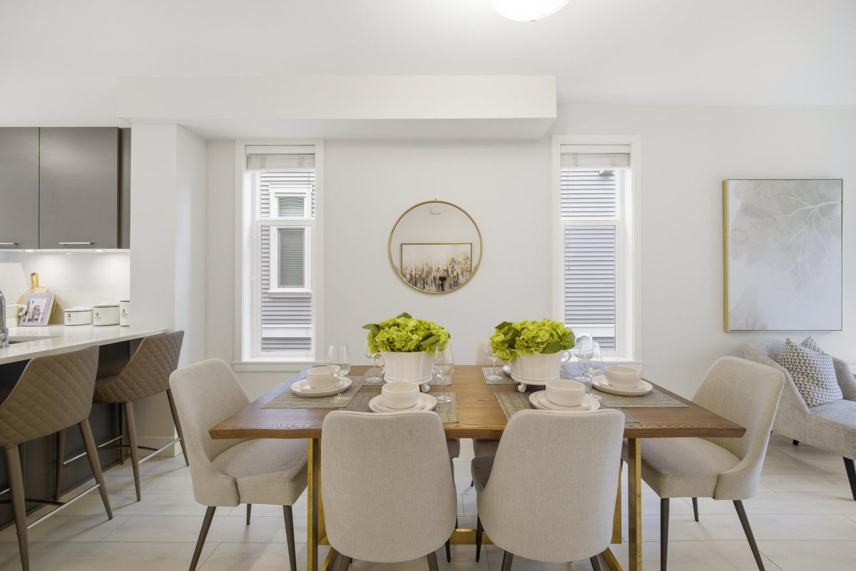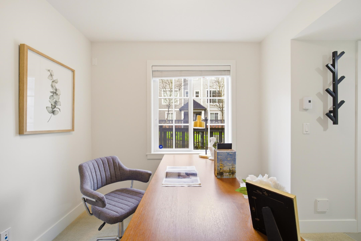 Welcome to Everly Green, a highly sought-after townhome community by StreetSide Development in Willoughby Heights. This bright end unit offers 1,485 sq ft of thoughtfully designed living space with 3 bedrooms + den and 2.5 bathrooms. Corner exposure, oversized windows, and 9-ft ceilings fill the home with natural light. The open-concept main floor features a modern kitchen and a versatile den, perfect for a home office. Enjoy a fenced west-facing front yard with a playground just steps away, plus a balcony and a private rooftop patio ideal for BBQs and entertaining. The east-facing garage overlooks quiet single-family-style homes for added privacy. Steps from Yorkson Creek Middle School, Yorkson Community Park, shopping, Carvolth Bus Exchange, and Highway 1. Open House: Jan 17 & 18, 2–4 PM