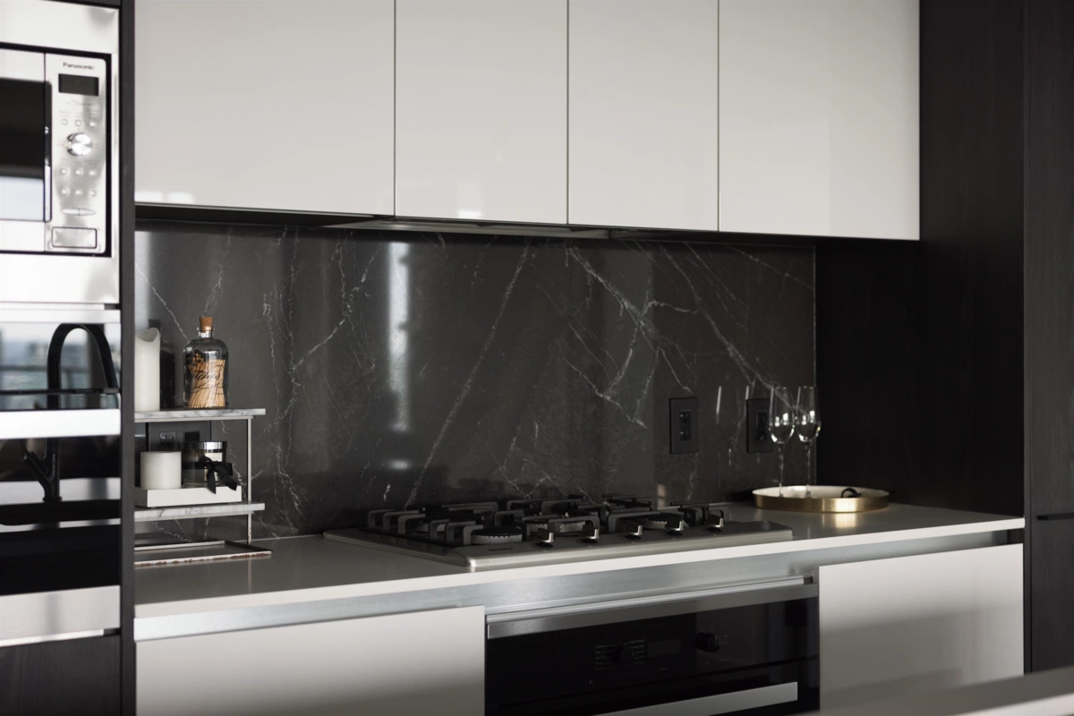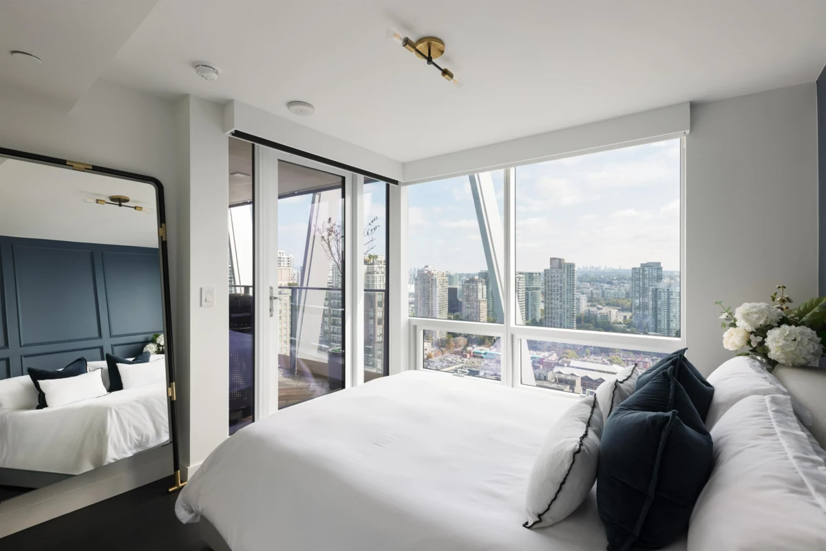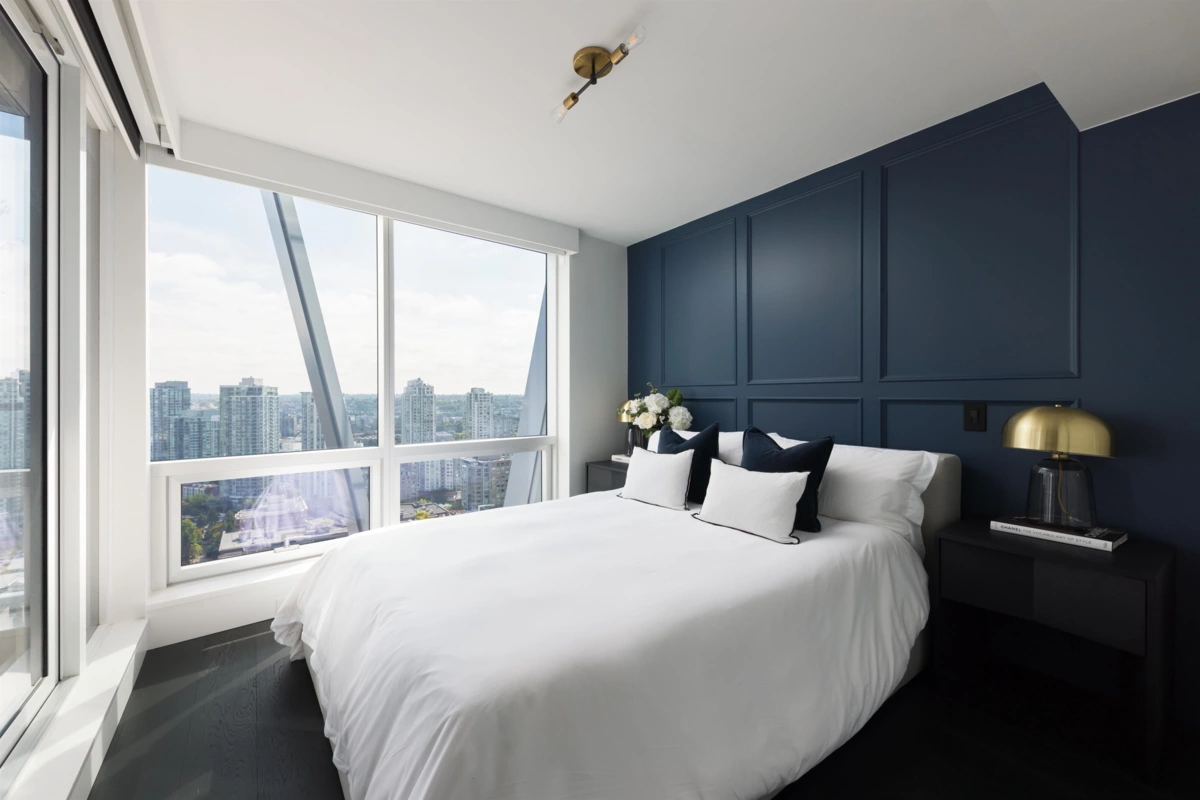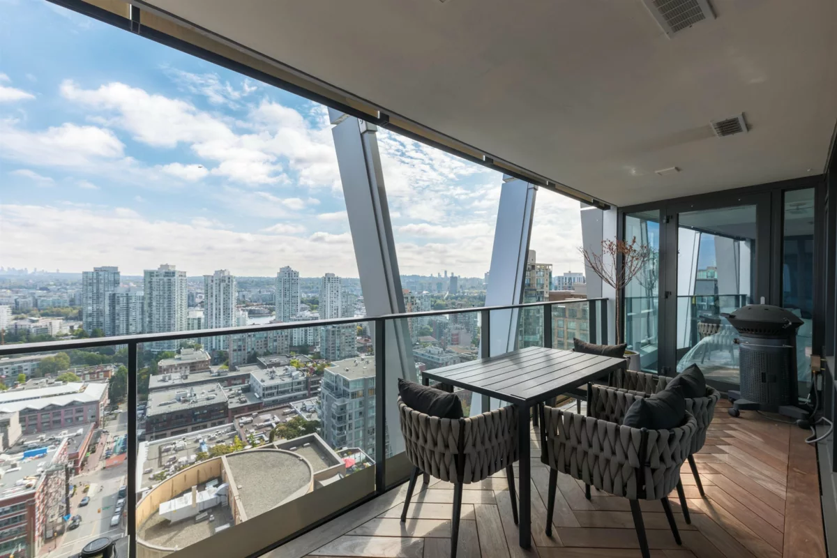 Elevated & updated corner home at 8X on the Park with panoramic views of False Creek, city, and mountains. This refined 3 bed, 2 bath residence features a 10ft natural stone island, integrated Miele appliances, custom millwork, powered blinds, and floor-to-ceiling windows. The open plan flows to an oversized covered patio with herringbone wood decking. Elegant bedrooms, a reimagined walk-in closet, engineered hardwood, natural tile, & A/C throughout complete the home. Includes 2 side-by-side parking, storage, and bike locker. Enjoy world-class amenities: concierge, fitness centre, and rooftop oasis. A rare, turnkey offering in one of Vancouver's premier buildings.