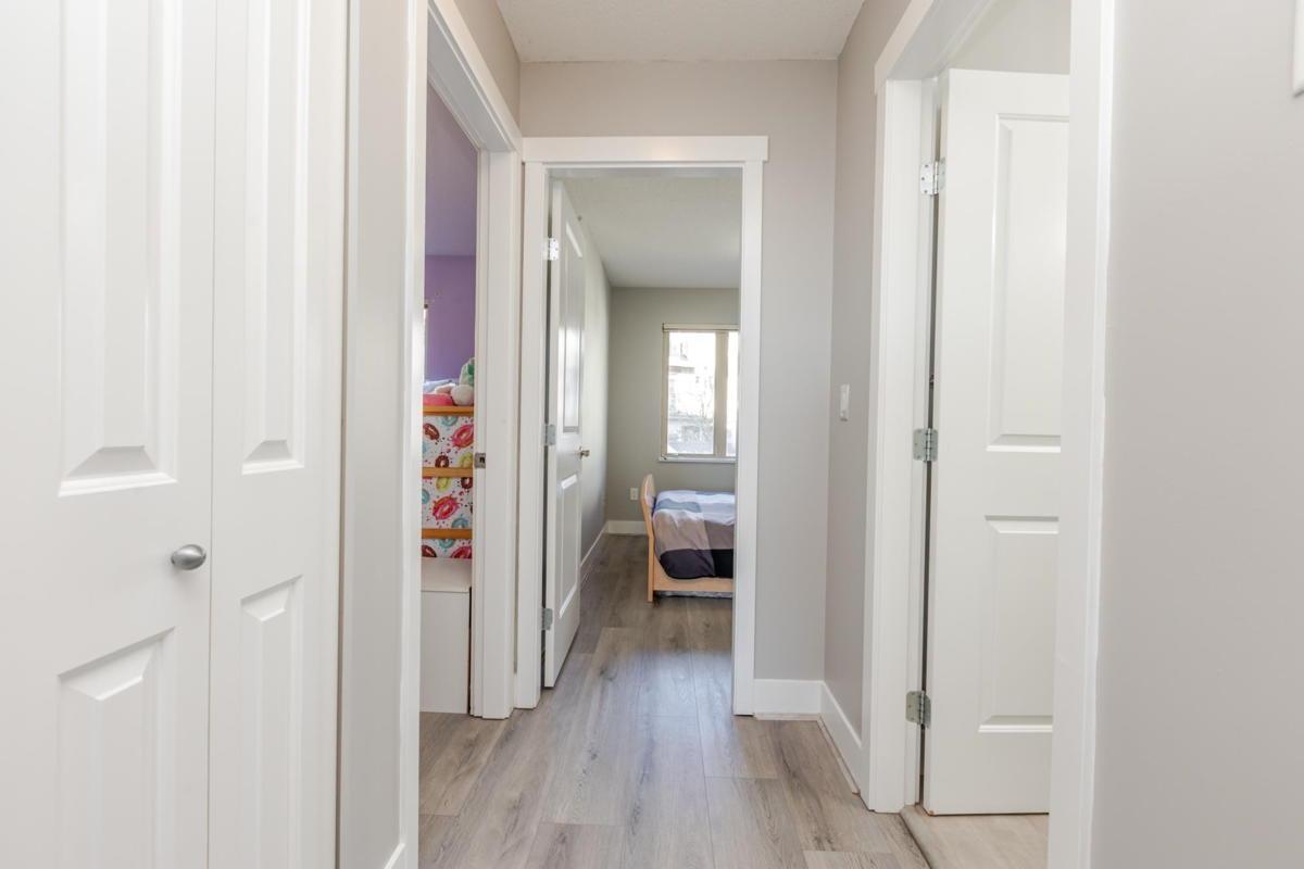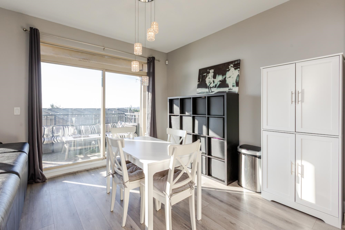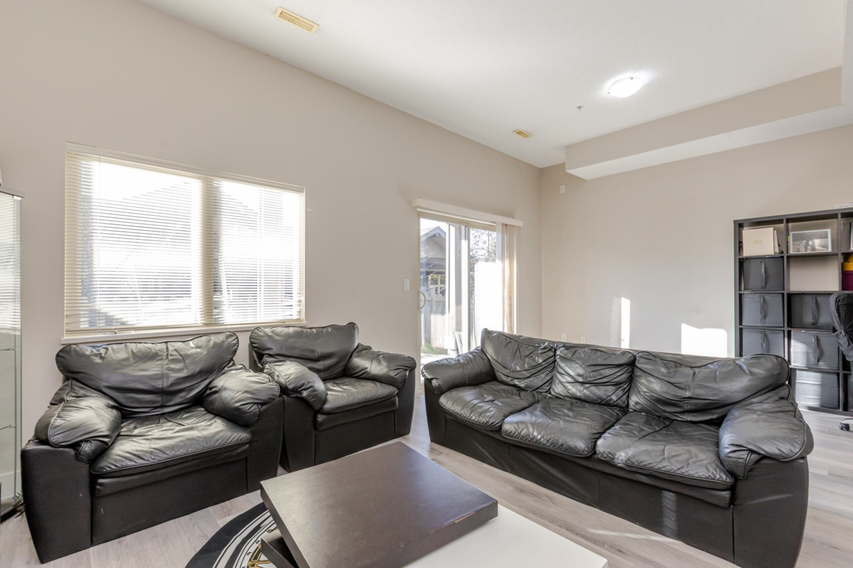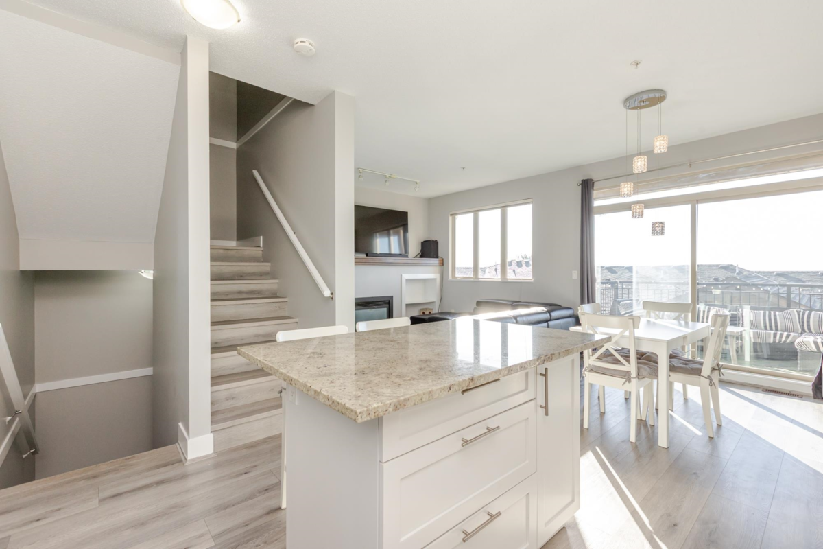Welcome to Sunpointe! This nearly 1,900 sq. ft. END UNIT townhouse truly checks all the boxes. The main floor features a gorgeous kitchen with white shaker cabinetry, granite countertops, & stainless steel appliances, complemented by modern vinyl flooring + a convenient powder room and patio off the dining room. Upstairs offers a spacious primary bedroom with a five-piece ensuite, a full bathroom, and two additional well-sized bedrooms. The basement boasts a large media room (could be a 4th bedroom), another full bath, laundry room, storage and a covered patio. Stunning panoramic views from the main floor and primary bedroom finish this perfect place to call home. BONUS: New vinyl flooring and paint throughout! Close to schools, shops, and transit, this home is move-in ready!