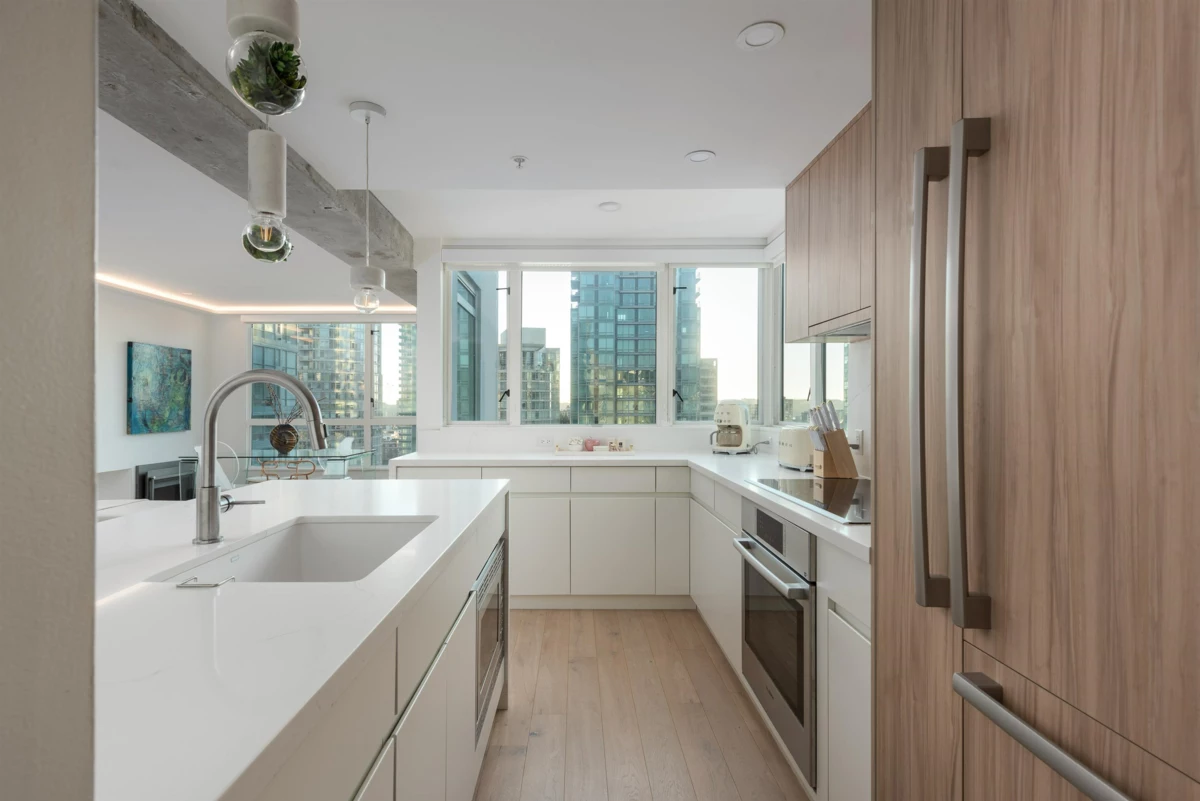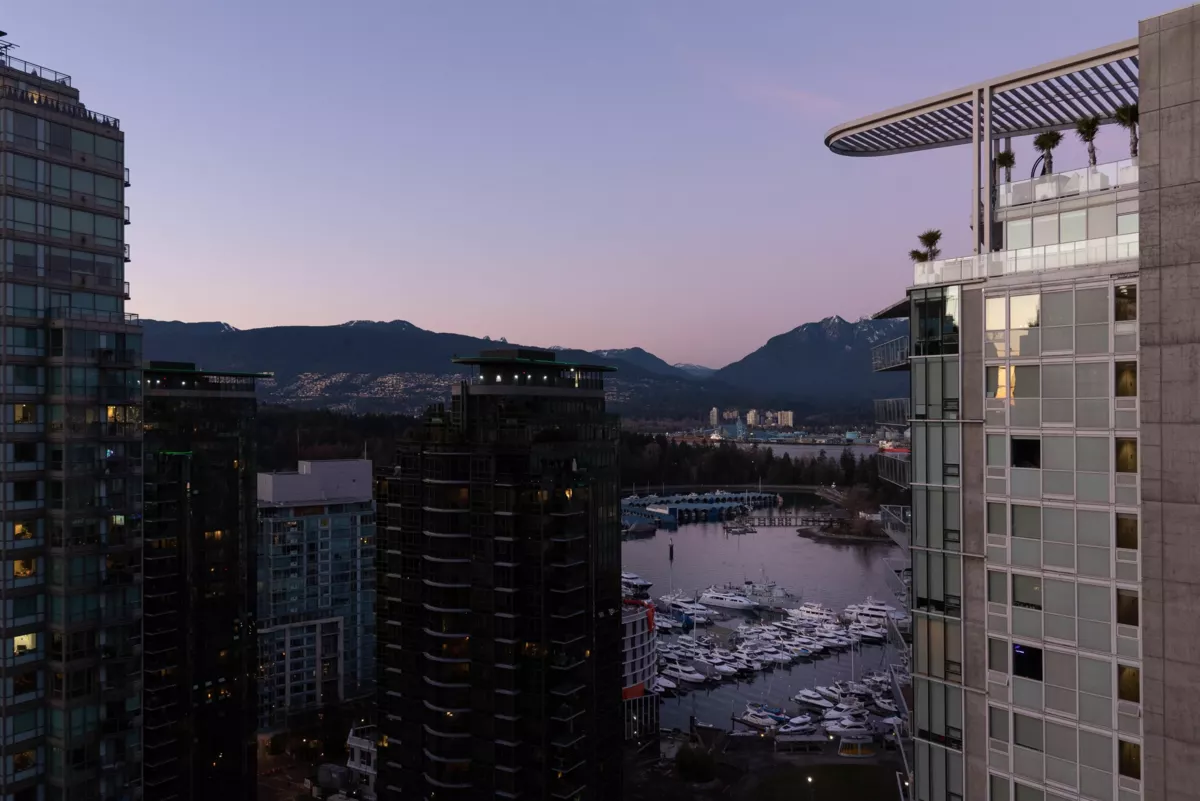 Welcome to Pointe Claire, a luxury high-rise nestled in the heart of Coal Harbour. No detail has been overlooked in this fully renovated, 3-bedroom, corner suite. This home features a thoughtfully designed open-concept layout, perfect for living, dining, and entertaining. The professional renovation includes hardwood flooring, brand-new stainless steel appliances, marble/quartz countertops, energy-efficient electric baseboards, modern lighting fixtures and more. Spanning nearly 1200 SOFT, enjoy breathtaking views from your floor-to-ceiling windows of the marina, city and sunsets. Just steps from the seawall, Stanley Park, and top amenities. Book your private viewing today!