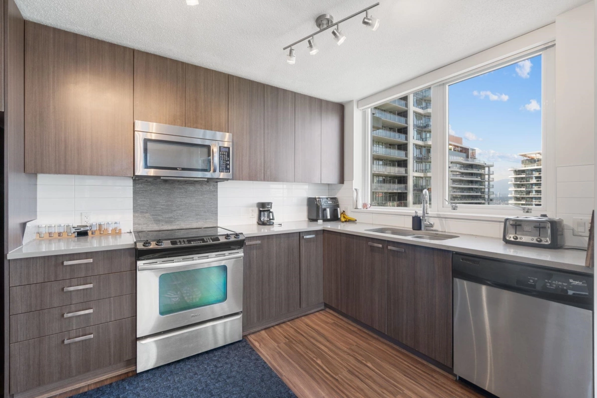 ULTRA Tower -- Live in the Heart of Surrey's Vibrant City Centre! Just steps from the SkyTrain, this bright and modern 1 Bed / 1 Bath corner unit offers 635 sqft of stylish urban living with breathtaking panoramic views of the mountains, Fraser River, and city skyline. Located in the sought-after ULTRA Tower, this home features floor-to-ceiling windows, sleek quartz countertops, premium laminate flooring, and high-end stainless steel appliances. Enjoy unmatched convenience with walking access to T&T Supermarket, Central City Mall, SFU, City Hall, restaurants, banks, and more. The building offers premium amenities including a fully equipped fitness centre and meeting room. 1 secure parking stall and storage locker included.