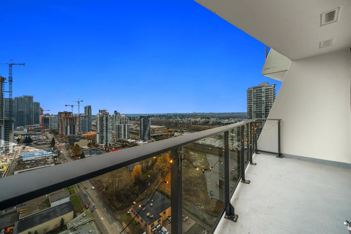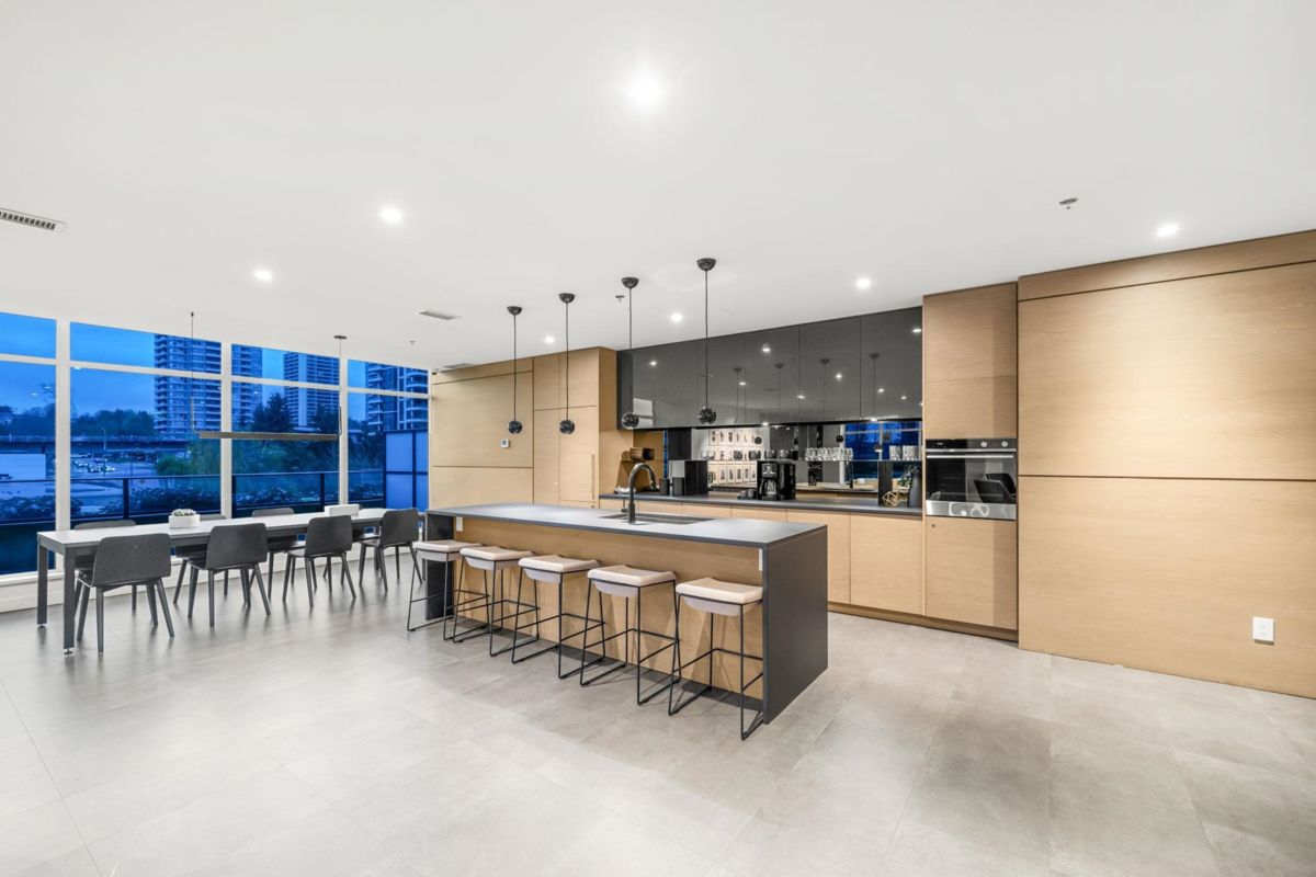 High floor one bedroom at Akimbo filled with natural light and open city views. Morning sun pours through the floor to ceiling windows and the balcony becomes a quiet spot to unwind above the city. The layout feels calm and efficient with high ceilings, AC, and a modern quartz kitchen that makes the home feel polished and new. The building adds a sense of ease with concierge service, a fitness centre, guest suite, and garden spaces. Brentwood Mall, SkyTrain, Whole Foods, and dining are a short walk away so daily life feels simple and connected. A private, modern space with a lifestyle that feels elevated and effortless.
