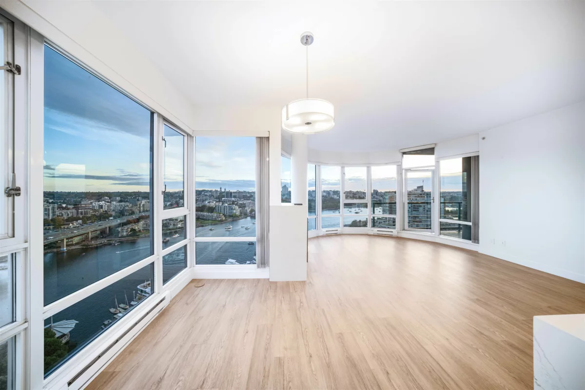 SUB PENTHOUSE Waterfront Panoramic views of the Ocean Marina,City & Mountain A fully renovated 3-bedroom with Office and Den/Eating area gorgeous with 9.3 foot ceilings, offering stunning views of False Creek, marinas, and the city from floor to ceiling windows This southeast-facing unit features an open-concept kitchen, luminous living room leading to an oversized balcony. Enjoy resort-like amenities and a 24-hour concierge. Your doorstep leads to Quayside Marina, the seawall, shops, and dining. This is luxury living at its best.
