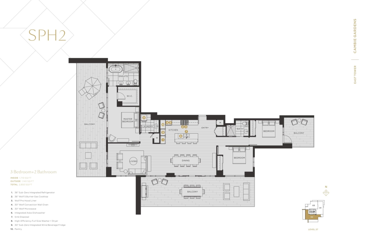 This South West facing 1705 SF spacious sub-penthouse Three-Bedroom home is located at Cambie Gardens, Onni Group's masterplanned community on Vancouver's westside. Lavishly finished w/ engineered HW flooring in bedrooms, heating & cooling system, automated lighting & sleek roller shades. A gourmet kitchen includes natural stone countertops, oversize waterfall island & premium Sub Zero + Wolf appliance package. Spa-inspired bathrooms boast marble countertops, Nuheat flooring & oversized mirrors w/ LED lighting. Bedrooms showcase walk-in-closets. Master ensuite includes 5-piece ensuite w/ double sinks, walk-in shower & soaker tub. Private double garage parking included.