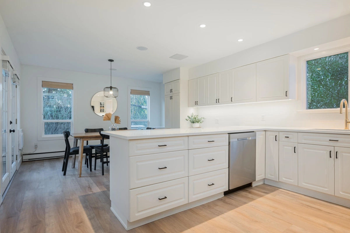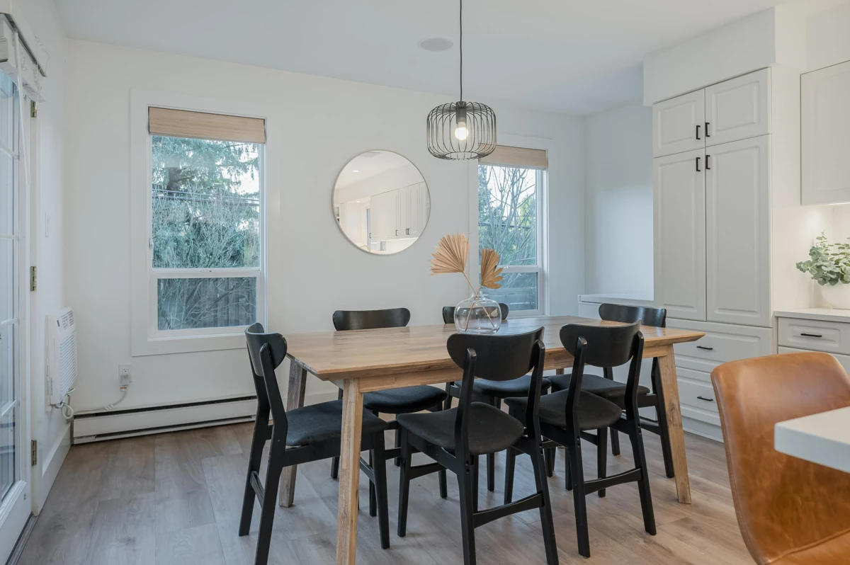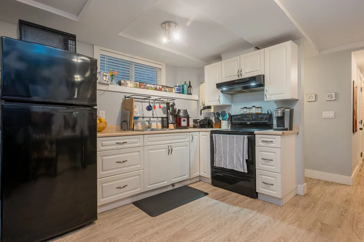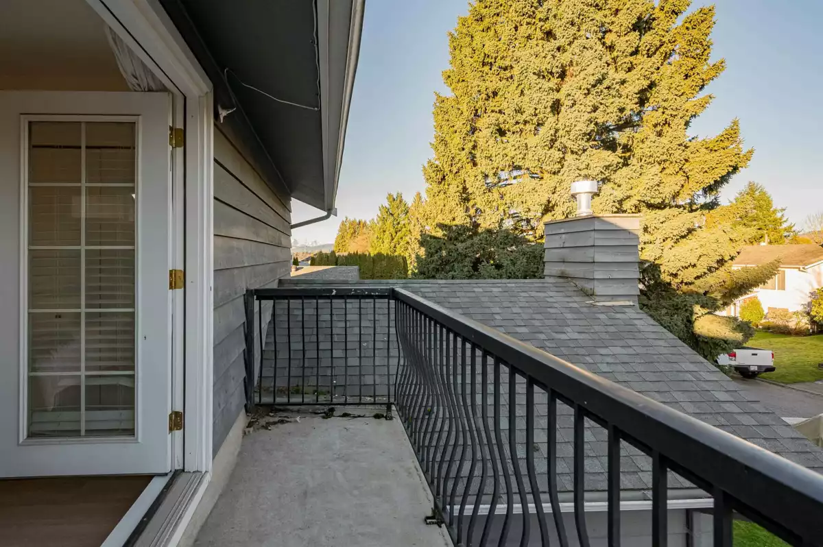 Beautifully updated home with a private-entry 1-bedroom suite on a quiet dead-end cul-de-sac. Bright, open kitchen/eating area offers a breakfast bar with quartz counters, ceramic tile backsplash, under-cabinet lighting, and French doors to a private backyard. Family room features large windows, cozy gas fireplace, vaulted ceiling with white-washed shiplap, and designer lighting. Updates include wide plank laminate floors, fresh designer paint, new lighting, and vinyl windows. Upstairs: 3 bedrooms, including a primary with his & hers closets and its own balcony. Fully fenced, manicured yard with a covered outdoor living space, firepit, and paving stone patio. Close to Terry Fox Elementary, parks, and historic downtown Abbotsford.