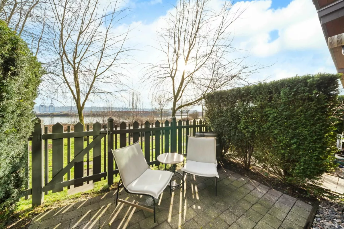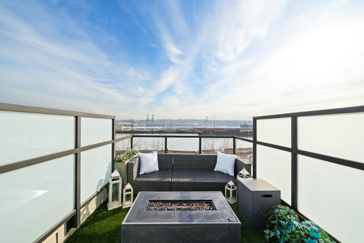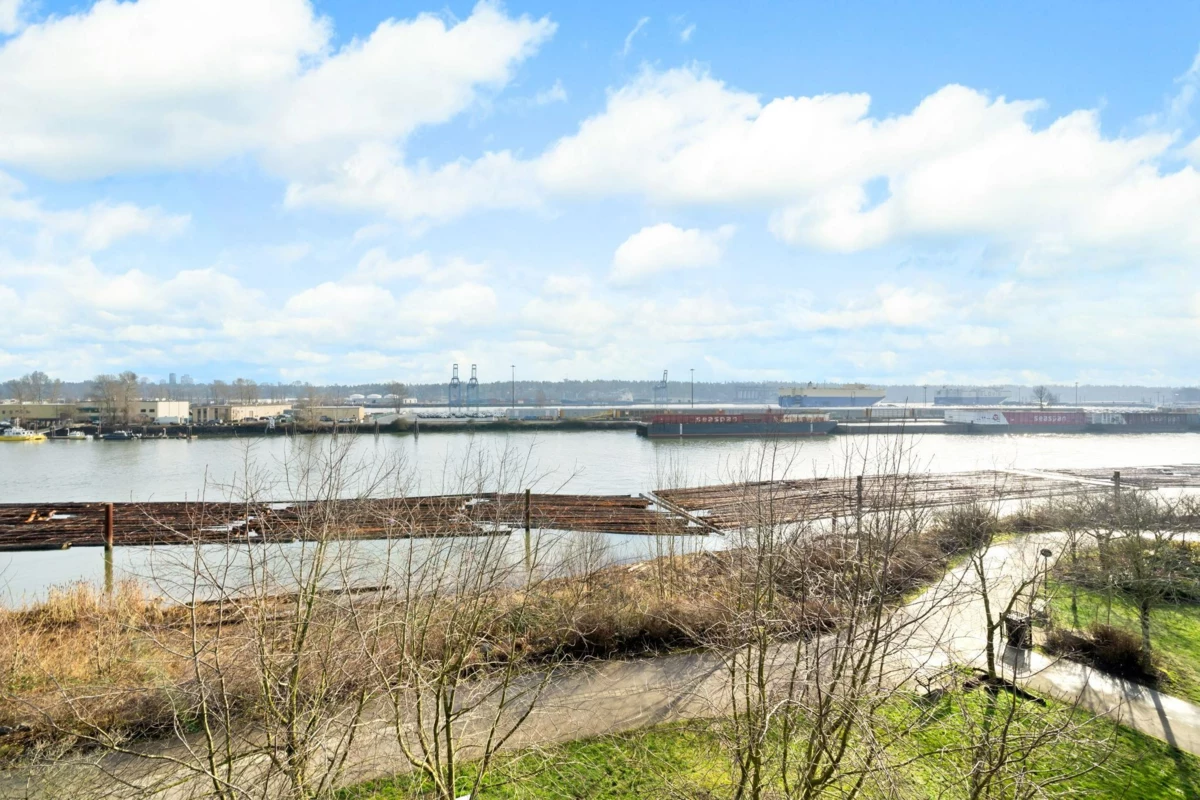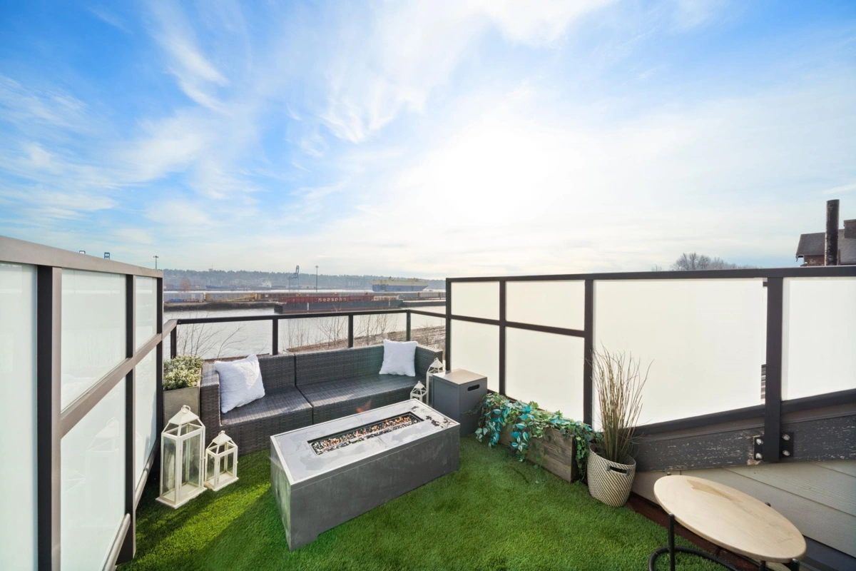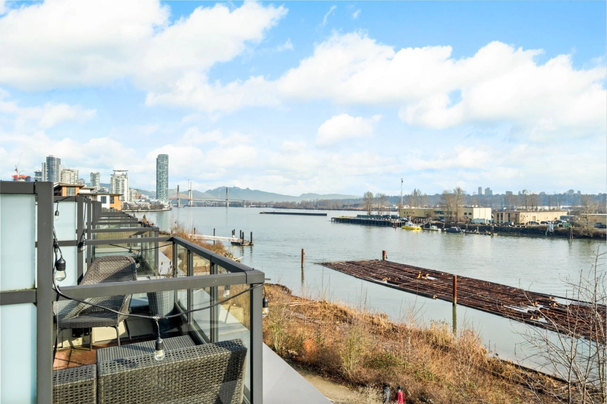 Wake up to river & mountain views in Port Royal, one of the Lower Mainland’s best-kept secrets. This stylish waterfront townhouse features hardwood flooring, top-of-the-line appliances, and a sleek kitchen with quartz countertops, gas cooktop, & drop-down range hood. Sunken living & dining areas offer elegant separation w/ a gas fireplace and modern brick accent wall. The second level offers 2 bdrms and a full bath with soaker tub, while the entire third level is a private primary retreat w/ ensuite & heated flooring. Enjoy both a ground-level fenced private patio & a private rooftop patio, watch tugboats glide by, and take in the ever-changing scenery. Walking trails at your door, plus playground & shopping nearby. Steps to Port Royal Park & the Quay Ferry to SkyTrain. 2 parking + locker.