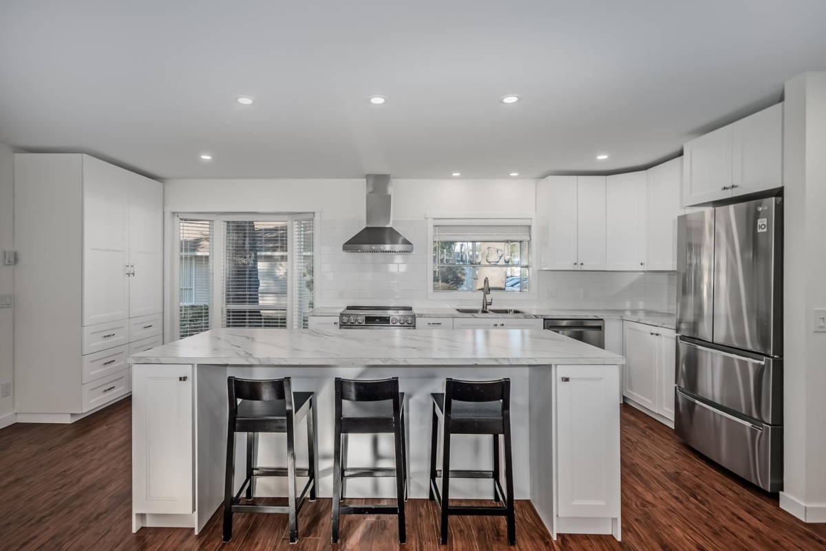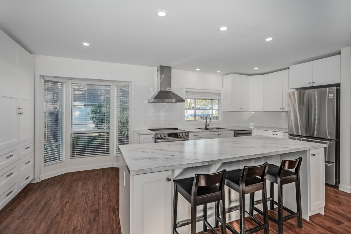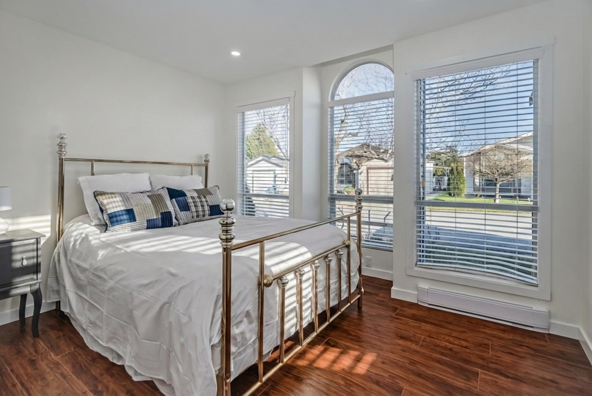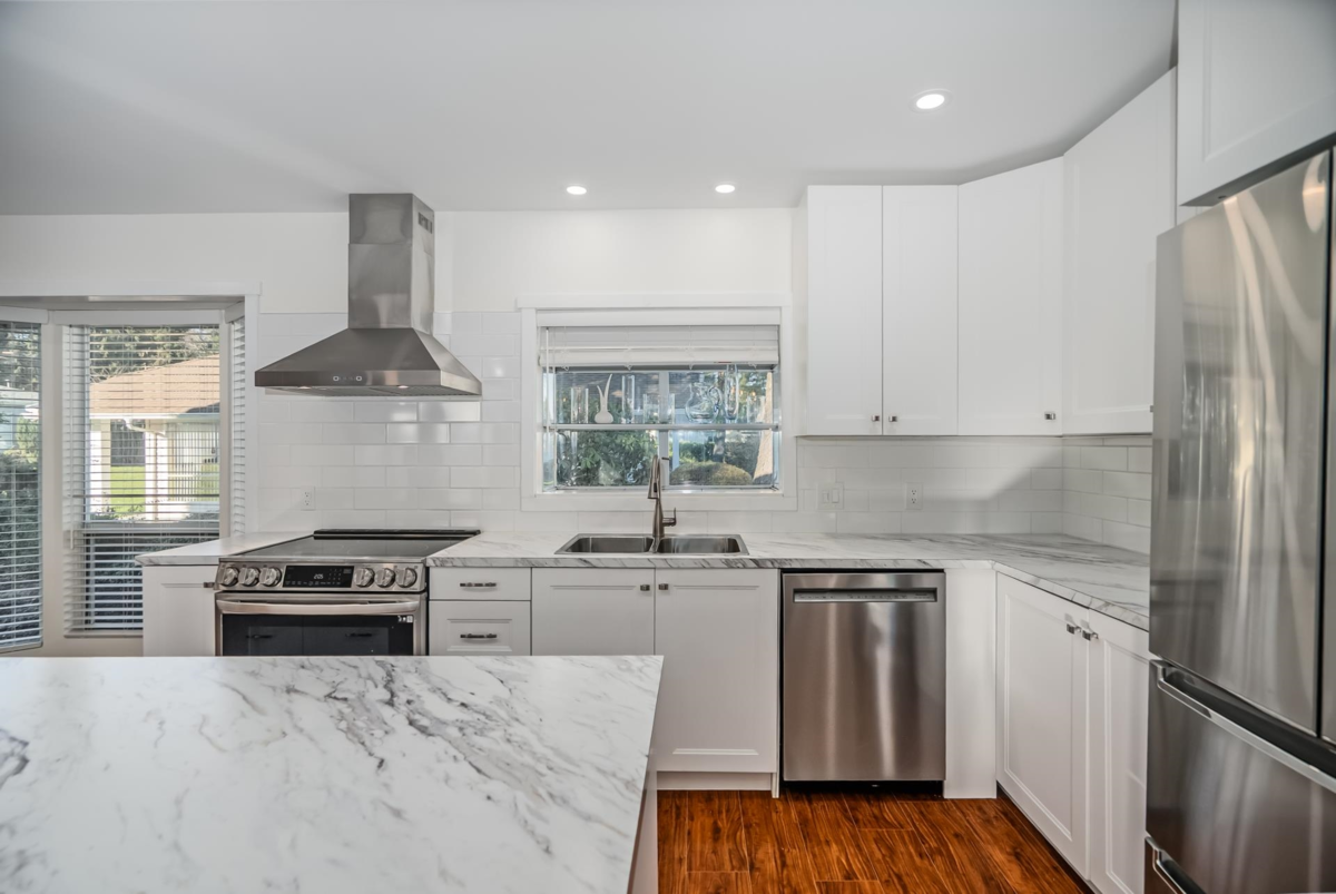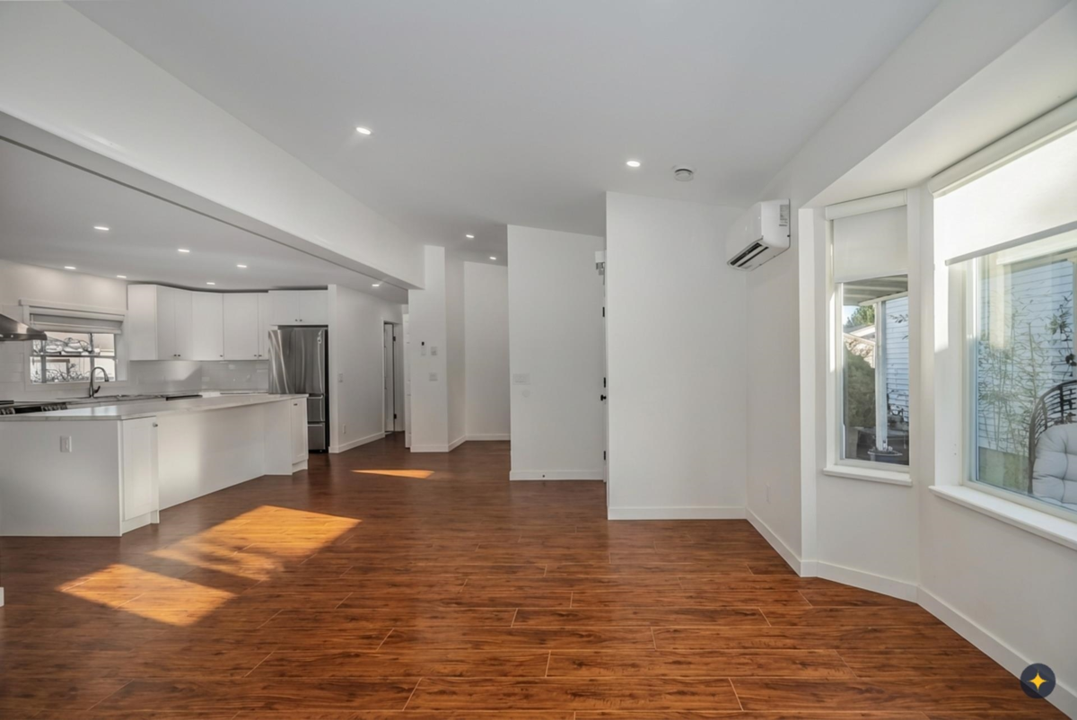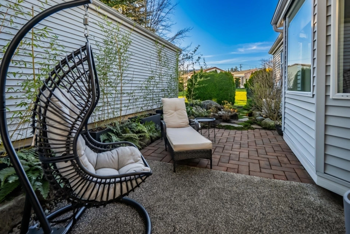 Welcome to La Mesa, a 55+ community where you own your land. This detached home was extensively renovated in 2023 with a new open-conceptkitchen, bathrooms, appliances, heat pump, and flooring. Surrounded by mature greenery and close to the clubhouse, it offers a bright living room with gas fireplace, an updated white kitchen with greenhouse window, and a bonus den. Bedrooms are separated for privacy, and the large ensuite features a skylight. Enjoy the covered, fenced patio, and a garden with a beautiful water feature. Close to shopping and amenities. Pets allowed.