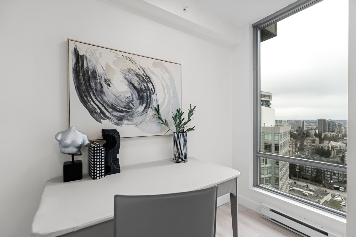 PREMIER COLLECTION EXCLUSIVITY – southwest CORNER with full-span windows, high floor, big BALCONY, stunning VIEWS from English Bay to Vancouver Harbour, & true, windowed HOME OFFICE (not a renamed nook or storage closet). It's RARE for a Premier level owner to sell; the 75+ ft² covered balcony exclusive to these 6 upper floors & the EXTRA SPACE you get with 2 fewer suites per floor make these DISTINCT & COVETED. Kitchen with LARGE PANTRY + flex area to expand kitchen, enjoy breakfast with an ocean view, or 2nd office. 24/7 concierge, gym, sophisticated dual lobbies. Step out to Coal Harbour, Alberni’s luxury row, Robson Street, & the West End. Seawall & new Coal Harbour School just a 7 minute walk. Downtown tower units can feel cookie-cutter. This home breaks the mold. 1 parking. 1 locker.