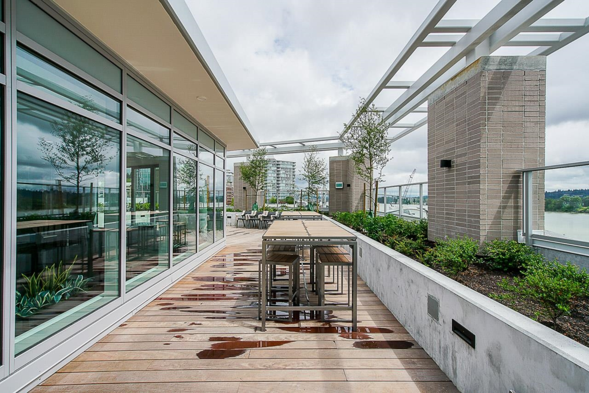 STUNNING city, mountain & river views from this luxury concrete tower RIVERSKY 1 built by Bosa close walking distance to the Quay boardwalk, transit, Skytrain, shopping & all amenities. Meticulously cared for 1 Bed/1 Bath, 530 sq ft*, NW facing suite features gas cooktop (included in maint fees), quartz counters, SS appliances, Island w/ built in dining table, built in desk, single Murphy Bed, laminate flooring, floor to ceiling windows, insuite laundry & spa like bath. Generous covered deck to enjoy the sunsets all year round! Fantastic building w/ fully equipped gym, clubhouse w/ fireside lounge & full kitchen, rooftop decks & BBQ, bike storage, parcel/cold storage & onsite concierge. 1 parking & 1 locker. Pets & Rentals OK!