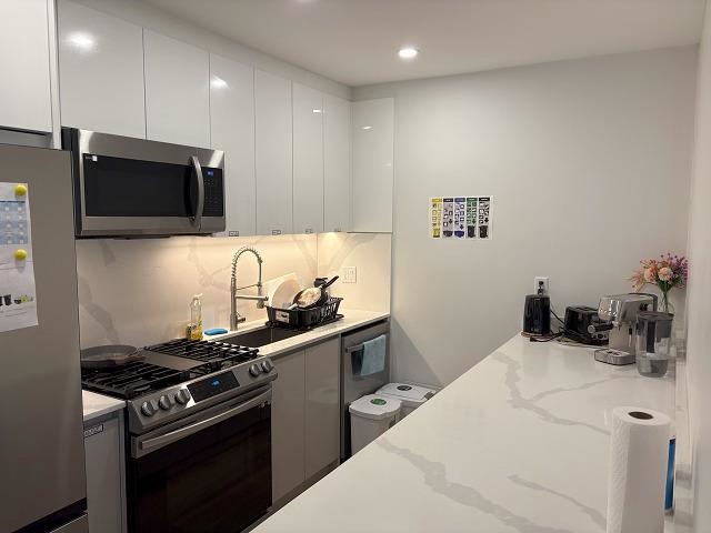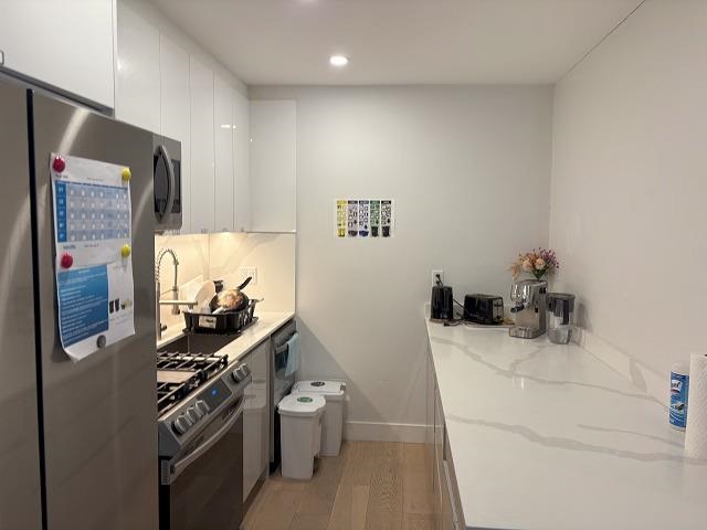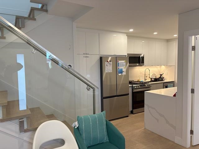WOW!! Prime East Vancouver single unit in tri-plex . Quality built. It is a top floor 2 storey unit on the front side. Features include beautiful engineered hardwood flooring throughout, glass railings to further enhance the open feel, vaulted ceilings, shared stacker laundry, open concept kitchen and formal area with luxury finishes. Main floor layout offers kitchen with marble counters, smooth arborite cabinets, separate bedroom. and a 2pc bath. Upper floor offers 4pc main bath, large bedrooms with vaulted ceilings, primary bedroom with 4pc ensuite. The home has all the modern connections; radiant in-floor heating, smart home technology, tankless hot water, A/C. The unit is rented to 3 separate tenants each with dedicated bedrooms, cupboards space. Mixed rental agreements in place.