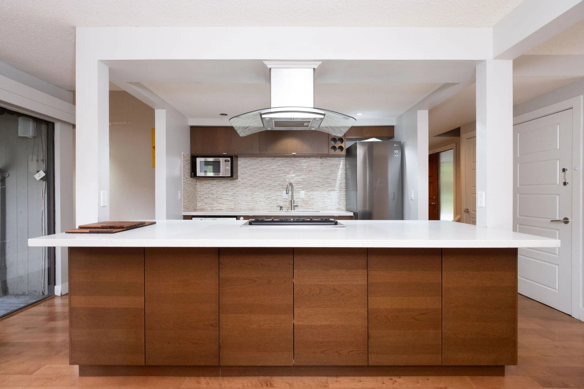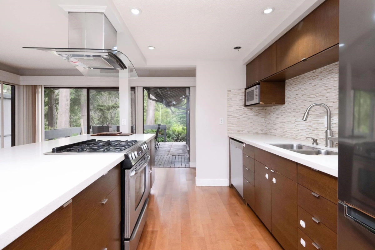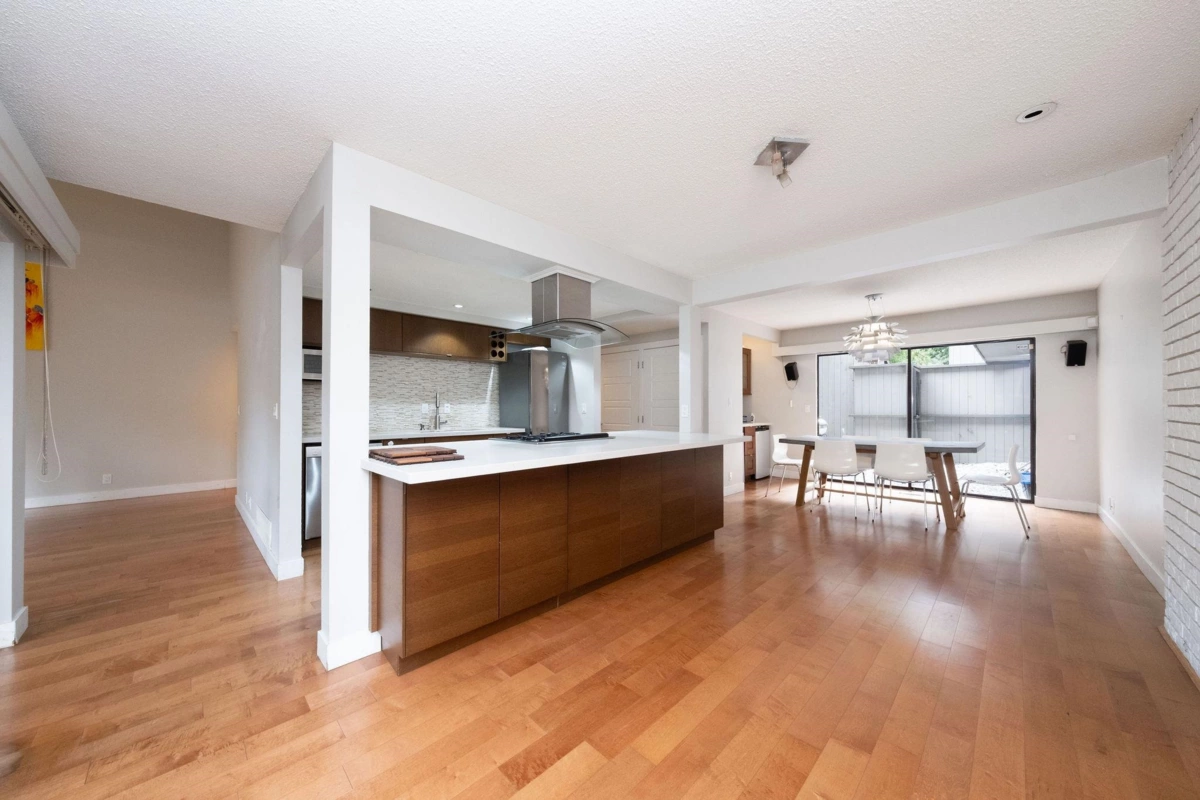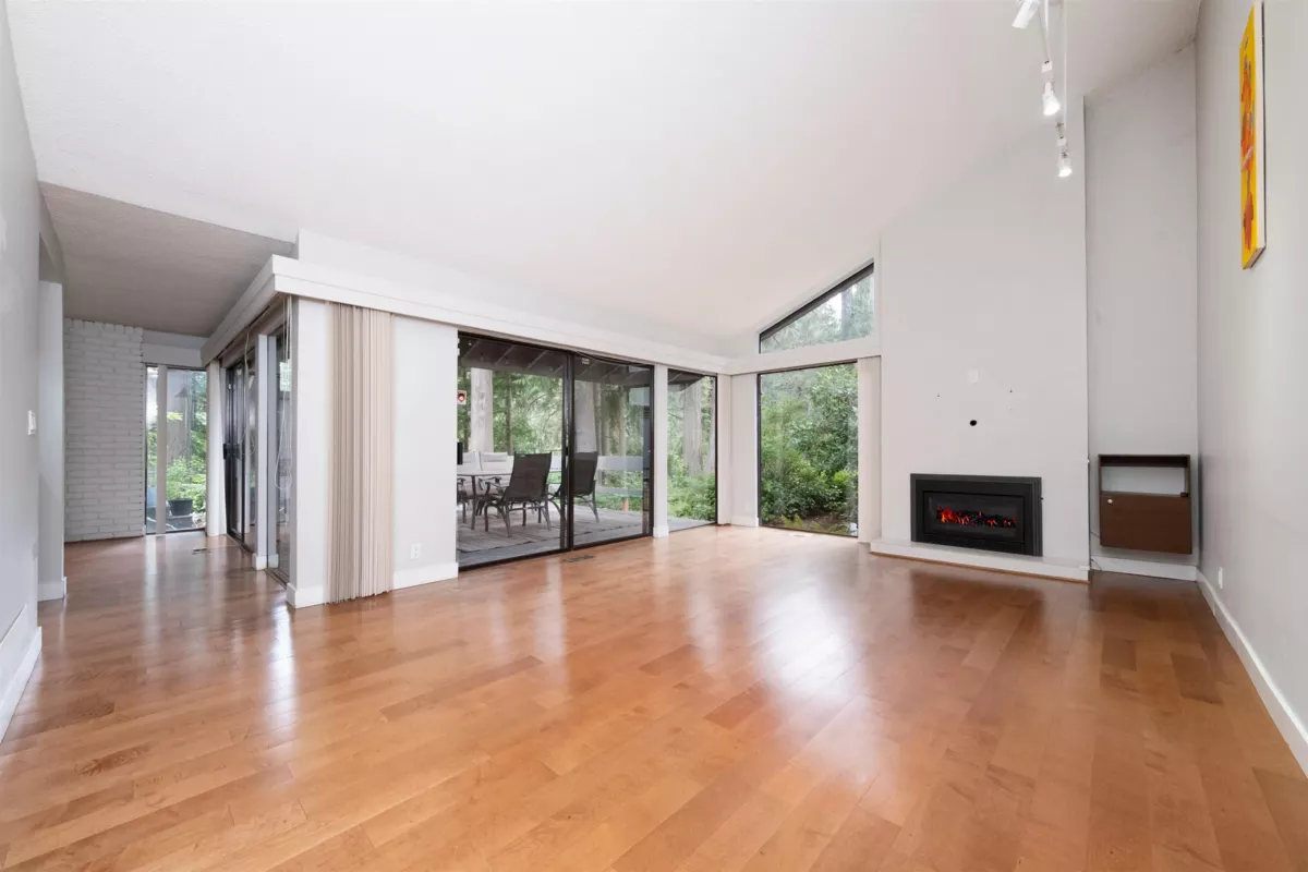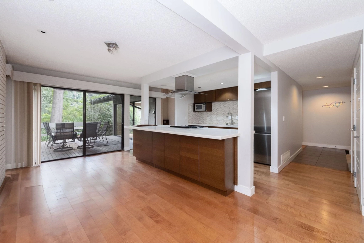 Immerse yourself in forest serenity at this West Coast modern semi-detached townhome overlooking Capilano River & greenbelt. Main floor welcomes with a foyer entrance, an expansive living room featuring vaulted ceilings, gas fireplace, & floor-to-ceiling windows that flood the space with natural light, plus access to a large, private patio with gas line. Adjacent, is a sleek modern kitchen boasts premium brand appliances, a center island, that flows into a dining area with an enclosed Zen patio & storage locker. Guest powder room and laundry complete this level, accented by durable engineered hardwood flooring. Upstairs, the spacious primary suite offers an updated 4-piece ensuite, walk-in closet, & private deck, alongside 2 bdrms, & large storage room. 2 parking spots with EV plug.