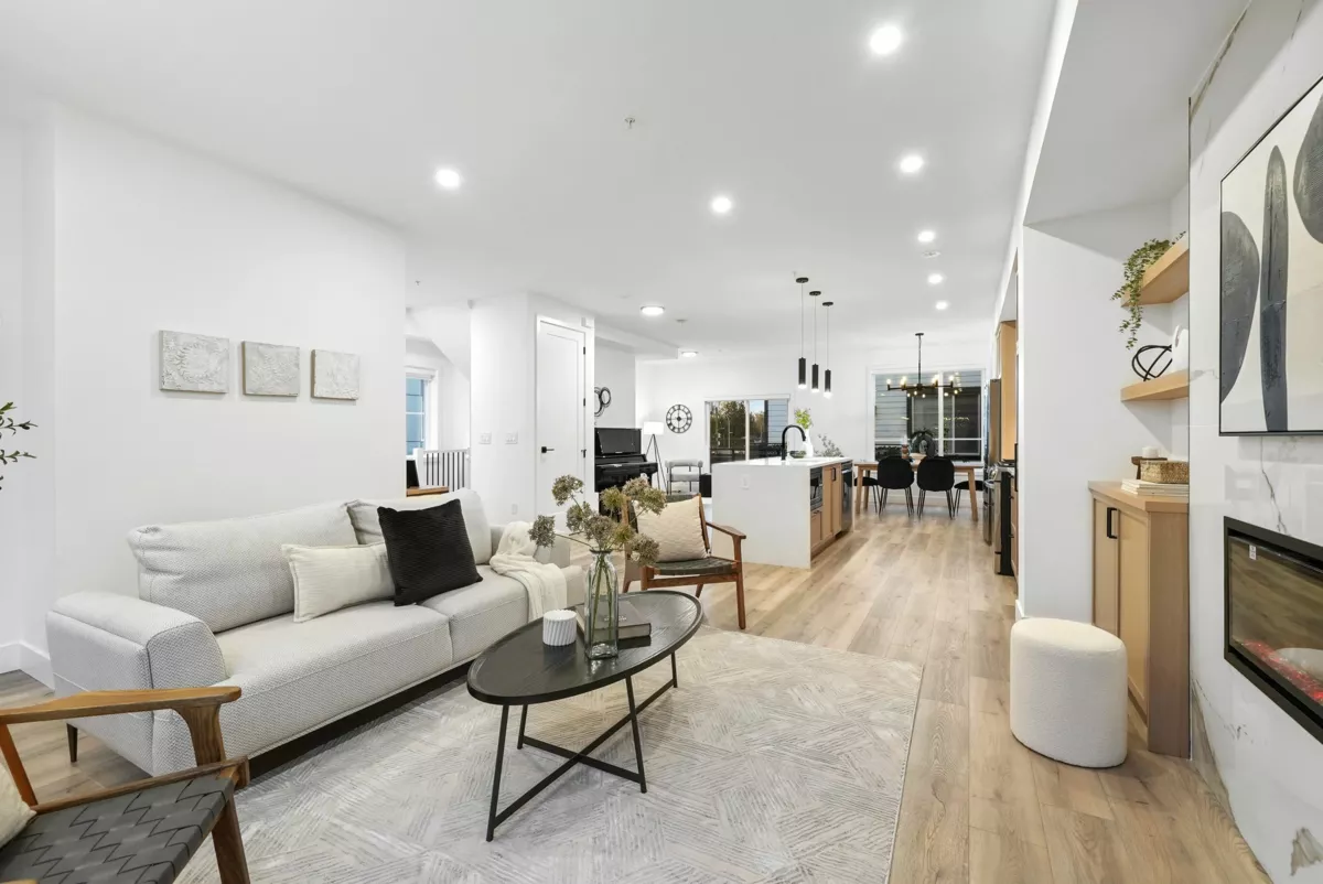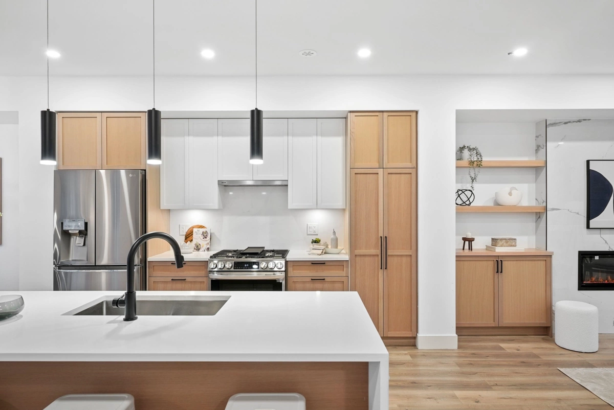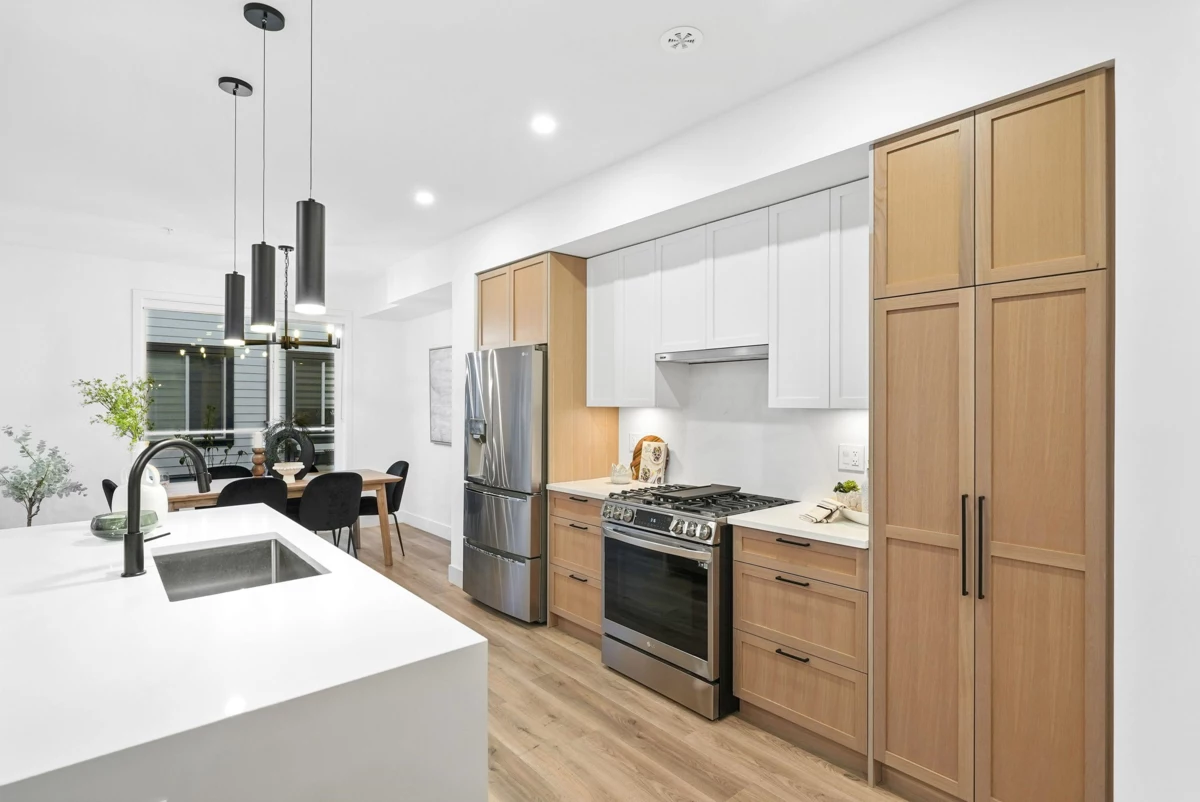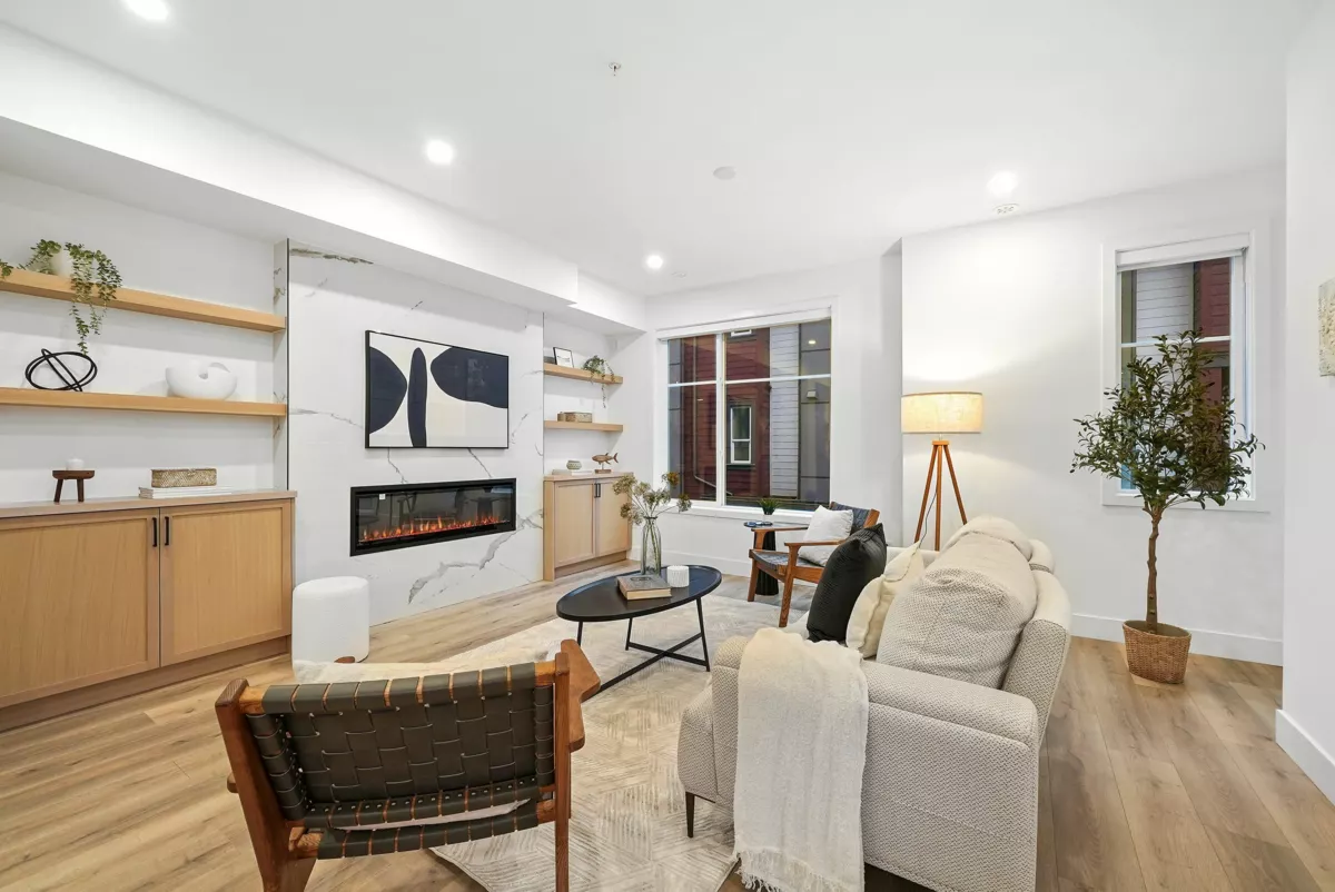 Welcome to Crofton! This bright end-unit townhome offers 4 beds, 4 baths, and 2,092 sq.ft. of high-quality construction and finishings. Enjoy NO GST and low strata fees of only $196.69! Main level features wide-plank laminate flooring, large windows, and a beautiful feature wall w/electric fireplace & built-ins. Chef-inspired kitchen includes two-tone shaker cabinets, a quartz waterfall island, LG stainless steel appliances, and a gas range. Perfect for entertaining! Upstairs, a huge luxurious primary bedroom with WIC and a spa-inspired ensuite w/double sinks, oversized glass shower, and soaker tub. Two additional bedrooms & full bath. Lower-level bedroom w/ensuite provides the perfect space for guests or office. Features central A/C, on-demand HW, a fenced yard, and a double garage!