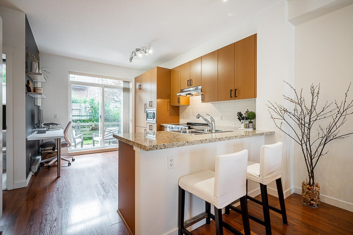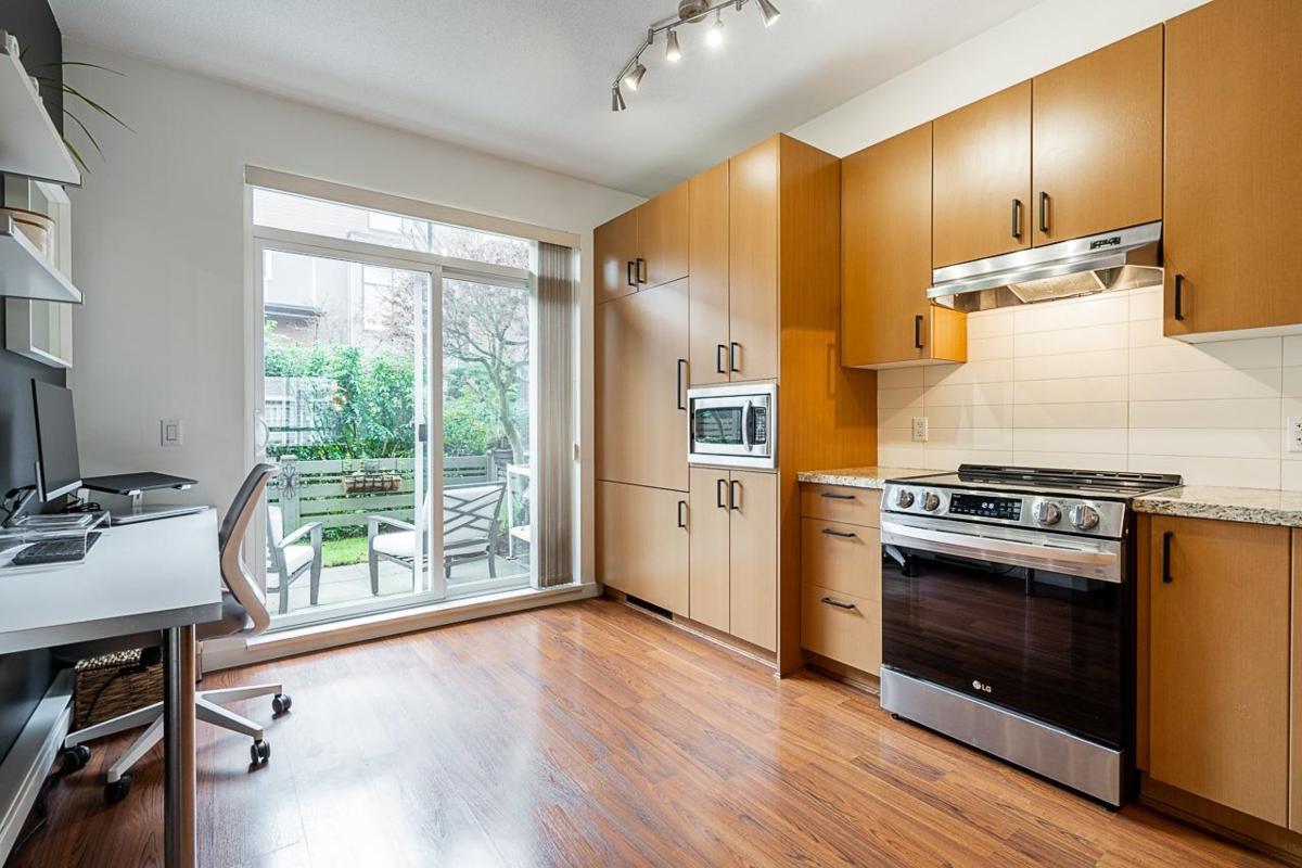 KALEDEN in Morgan Hts: 3 bed 3 bath 1395sqft townhome in prime QUIET location enjoys a PRIVATE SUNNY SOUTH FACING fenced yard, allowing seamless indoor/outdoor living. Features incl open concept layout w/9ft ceilings, elegant laminate floors, living rm w/feature fireplace, large windows & BONUS POWDER RM ON MAIN LEVEL. Bright kitchen w/granite counters, large pantry & SS appliances.Updates incl new stove, dishwasher, plush carpet, blinds (2025)&washer dryer(2023). Spacious Mstr w/luxurious 4pc ensuite w/double sinks & oversized shower. Large tandem 2 car garage w/tons of storage space. Well managed complex built by Polygon.LOW MAINT FFEE w/impressive 7,500sqft Clubhouse w/lounge, pool, hot tub, gym,theatre+guest suite. Walk to Thrifty's, Winners, Sunnyside Elem, restaurants, transit &more!