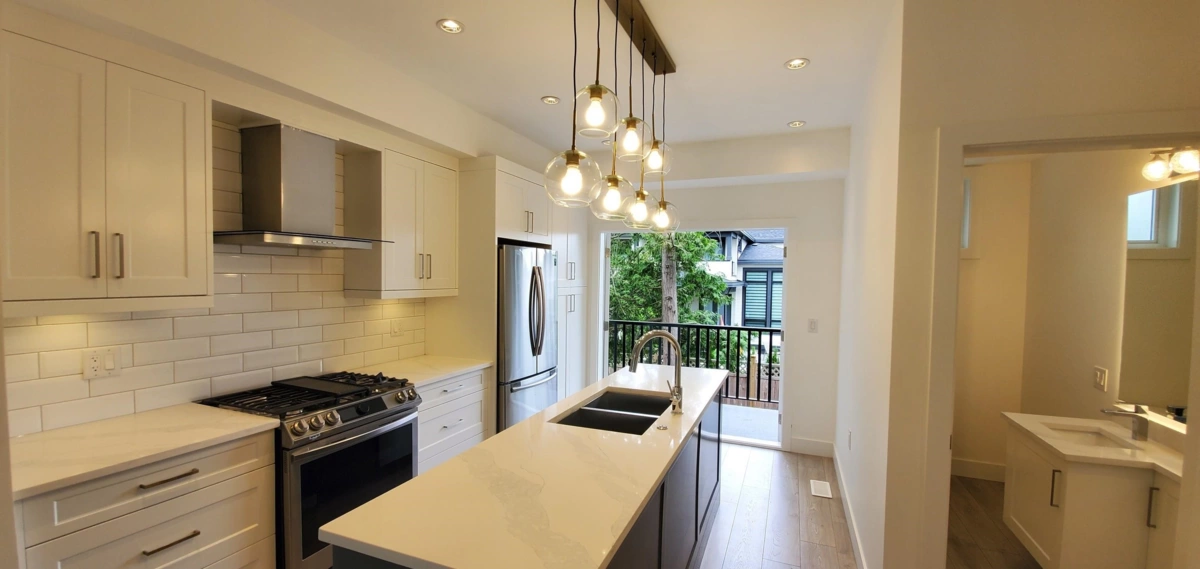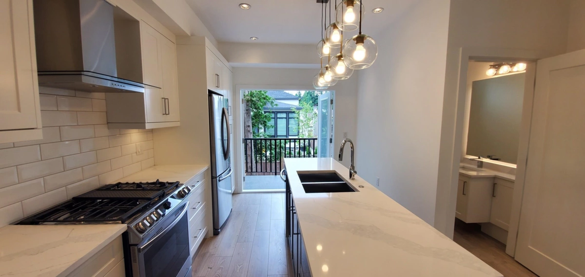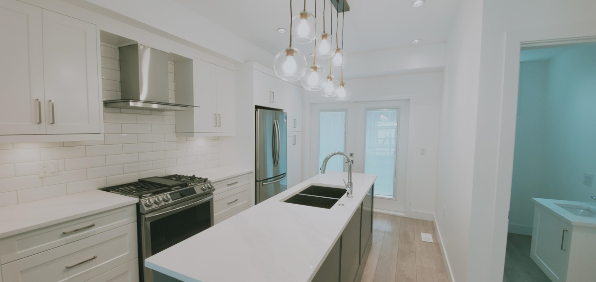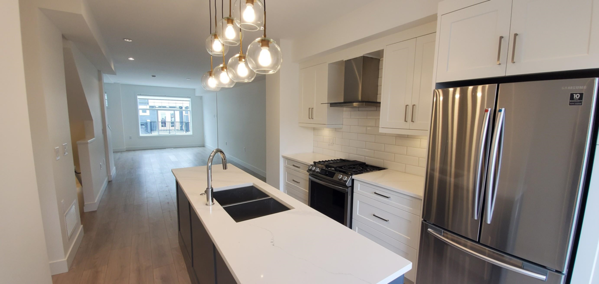 Inside unit, not facing 72 Ave and 116 St!! WELCOME to CYRUS HILL, this stunning 3 bed / 2.5 bath townhome is NEWLY BUILT in the heart of Sunshine Hills. A stylish open-concept home offers spacious Living & Dining, Kitchen with a LARGE Island, High-End Appliances, soft-closing drawers, durable quartz marble-look counters, laminate hardwood flooring, south facing LARGE balcony& Fenced yard. 3 bedrooms upstairs including a spacious master with a walk-in closet, & ensuite with dual sinks. Forced Air heating, with A/C option. Great location, walking distance to schools, parks, transit, shopping, Walmart, and all amenities. Seaquam secondary Catchment, No. 1 Ranked public secondary school with IB Program! Easy access to Hwy 91/99. 3 Parking space. Open House, 2-4pm, Jul 2nd