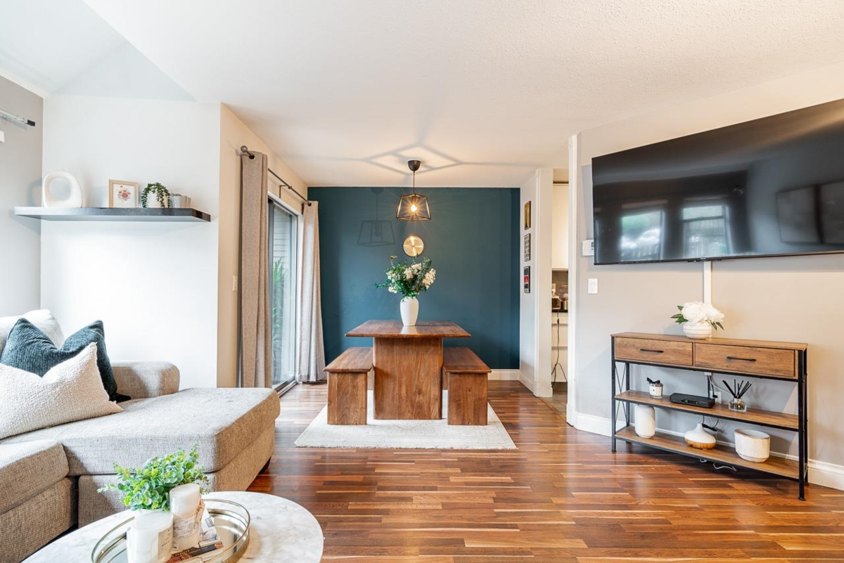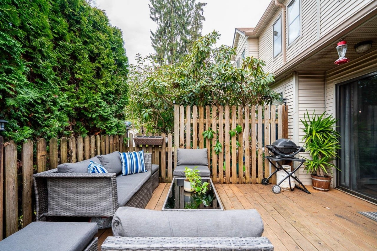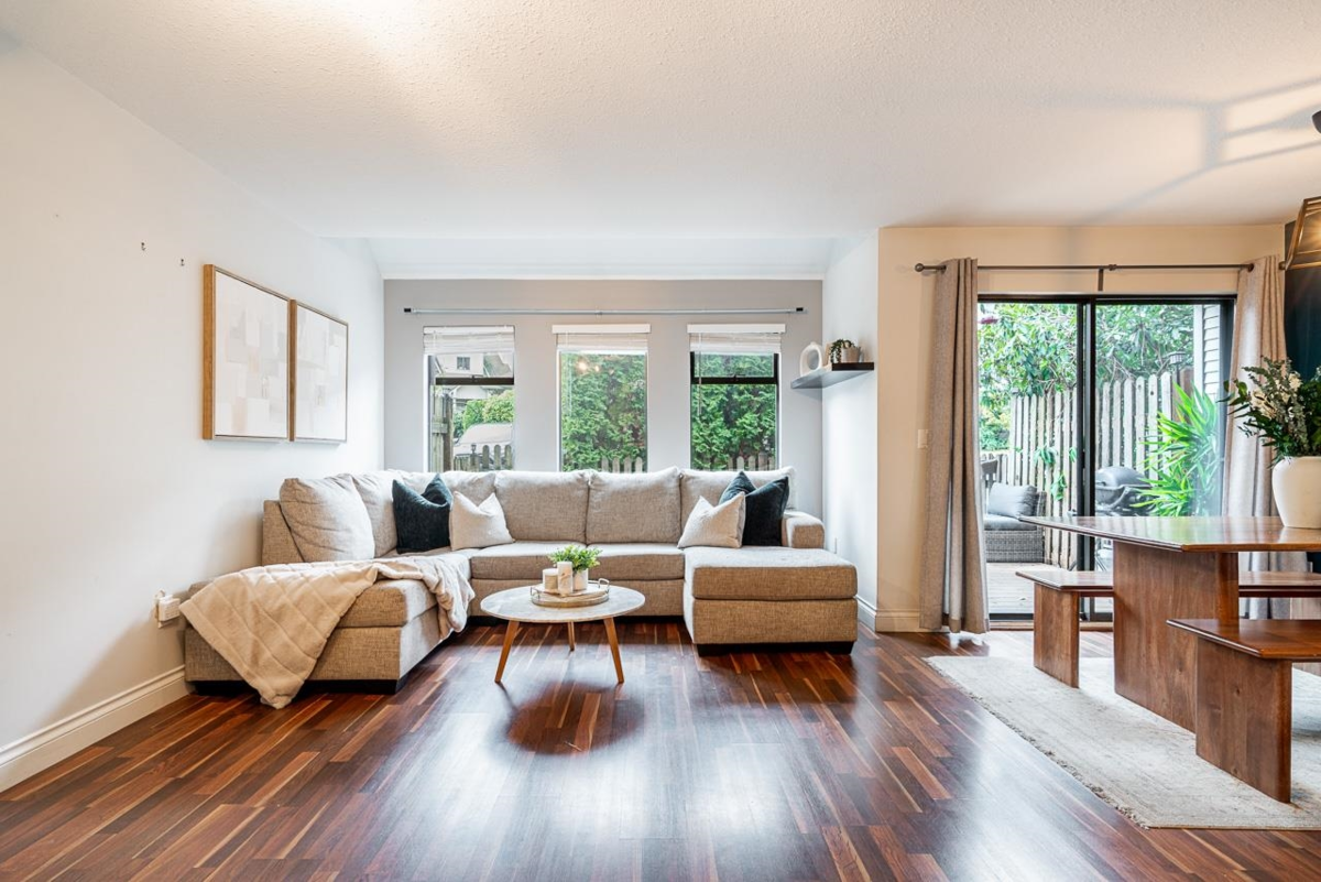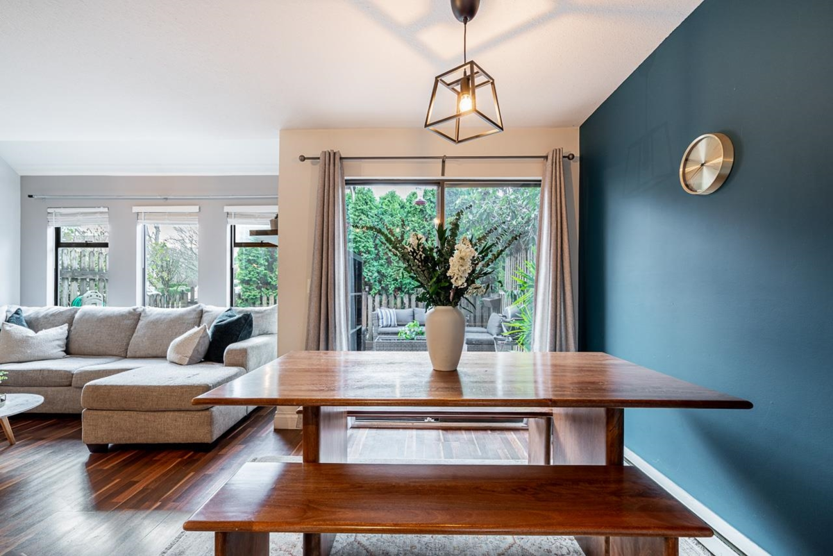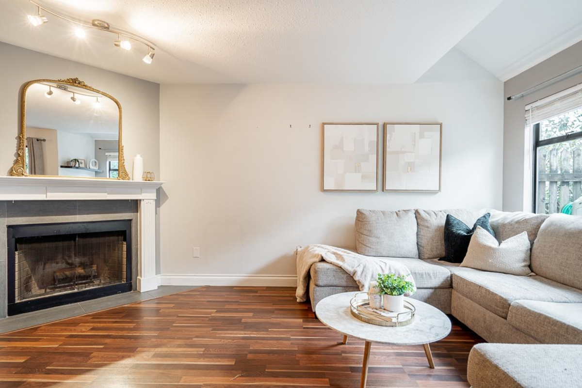 Tucked away in the well-cared-for Le Parc complex, this peaceful 3 bedroom, 3 bathroom townhouse offers a smart layout and tasteful updates throughout. The main level features a refreshed kitchen, sunlit dining area, and a stylish powder room. Relax in the inviting living space with a fireplace, or step outside to your private patio and fenced yard—perfect for quiet mornings or entertaining. Upstairs are two spacious bedrooms, a full bathroom, and convenient laundry. The top floor is dedicated to a serene primary suite with vaulted ceilings, walk-in closet, and ensuite. Recent improvements include updated bathrooms, laminate and tile flooring, fresh paint, and contemporary lighting. Steps to historic Maillardville and minutes to Hwy 1, shops, dining, and transit. A must-see opportunity.