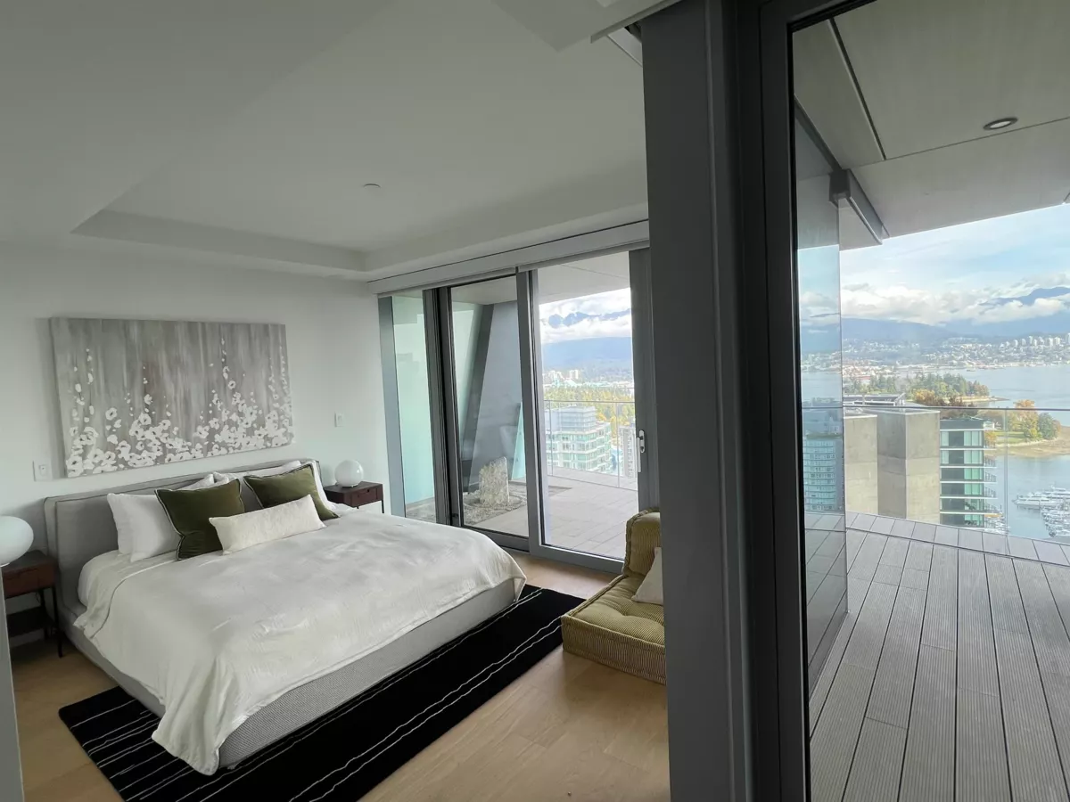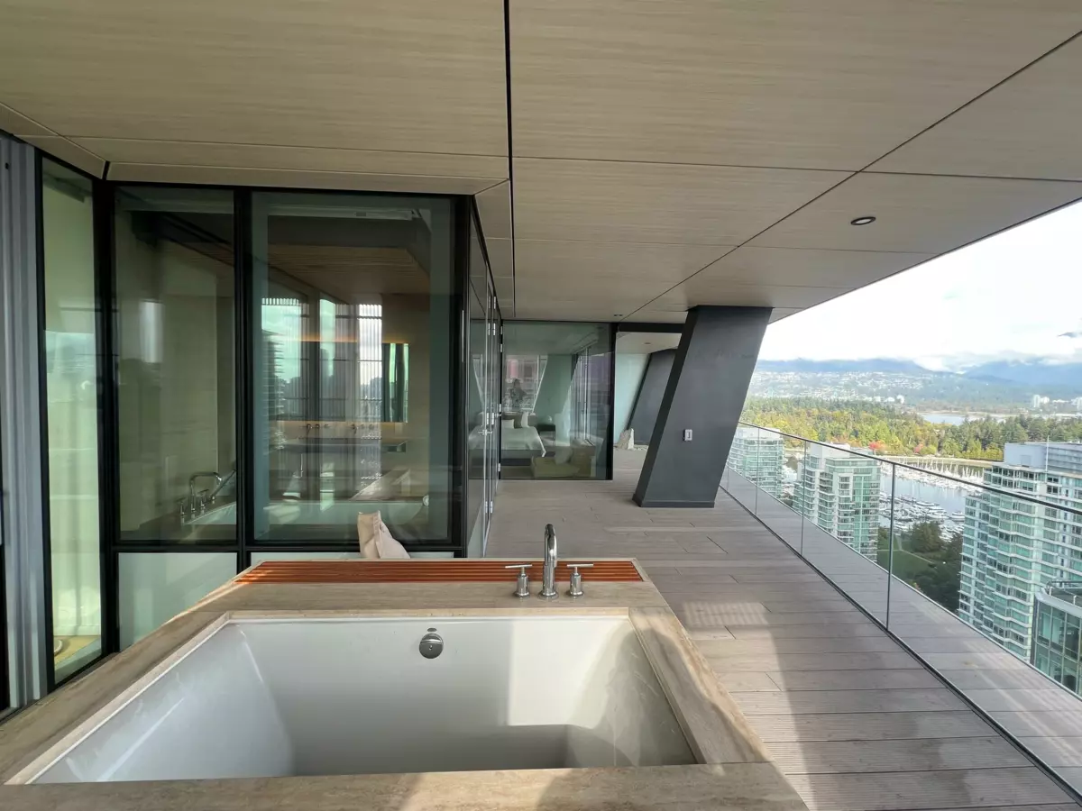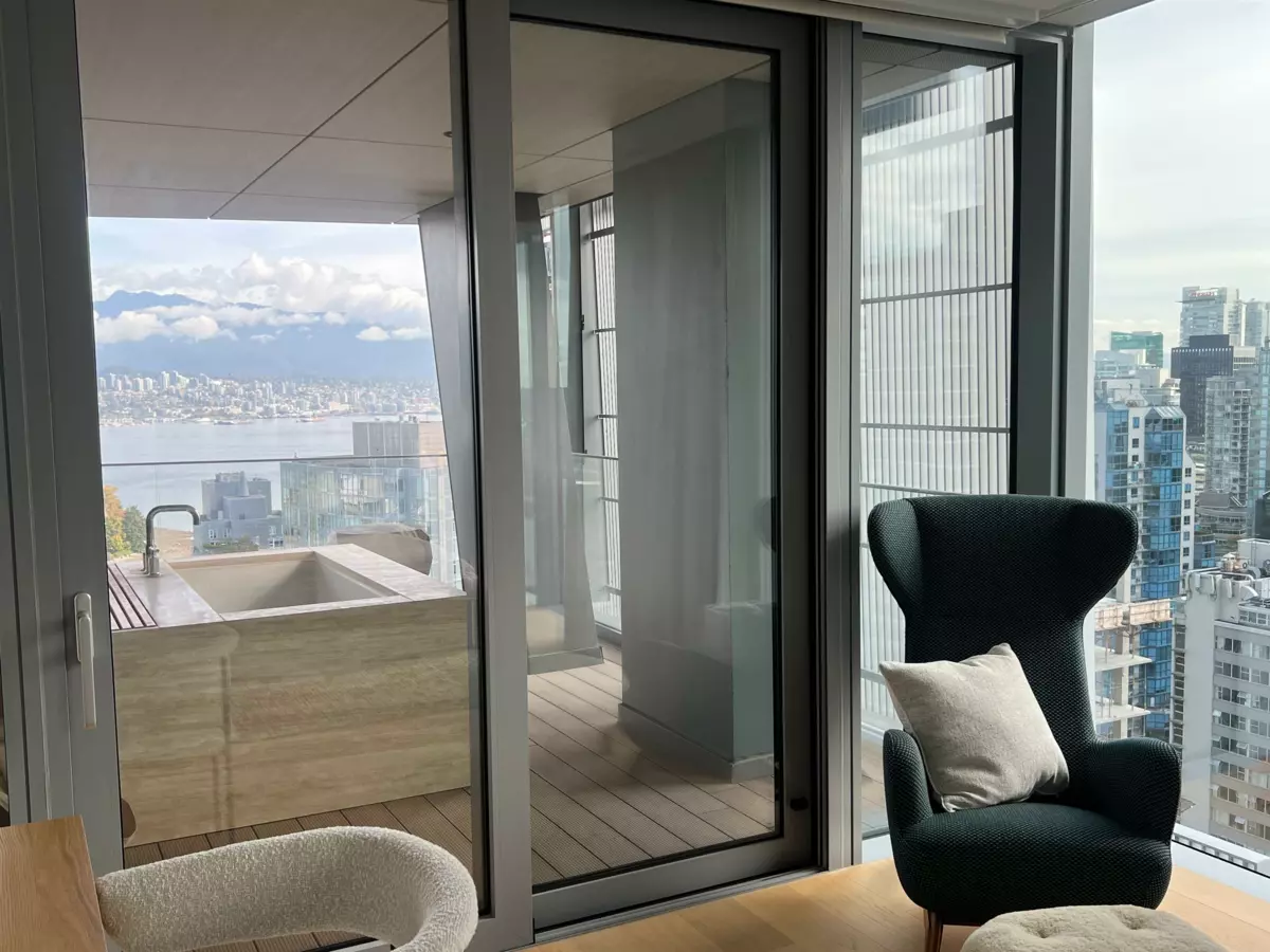 Welcome to the newest standard of Vancouver luxury: Alberni by Kengo Kuma.Imagine living in this spectacular 3 bdrm suite, where every detail has been meticulously crafted. Encompassing 2,066 sqft of refined interiors and an expansive 520+ sqft of private balcony space, this residence offers truly breathtaking, panoramic vistas spanning English Bay, Stanley Park, and the majestic North Shore mountains. Inside, the exquisite design features continue with curved wood walls, a signature of Kuma's aesthetic, complemented by top-of-the-line Miele appliances and sophisticated stone countertops.The amenities redefine opulence, including a serene Japanese moss garden, a 25-meter swimming pool, an exclusive wine room,gym,music room,fitness center,indoor pool.Included are 1 parking spot and 1 locker