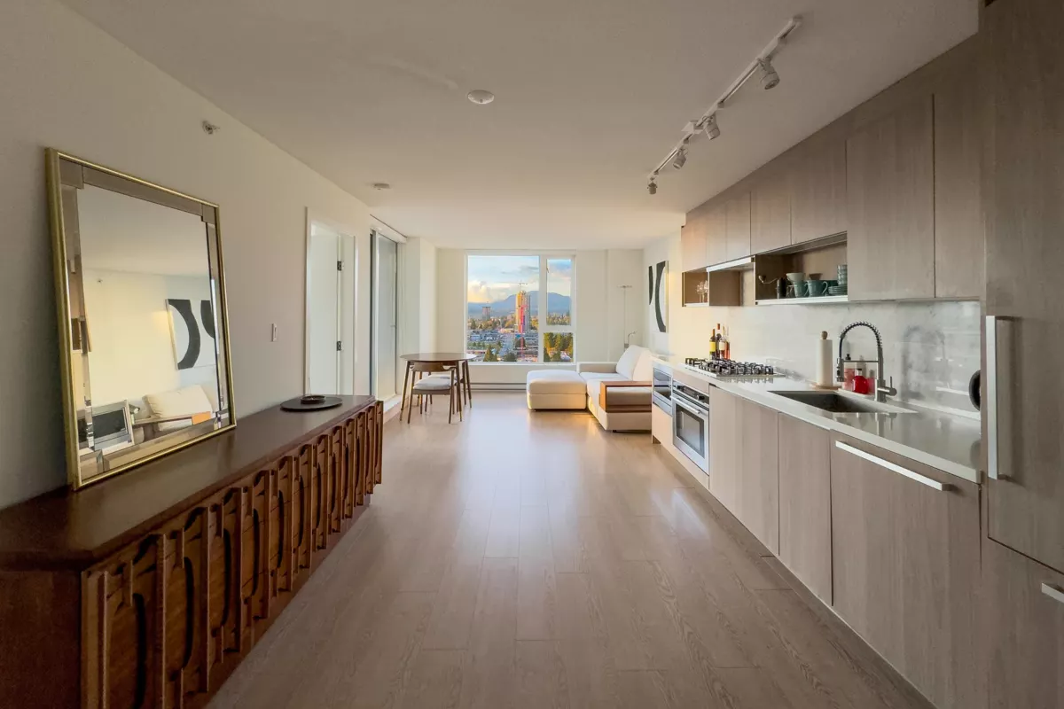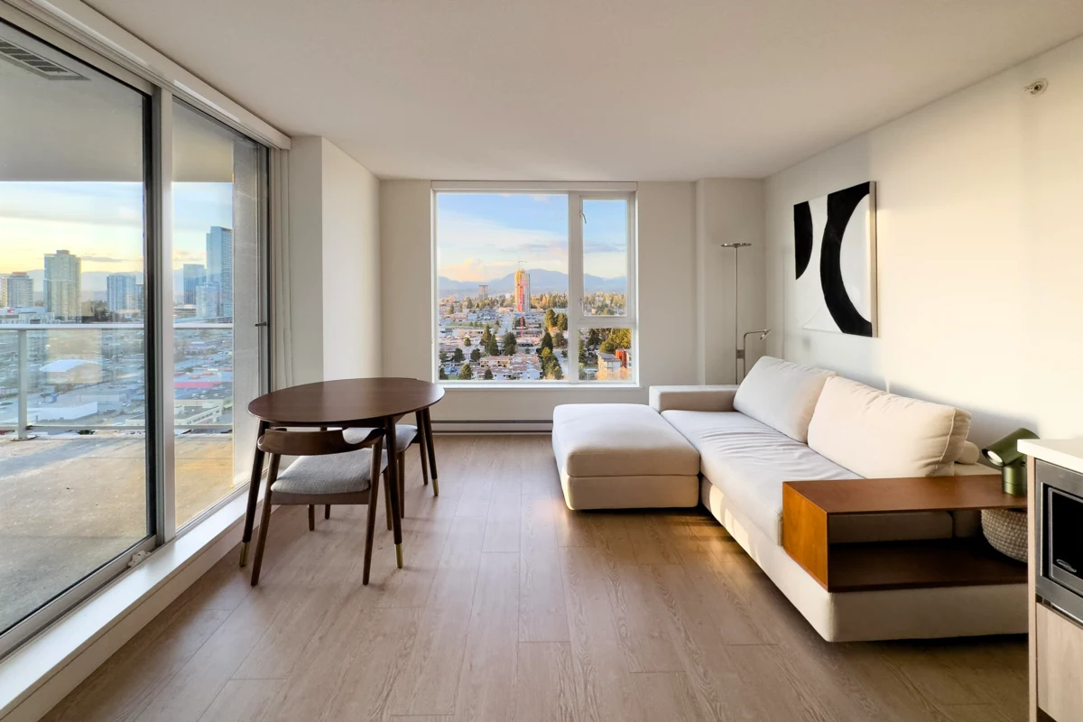 PARK AVENUE by Concord, where this inviting northwest corner, 2-bed 1-bath sky home beckons. Take in panoramic mountain views and sunsets from large picture windows and expansive covered balcony. The sleek kitchen features marble backsplash, quartz countertops, and integrated appliances. Relax in resort-style amenities including an outdoor pool, hot tub, sauna & steam room, fitness centre, tennis court, golf simulator, party lounge, rooftop terrace, and concierge. Ideally located steps from SFU, King George Station, T&T, shops, and restaurants, this gem includes one parking spot and a storage locker. Book your private viewing now!