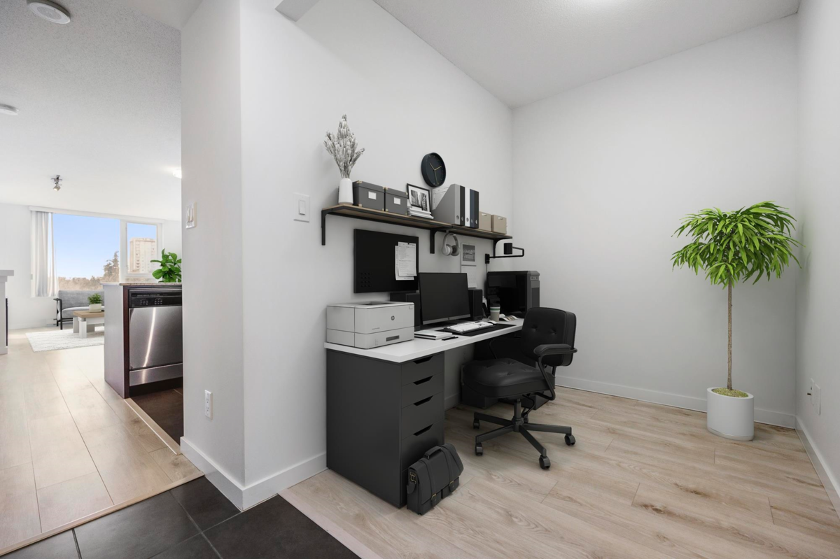 BRIGHT, LARGE WINDOWS, SW VIEW. A terrific purchase for those who prefer quick, easy access in & out of their home. 2LC is located in close proximity to all of the building amenities: gym, parking, playground, guest suite & storage. No need to spend time waiting for the elevator, perfect for dog walking & easy mobility. Steps to Skytrain, shopping, eateries & entertainment. Updated paint, flooring & light fixtures in modern, pleasing color scheme, Gas Range & SS appliances. 2 bdrm closets. BONUS: expansive den/office & large southwest facing & private patio. Visitor Parking Pass. 1 parking stall (P2 544), 1 HUGE storage locker (P4-002) + a bike locker room. This condo is the gift that keeps on giving.