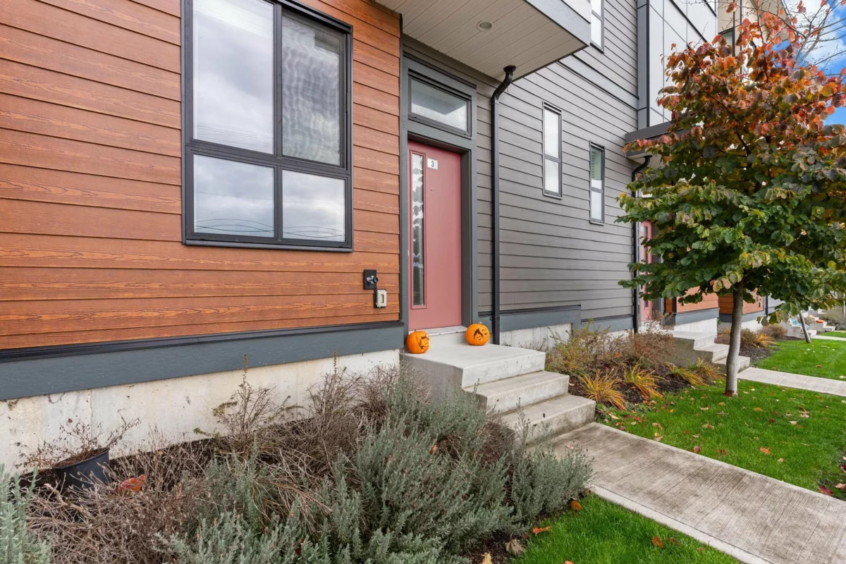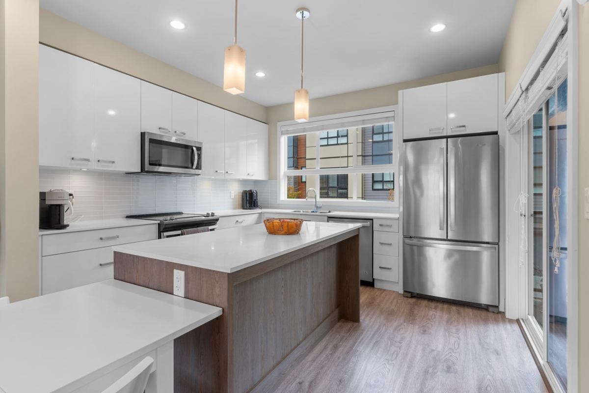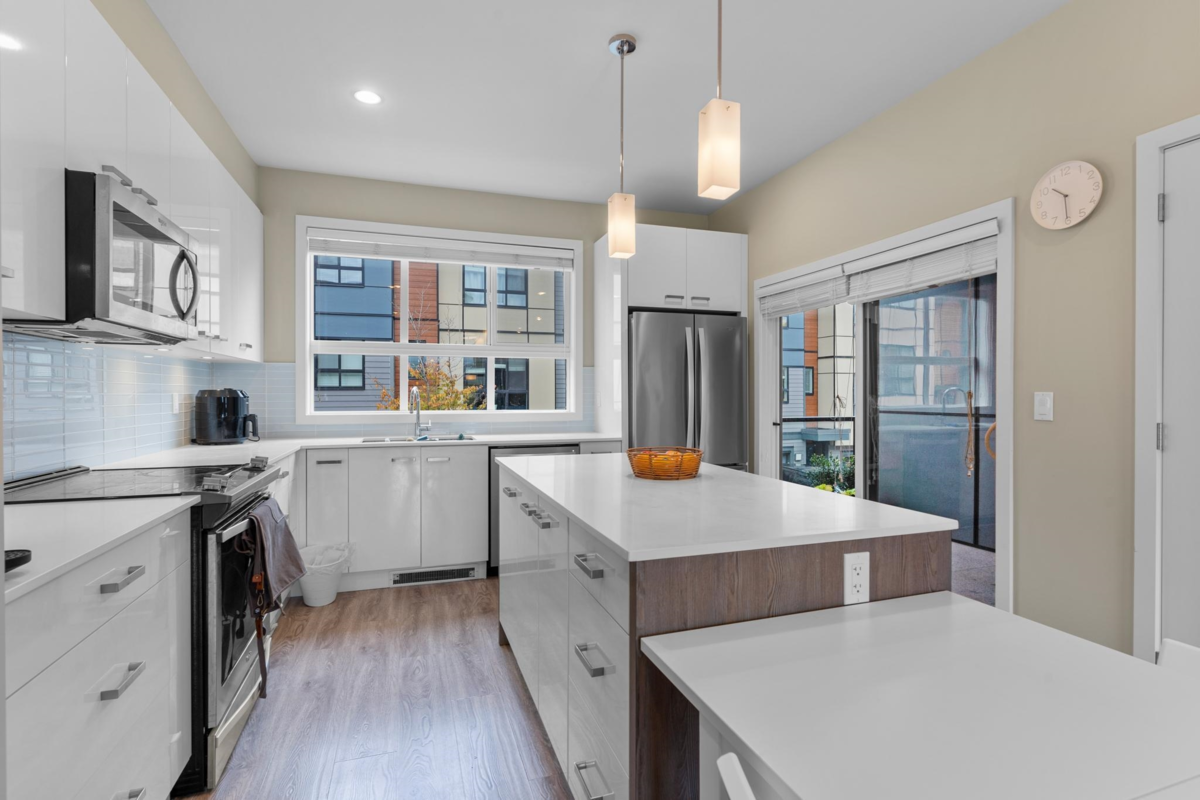PARALLEL SOUTH TOWNHOME! Modern & bright 3 bdrm/3 bath/den townhome with 1490 sq ft. of living space in one of the best locations in the complex! OPEN CONCEPT main floor feat. living rm with FIREPLACE, GOURMET KITCHEN with QUARTZ COUNTERTOPS, S/S APPLIANCES & TONS OF CUPBOARDS, 2 pce powder rm, spacious dining rm w/doors onto PATIO, perfect for enjoying morning coffee! Upstairs has 3 large bedrooms & 4 pce main bath plus master suite with GORGEOUS ENSUITE & WALK IN CLOSET! Quality finishing throughout. Pets & rentals allowed.