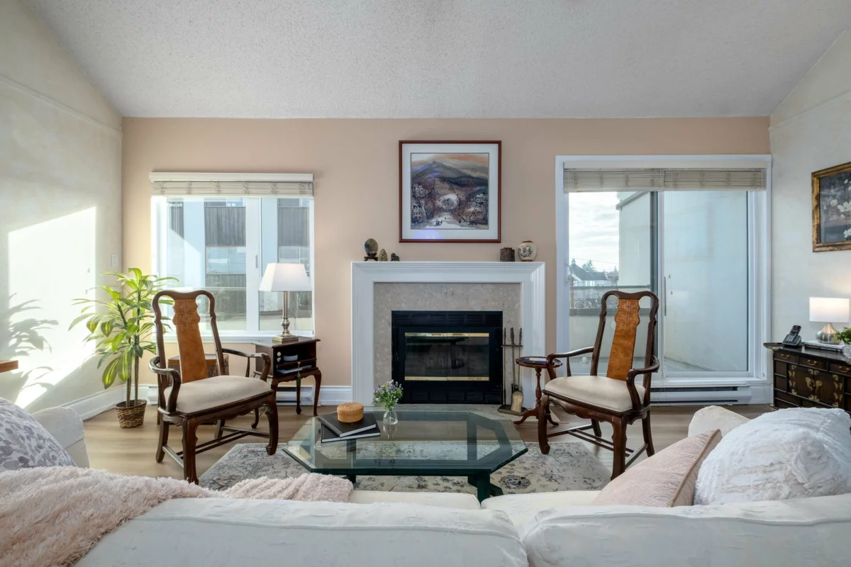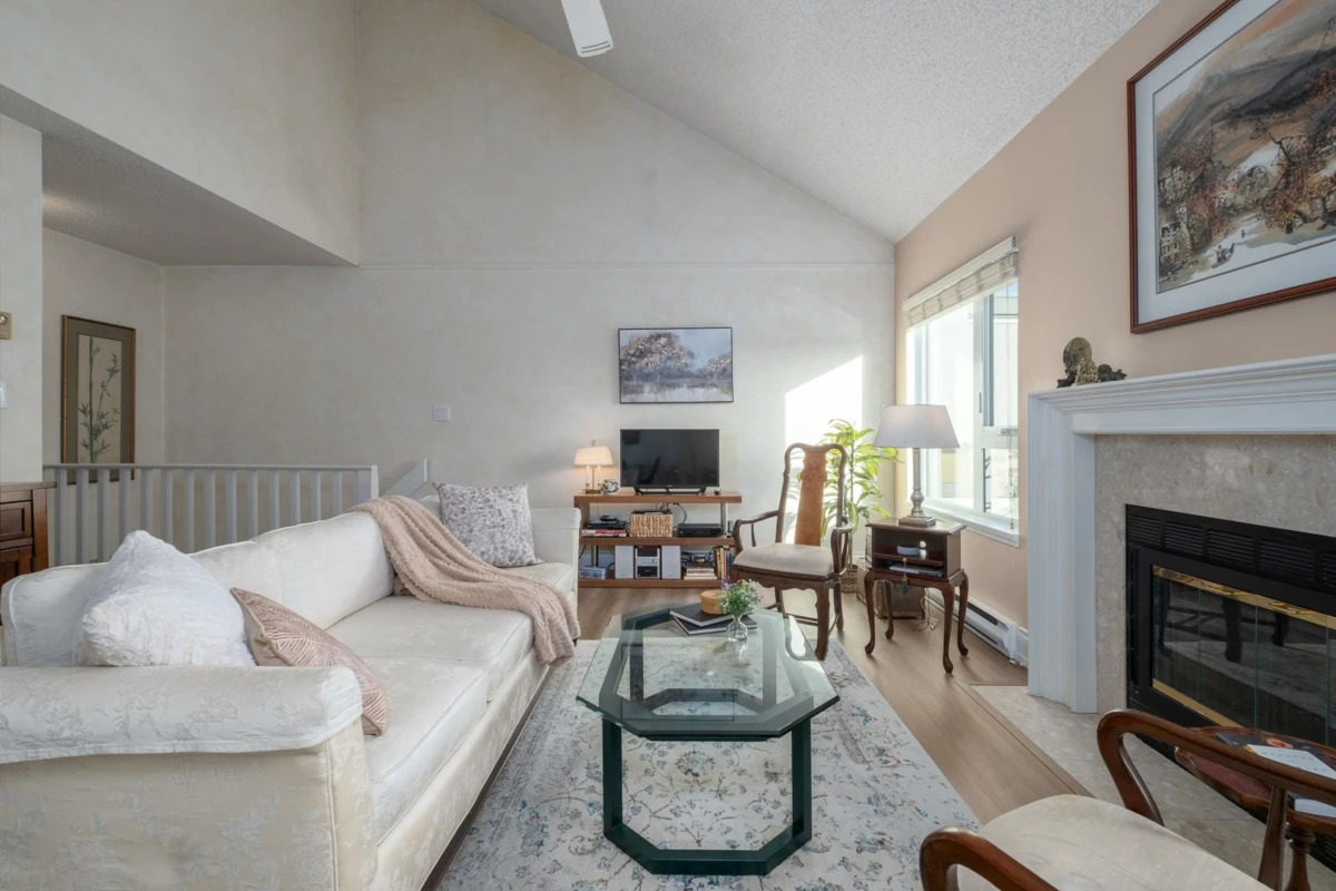 Rare 2-level, penthouse suite on a quiet, highly sought after Central Lonsdale block. This spacious, 964 sq ft, 2 bedroom, 1.5 bath unit, enjoys townhome-like living, with the quiet enjoyment of a pro-active, well maintained building. The upper level features an open living space w/ new vinyl floors, airy 16 ft vaulted ceilings, cozy wood fireplace, balcony off the living, powder room & an updated kitchen w/ its own skylight for additional light. The lower level then features two bedrooms w/ loads of closet space, balcony, & 4-pc ensuite in the primary; side by side laundry; & storage underneath the stairs. The home is complete w/ an entrance on each level, 1 parking, storage, & 1 cat OK (no dogs). Situated on a convenient block in Central Lonsdale, you have everything at your doorstep!