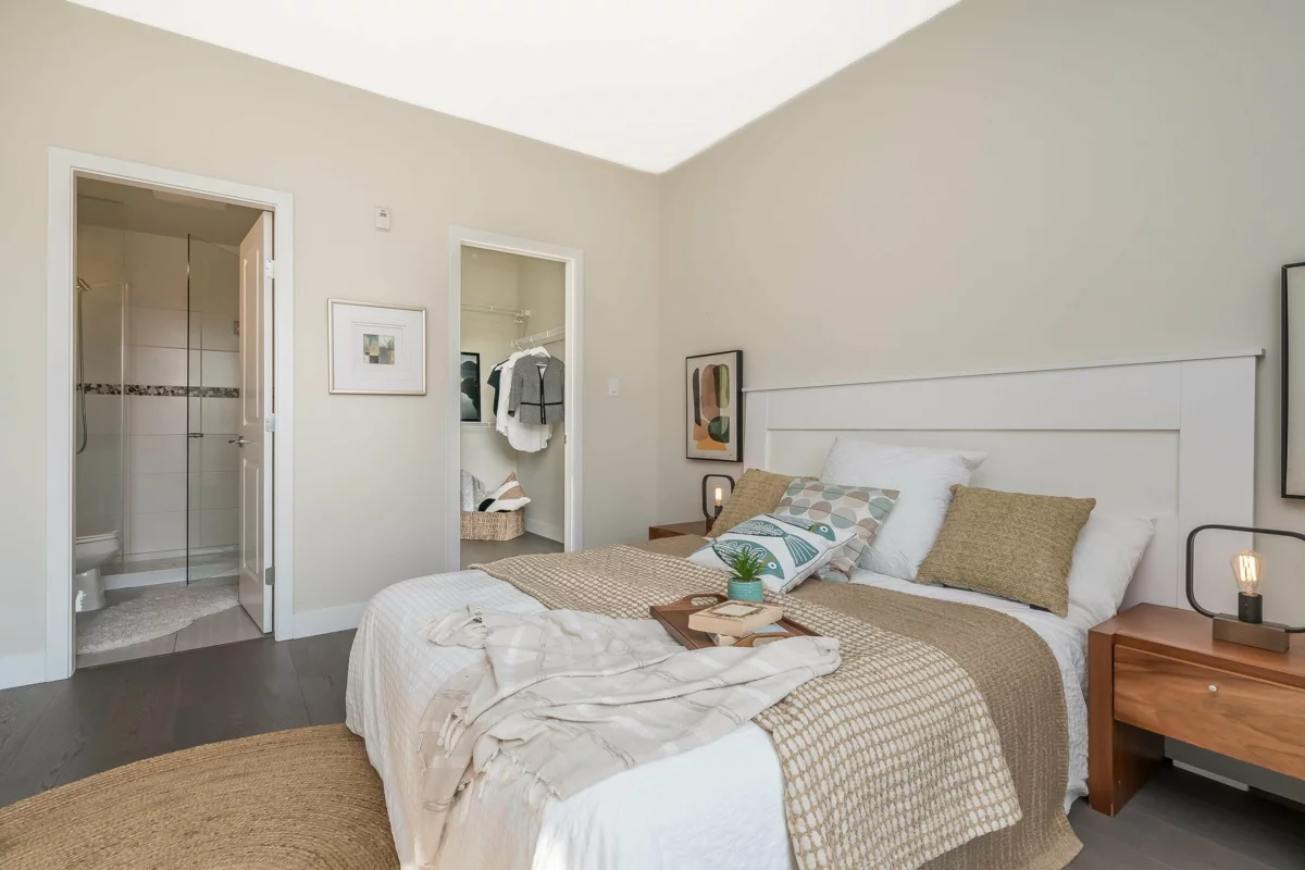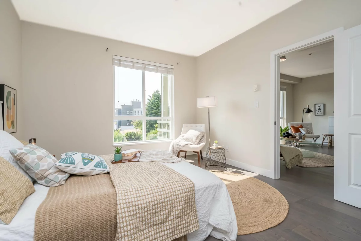 Spacious modern condo at respected Summit House is bright and airy with oversized windows, 9’ ceilings and open floorplan. 2 generous bedrooms, separated for privacy, each with a full bathroom. King-sized primary bedroom has a massive walk in closet. Relax on the large sunny SW-facing balcony overlooking beautiful landscaped gardens. Very private condo – not overlooked. 2 side-by-side underground parking spaces and full-sized locker. Building has guest suite, electric vehicle charging, exercise room, amenity room, bike room, lots of visitor parking. 2 pets allowed. Move-in ready. Welcome to your new home.