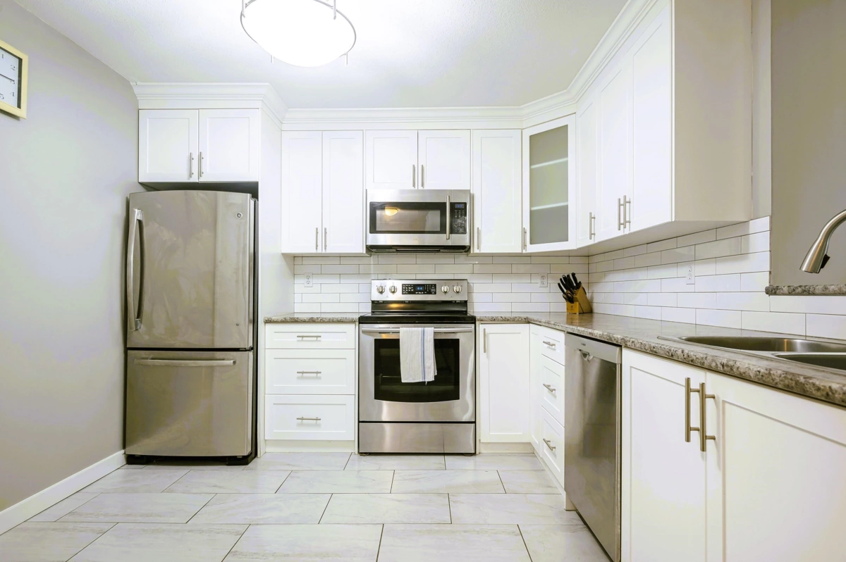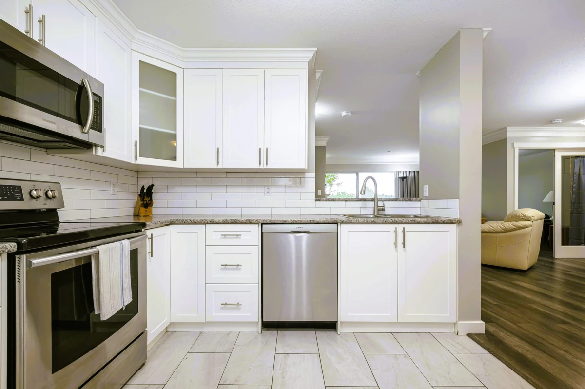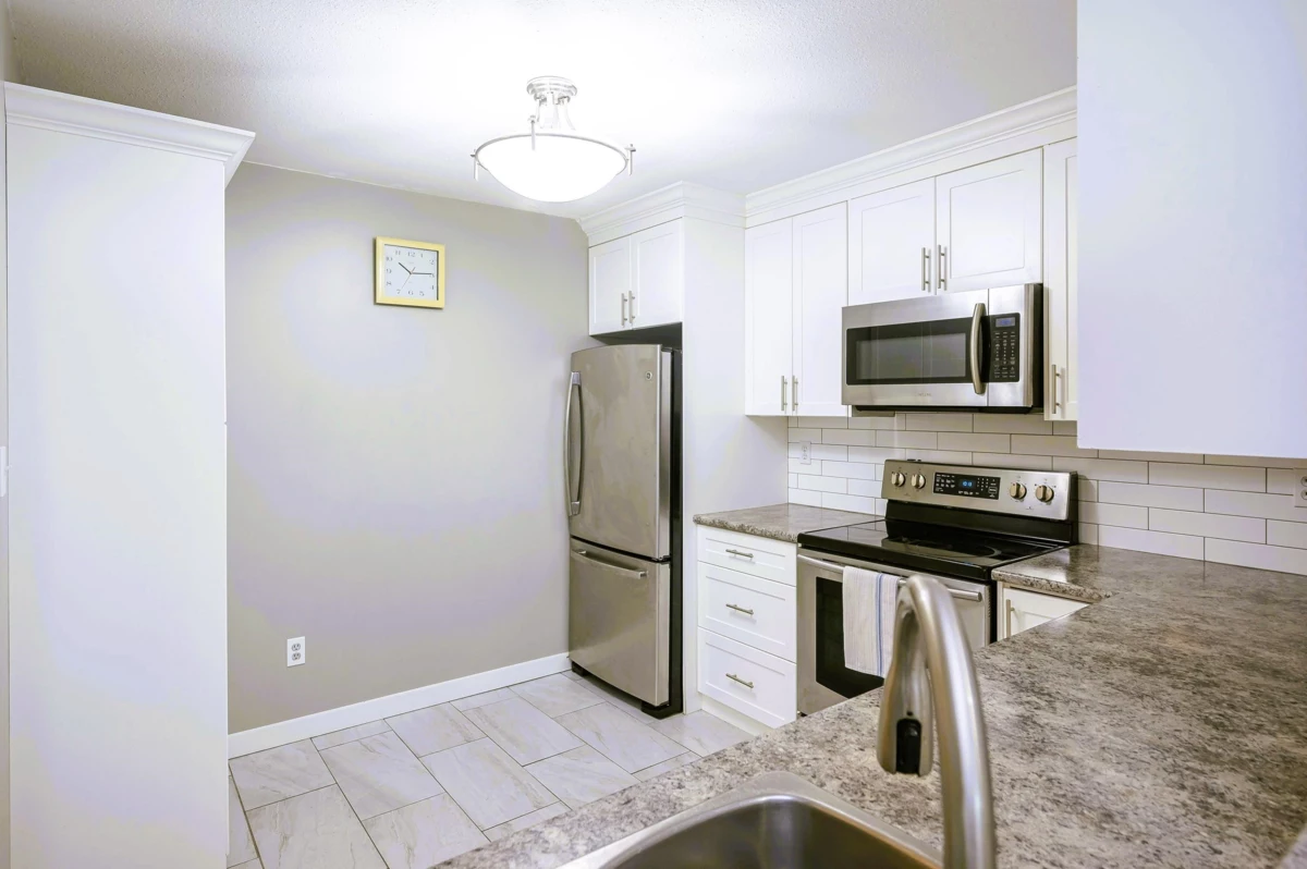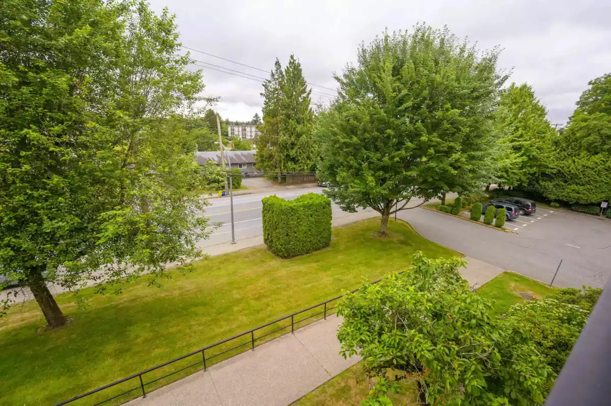 Welcome to Robert’s Court. This bright, top-floor, south-facing 2-bedroom, 2-bath condo offers 1,026 sq ft of smartly designed living space. The open layout features a kitchen with stainless steel appliances, white cabinetry, subway tile backsplash, and a breakfast bar. Bedrooms are thoughtfully separated for privacy, with a 4-piece ensuite in the primary. Crown moulding adds a finished touch, and the spacious laundry room doubles as extra storage. Building amenities include a gym and a games room. Steps to Fraser Highway, transit, shopping, parks, schools, and Kwantlen University. Pet-friendly with 1 dog up to 18 kg or 2 cats allowed. An ideal opportunity for a first-time buyer or downsizer.