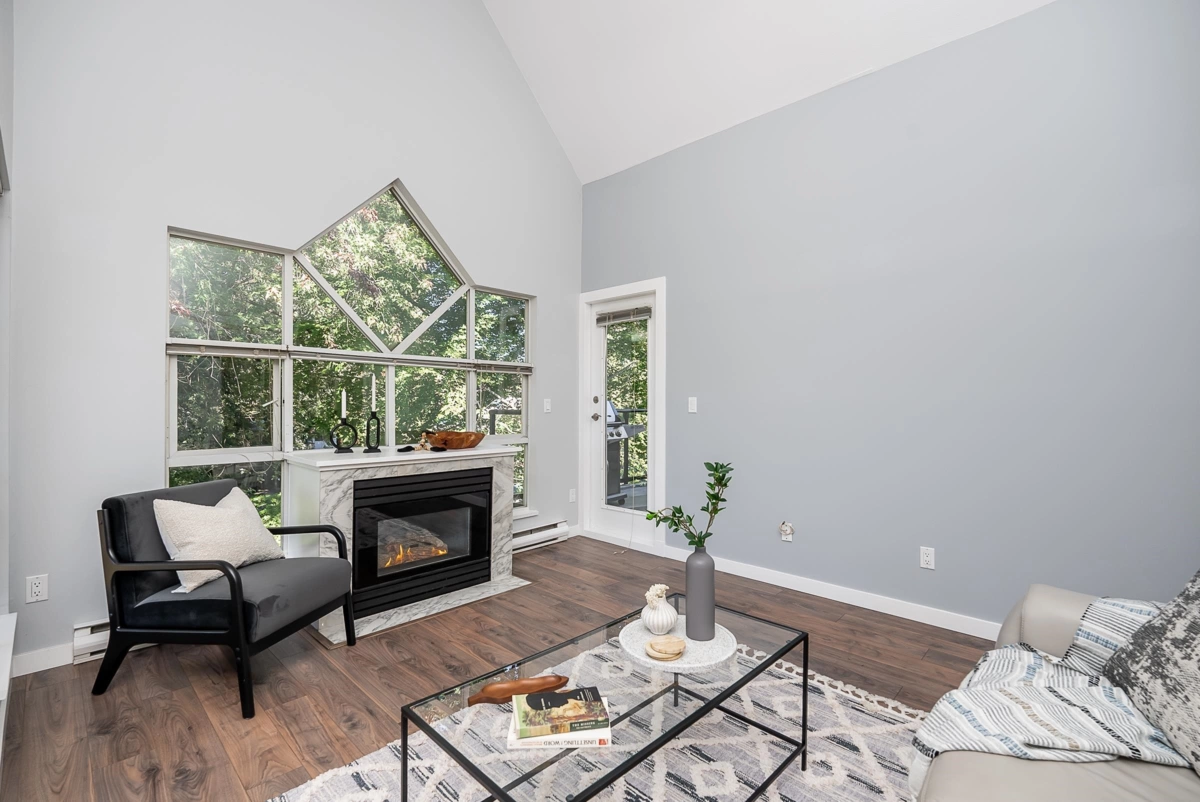 Welcome to this beautifully updated 2 bed, 2 bath TOP FLOOR, CORNER UNIT home! Offering 1,022 sq ft of living space overlooking lush greenery and Elks Park with incredible privacy! Enjoy a spacious, functional plan that has an updated bright kitchen with skylight, beautiful marble counters, S/S appliances and eating area. Bright living and dining with SOARING 15’ vaulted ceilings, oversized windows, gas fireplace w/updated surround, opening to a partially covered balcony w/glass railing. Generously proportioned bedrooms: primary is large enough to hold a king bed and has a walk through closet, 4 piece ensuite and access to the balcony. Laminate floors throughout, new paint, plenty of in suite storage, 2 parking. Prime location - walking distance to shopping, trails, WCE, Poco Rec Centre.