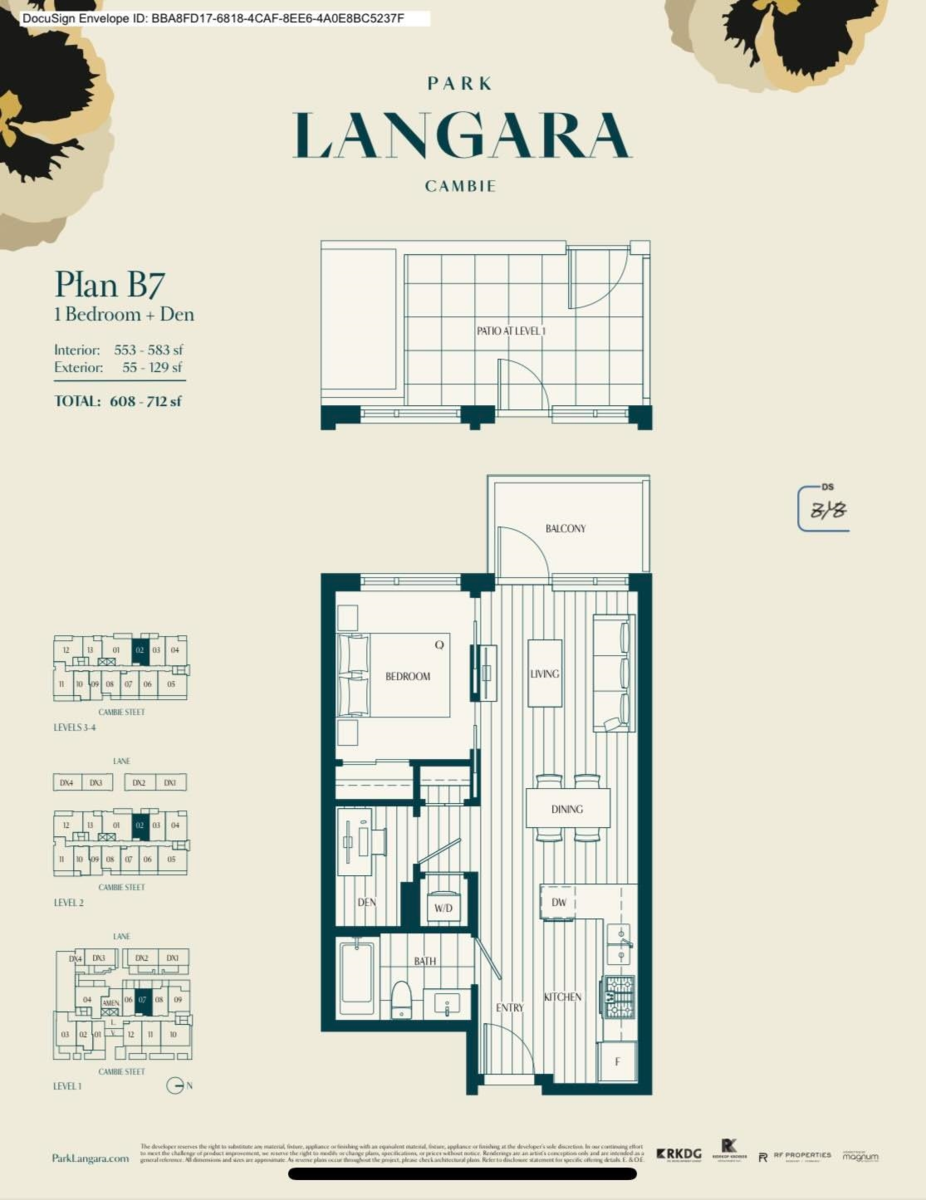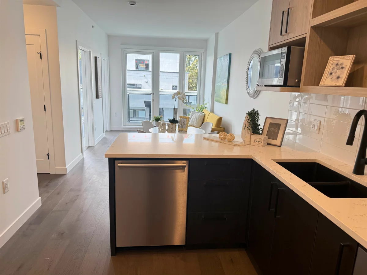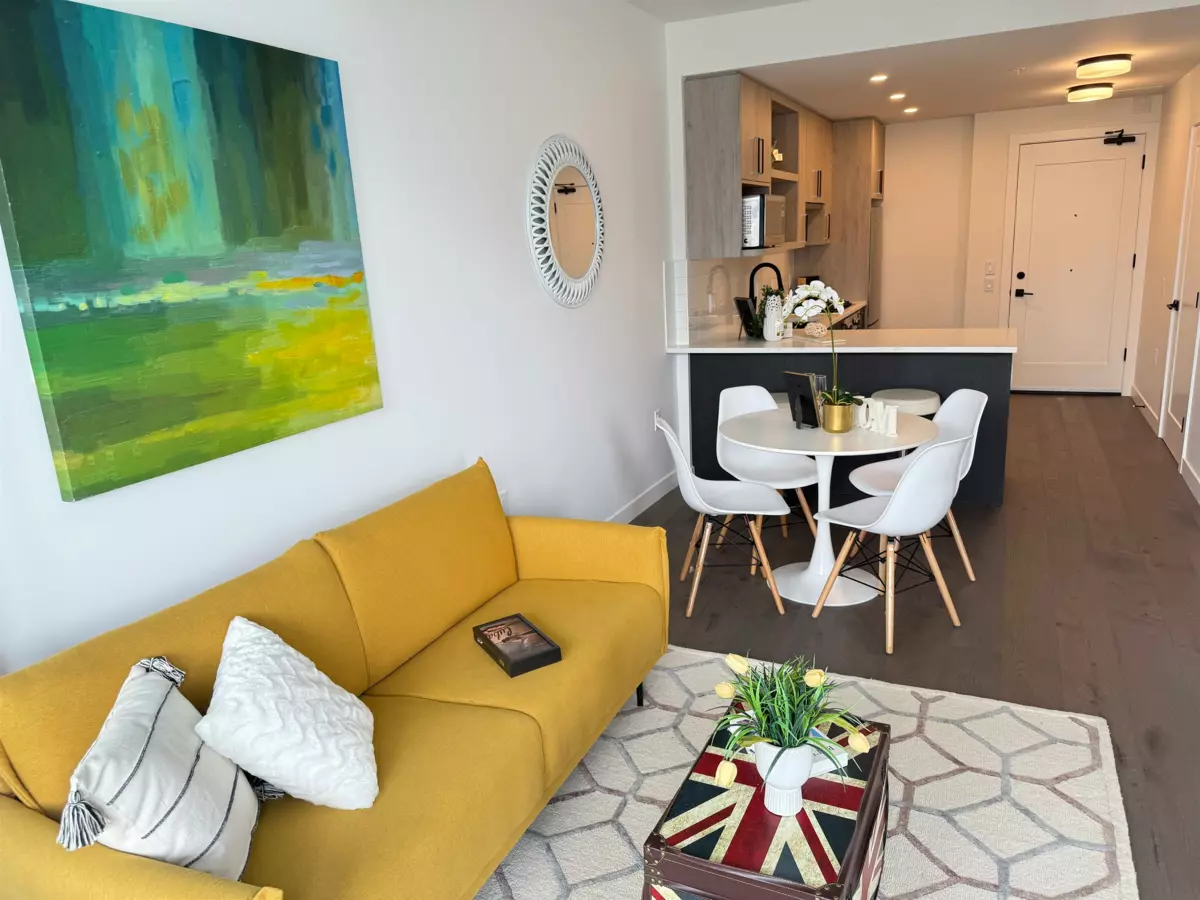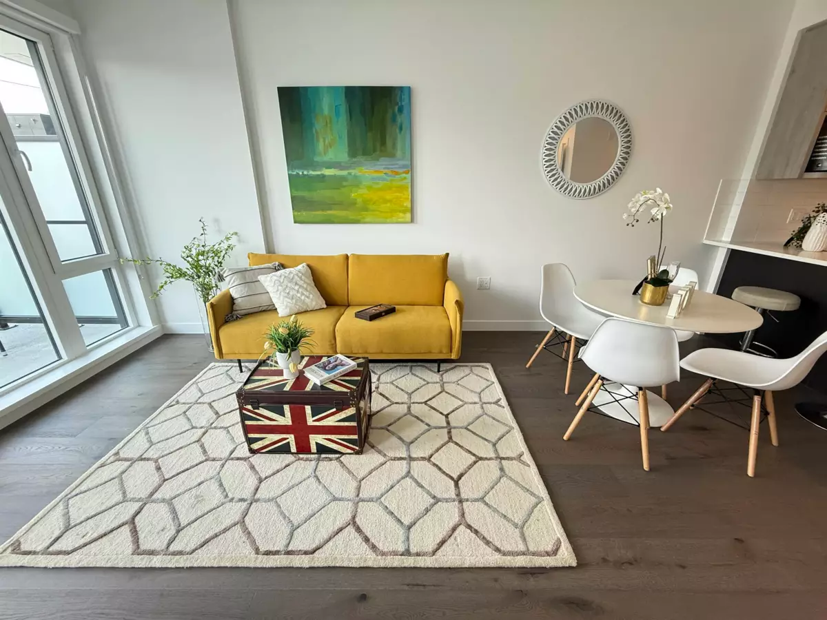 LOCATION! LOCATION! LOCATION! Concrete built property!!! This brand-new 1-bedroom + 1 den home faces a quiet inner street, offering both comfort and privacy. It features modern cabinetry, hard wood flooring, quartz countertops, high ceilings, and central air conditioning. The den is flexible - ideal as a home office or a guest room with a single bed. Includes 1 parking stall and 1 bike storage rack, plus full coverage under the 2-5-10 New Home Warranty. 5-minute walk to Langara - 49th Canada Line Station, offering direct access to Downtown, Richmond, and YVR Airport. Only 15 minutes walk to the future Oakridge Centre. With in walking distance to top-ranked schools, including Dr. Annie B. Jamieson Elementary and Sir Winston Churchill Secondary (IB program) .