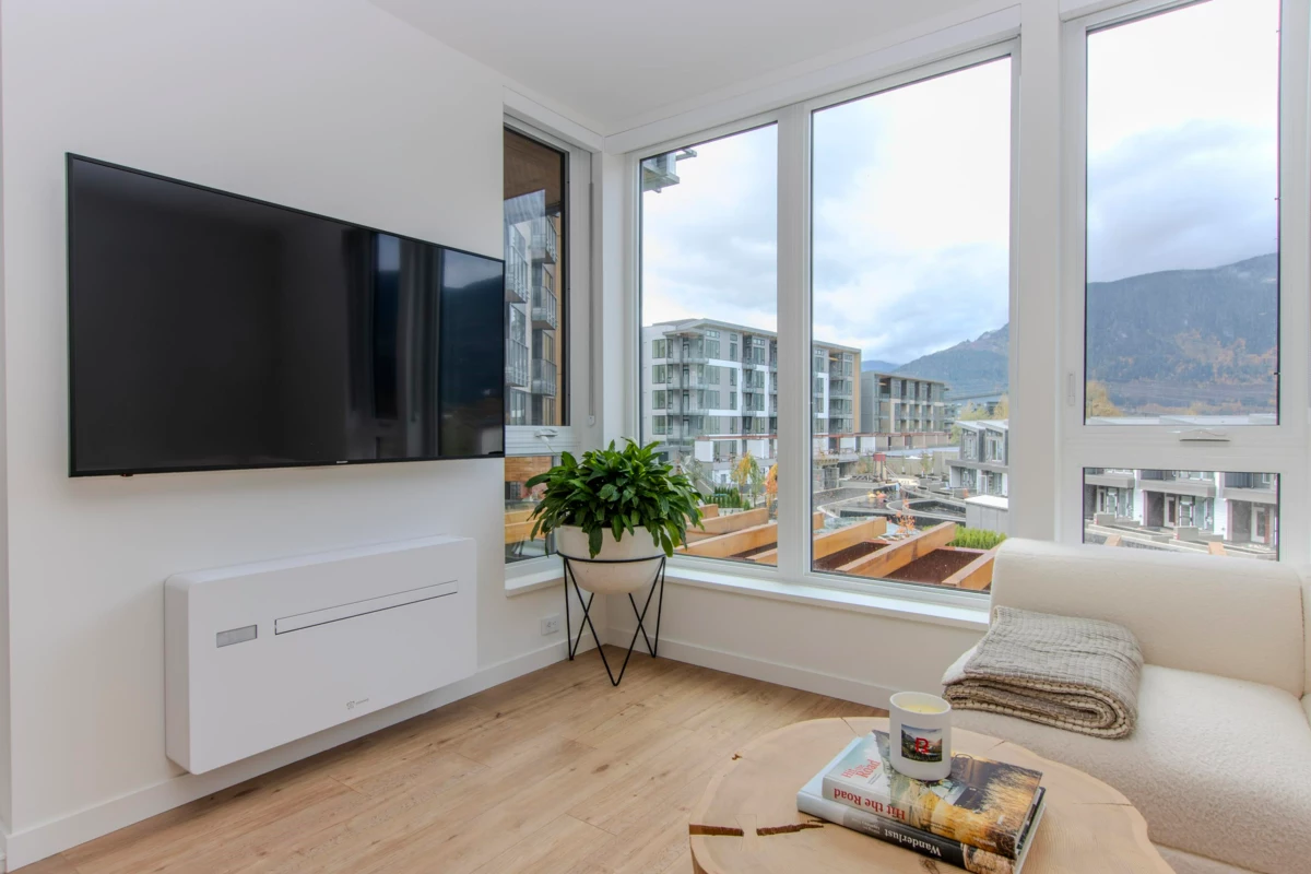 Experience waterfront living at Redbridge by Kingswood Properties. This modern 2 Bed, 2 Bath home features an open layout with expansive windows showcasing views of the Mamquam Blind Channel and Tantalus Range, all anchored by the Italian-crafted Inform kitchen. Enjoy your 130 sq. ft. patio and access Redbridge's renowned Base Camp amenities: sauna, cold plunge, hot tub, red light therapy rooms, fitness centre, yoga studio, multiple lounges, concierge service, community garden plots, dog wash, bike lab, secure parcel lockers, and smart building access via One Valet App. Exceptional lifestyle value with low strata fees in one of Squamish's most desirable communities. Open Saturday, January 24th, 11am-2pm