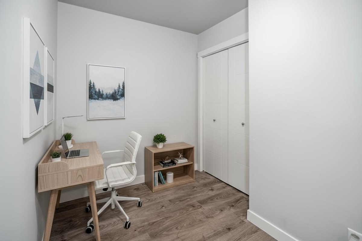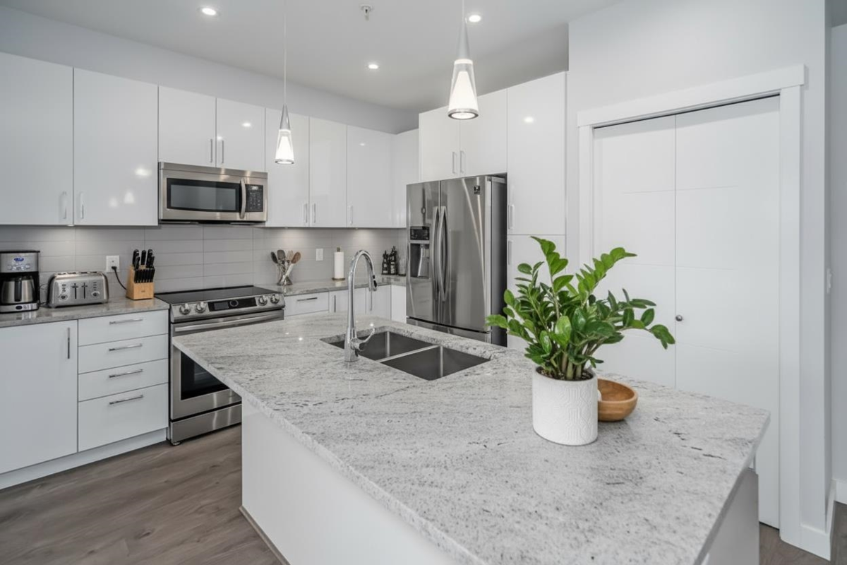 Modern style and comfort blend seamlessly in this 2 bed, 2 bath + den condo at The Elliot. The open layout showcases a sleek kitchen with granite counters, stainless steel appliances, and a large island that flows into a bright living area and north-facing balcony—ideal for morning coffee or evening BBQs. The primary suite offers a private ensuite, while the den is perfect for a home office or cozy reading nook. With same-floor storage, secure parking, and a pet-friendly policy (no size restrictions), this home delivers effortless living close to shopping, dining, and highway access.