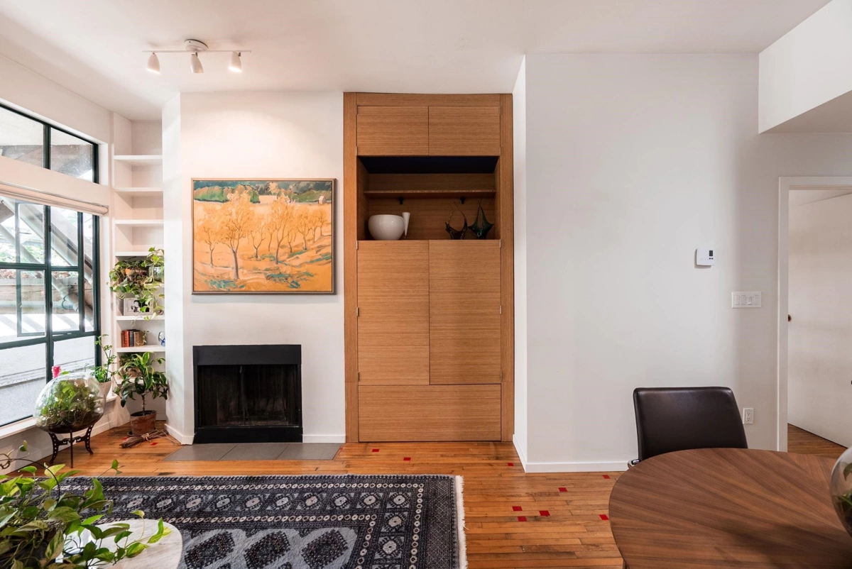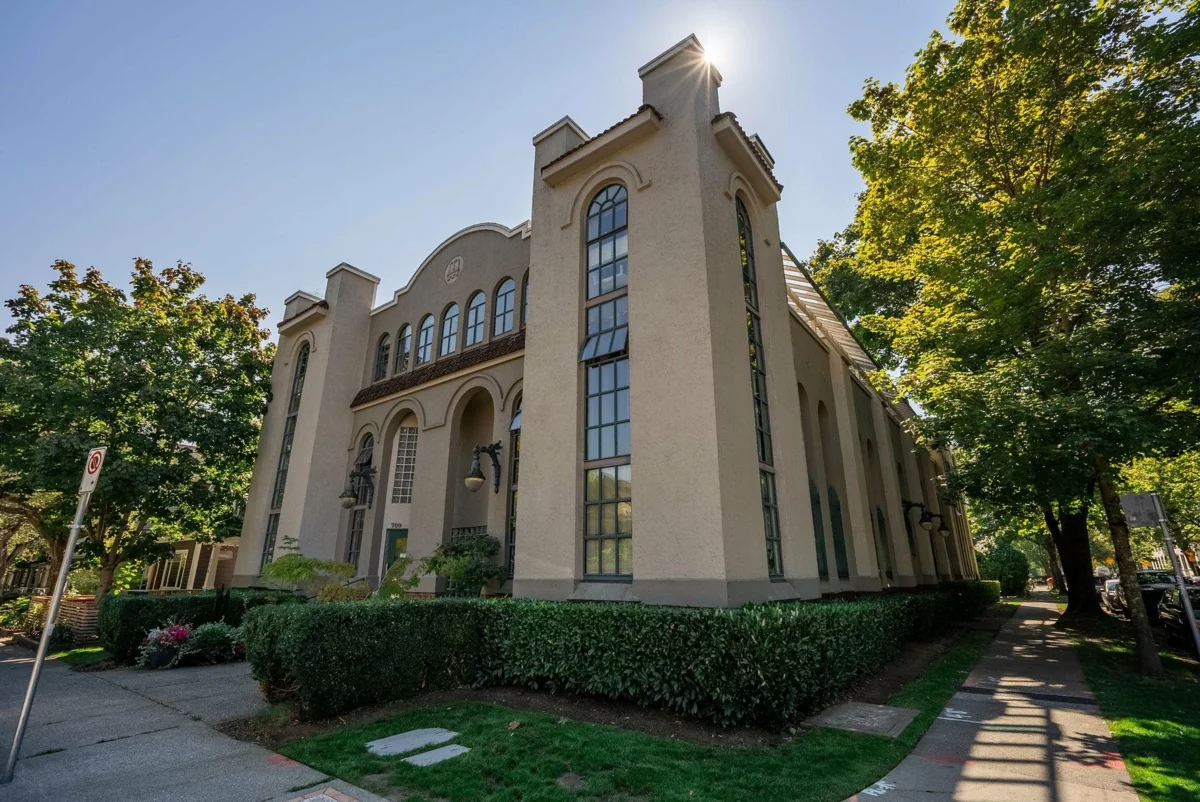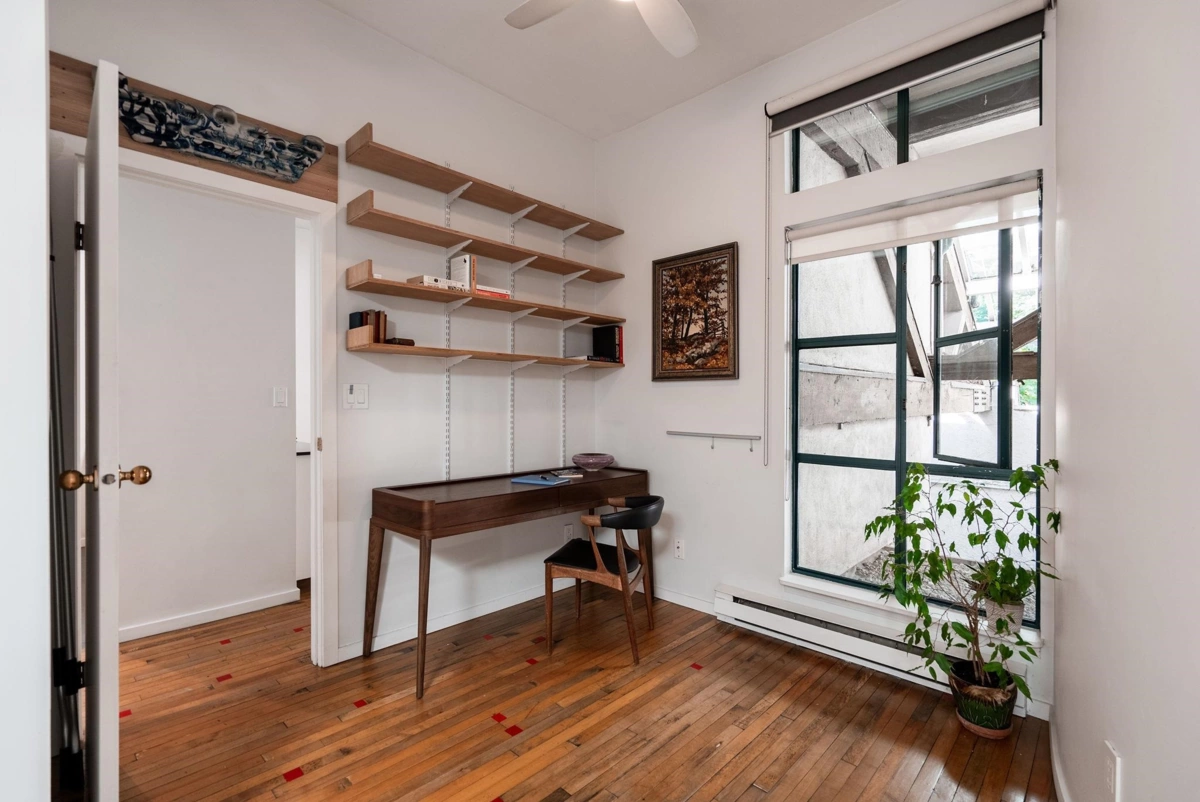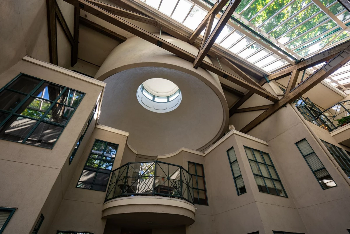 Penthouse living in a landmark, where light, volume, & character combine in a way modern condos simply can’t replicate. Fully renovated, 10’ ceilings, 4 skylights, full-span windows, & a rare sense of air & openness. Once Vancouver’s 1st synagogue, the building delivers heritage presence & the home, both cozy charm (wood fireplace!) & modern design - reclaimed flooring, Bocci lighting, sleek built-ins, spa bath. A huge bedroom allows for home office or flex/creative space, & the covered balcony is a treehouse retreat. Steps to MacLean Park, Community Centre, Railtown, & standouts like Kissa Tanto, Barbara, Finch’s & more . This is not a $/ft2 purchase, but a unicorn home in a unicorn building in neighbourhood where community thrives. In-suite W/D. Walk-up. 1 parking, 1 storage