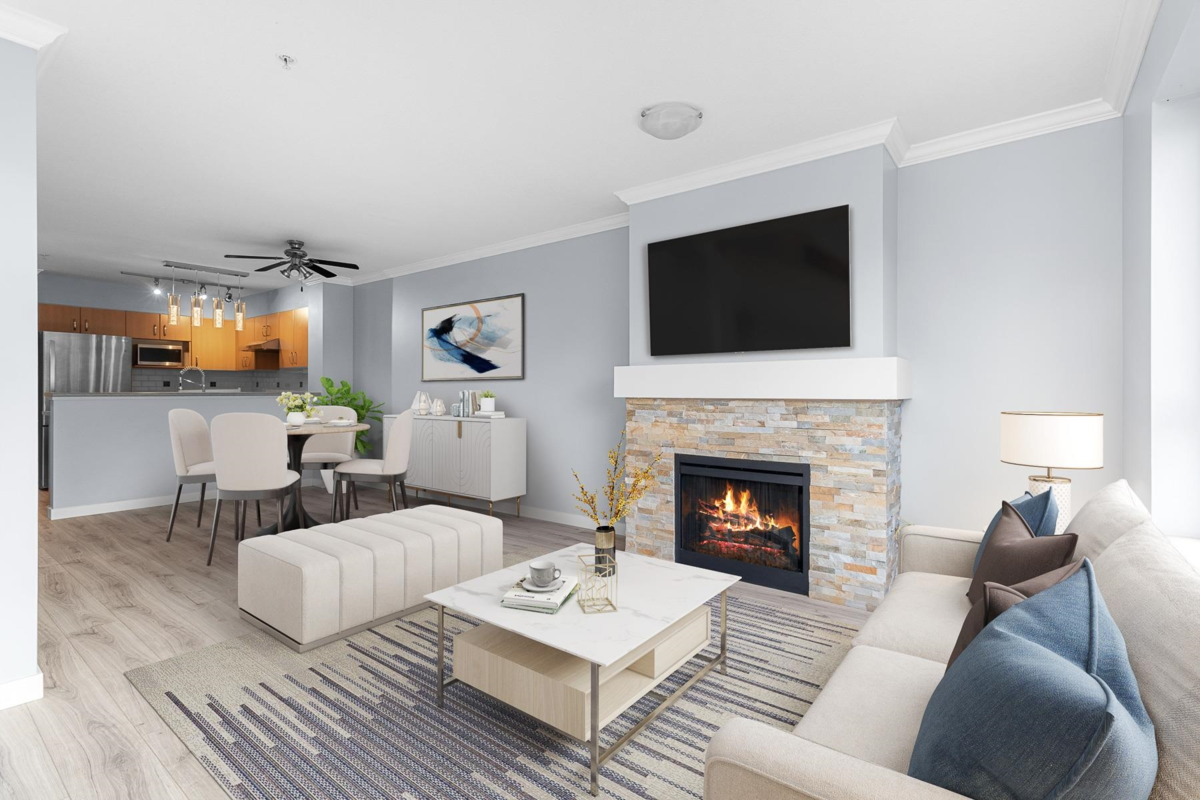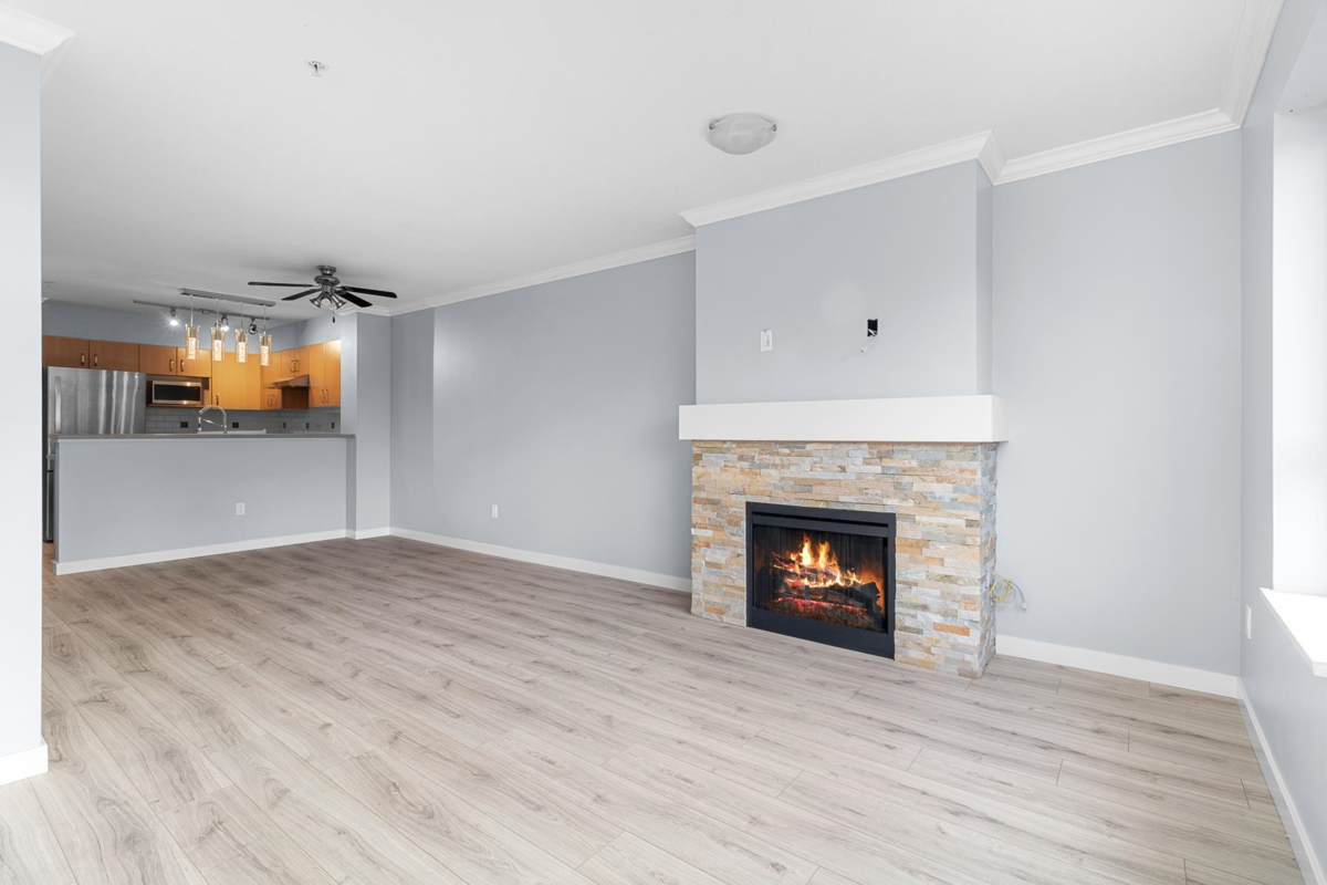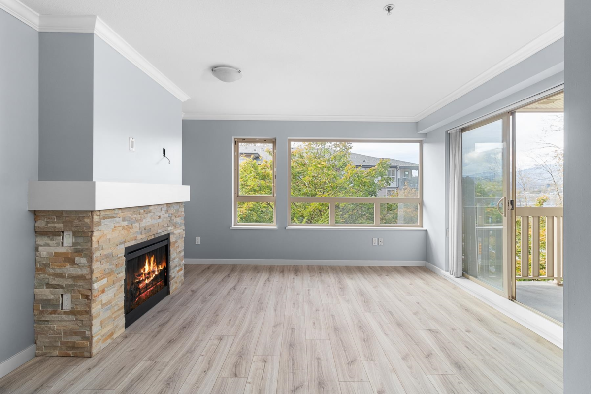Situated high up on the 3rd floor surrounded by luscious greenery you will find this 2 bed 2 bath West Coast Treasure w/ sweeping seasonal inlet and mountain VIEWS from all living areas incl your 15’ 8 x 6’ 3 FULLY COVERED entertainer sized DECK! Curl up to your slate fireplace and enjoy the LIGHT FILLED windows that capture the SERENE OUTLOOK of the waterfront trails which lead directly to; Rocky Point, Brewery Row, & Newport Village. With the Westcoast Express & Evergreen a short stroll away, leave the cars at home (although this unit has the RARE benefit of TWO parking & a locker!) You will love that the primary boasts w/in closet. The kitchen features gas range & breakfast bar. An ACTIVE lifestyle awaits w/ Pool, Hot tub, Tennis Courts, Exercise & Billiards Room.