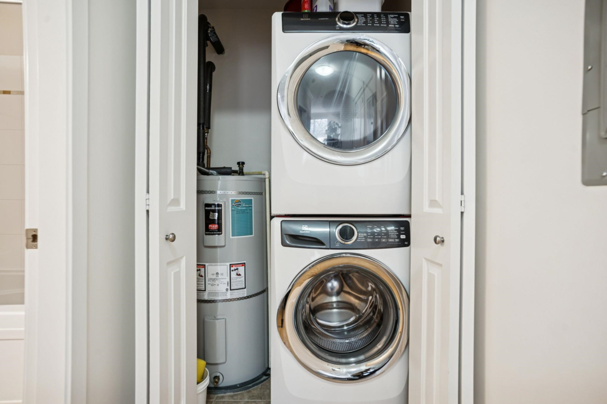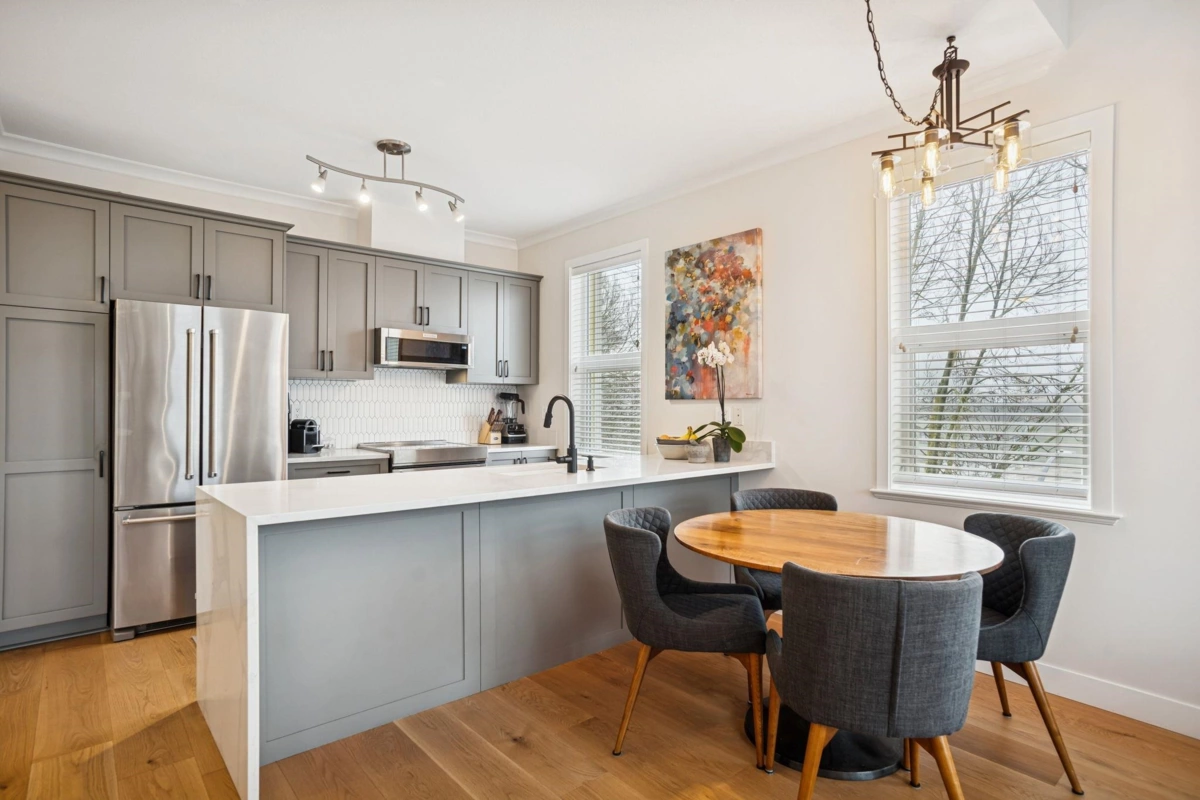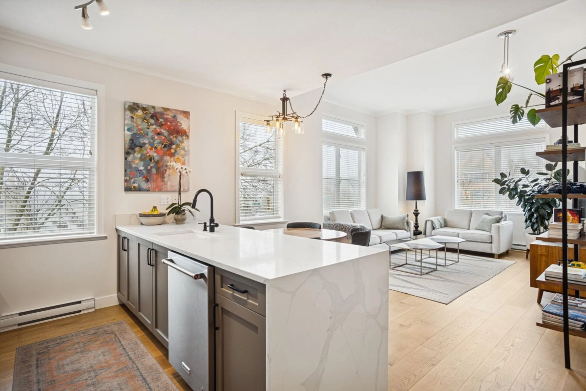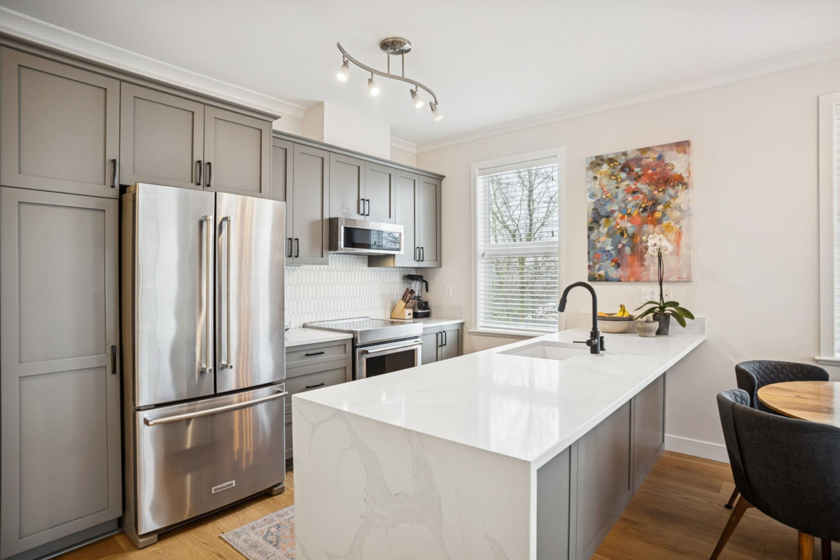 Show-stopper updated penthouse corner residence at the ever popular Fairview 56 building in upper Beach Grove Tsawwassen. With 11 ft ceilings & flooded with light, this floor plan incl’s 2 bed & 2 bath with 1024 sq ft of polished living space. Updates incl. renovated kitchen featuring brand new S/S appliances, cabinetry & a striking waterfall countertop, new white oak engineered hardwood flooring & paint throughout, new baseboard heaters w/smart thermostats along with new bathroom vanities, counters, sink & faucets plus new washer/dryer…the list goes on! West facing balcony with south west corner views of everything Tsawwassen has to offer and within steps to shopping, recreation, coffee shops & transit. Pet friendly building that incl’s 1 parking & 1 storage. Turn key & shows like new!