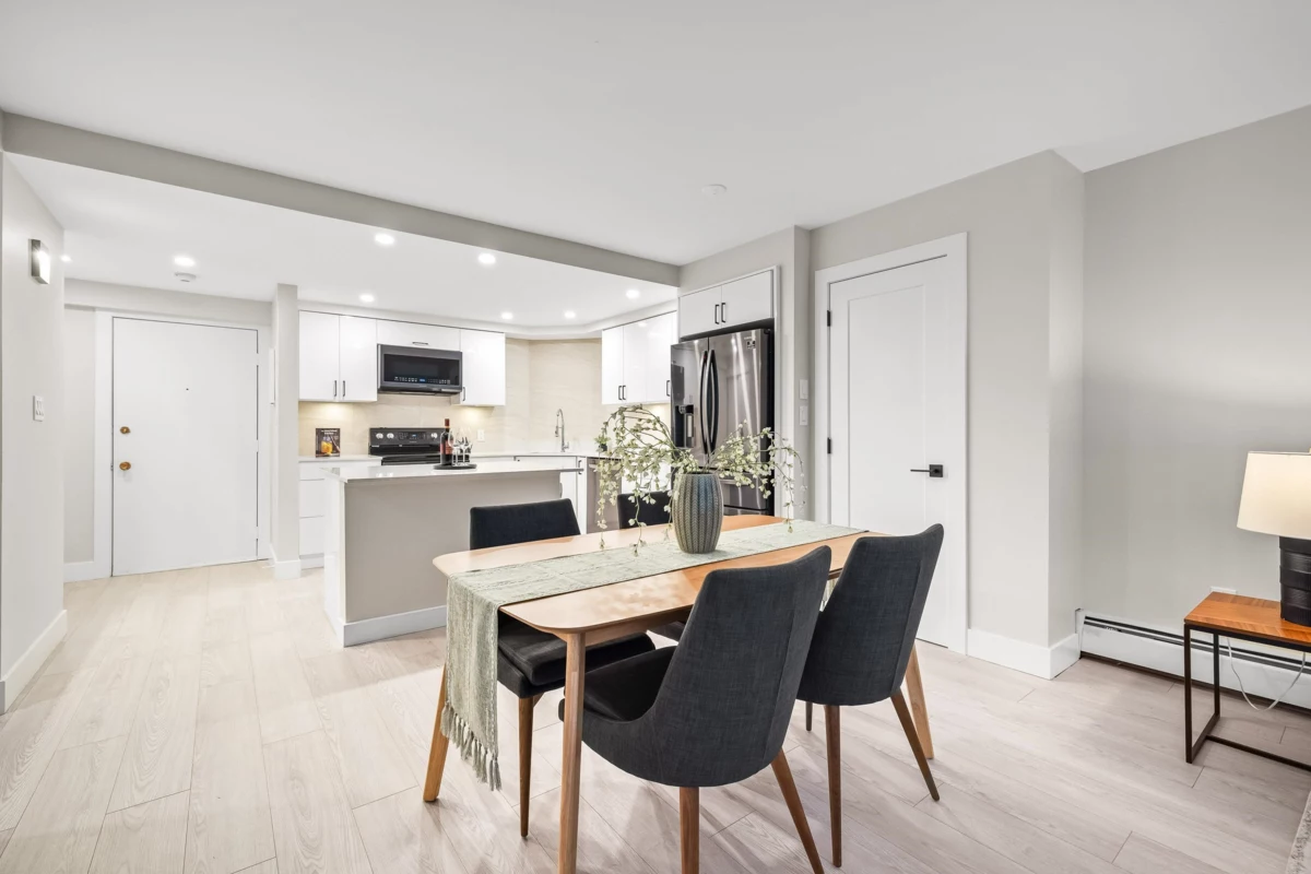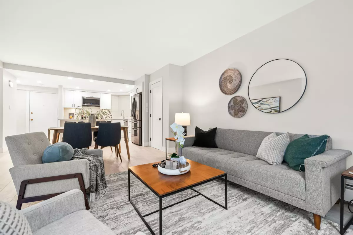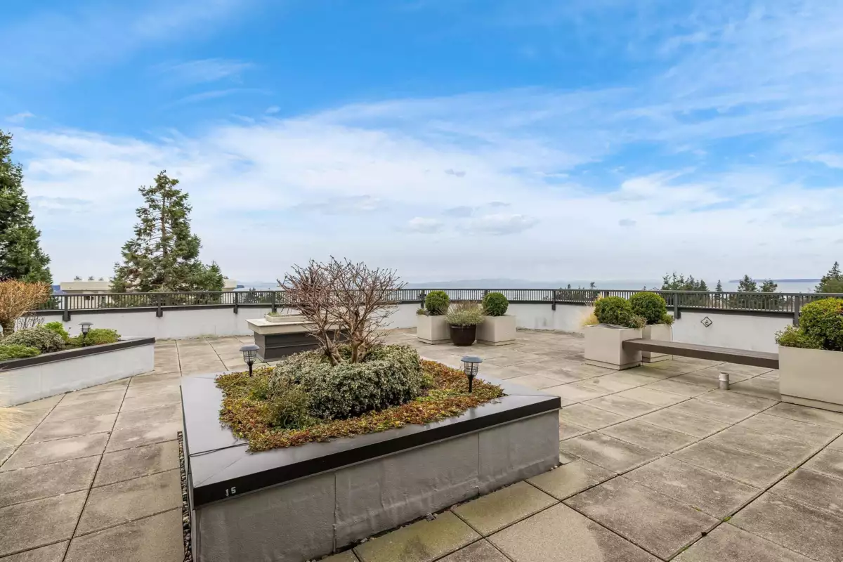 Welcome to White Rock Square! This beautifully renovated 1-bed, 1-bath condo offers 940+ sq. ft. of stylish, modern living space in the heart of downtown White Rock! The spacious primary bedroom boasts a luxurious ensuite, while the custom kitchen features a sit-up bar and full pantry. Relax and enjoy your bright solarium with serene treed views of Bryant Park. Incredible amenities include a rooftop patio with breathtaking ocean and Gulf Island vistas, a fireside lounge, billiards room, and sauna. Keep your car at home - steps from shopping, dining, entertainment, transit, and the local farmers' market. Everything you need is within easy reach. No age restrictions. Strata fees cover heat and hot water. Includes 1 secure parking spot + storage locker. Sorry, no pets.