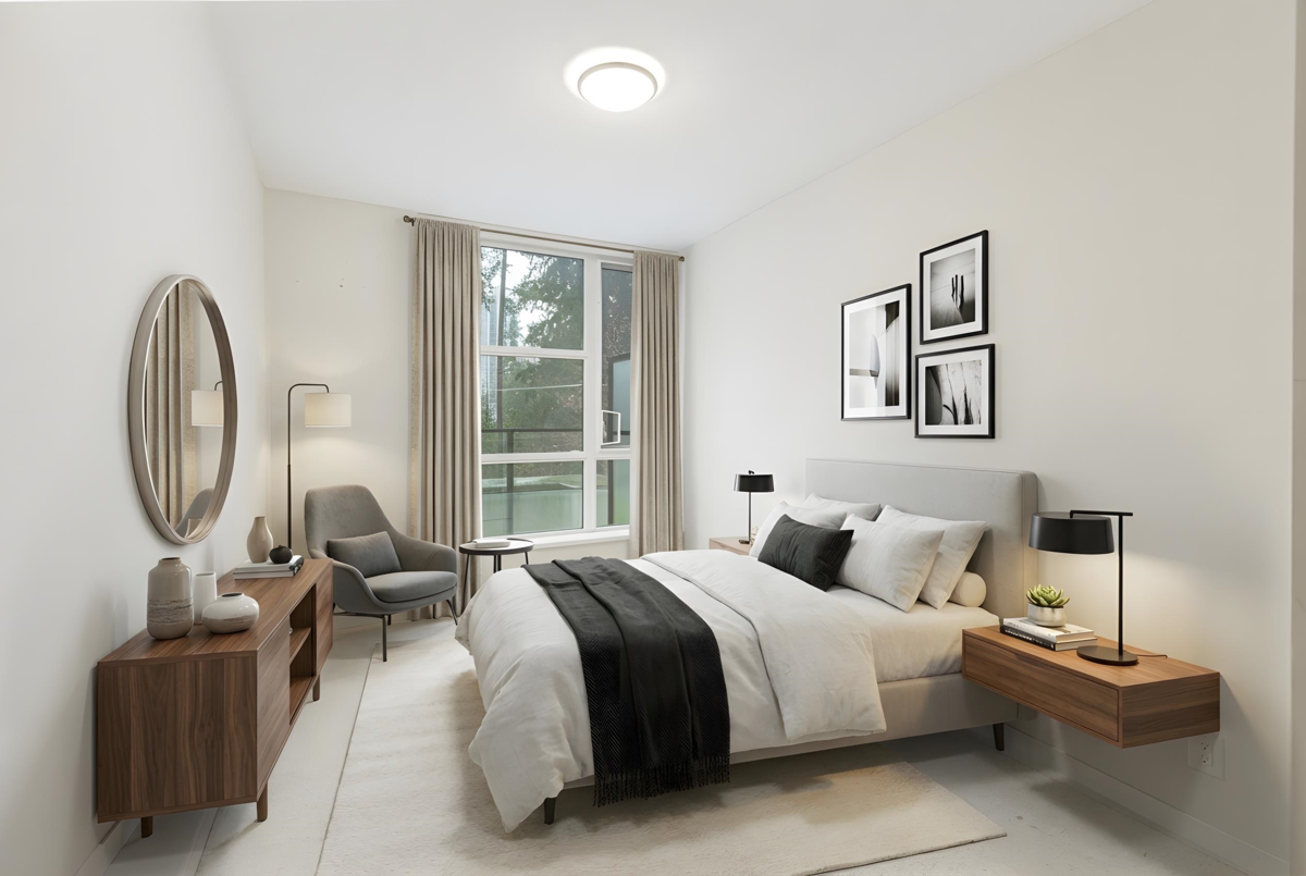 Mantyla - a high-quality concrete complex built by the renowned developer Polygon. This desirable southwest corner home is surrounded by nature trees and offers a peaceful garden view. The spacious 2 bedroom + den layout provides comfortable living, complemented by premium amenities including an on-site gym and an impressive 18,000 sq. ft. clubhouse. Features include a large covered deck, floor-to-ceiling windows, and a bright open layout. The primary bedroom offers both a large closet and a walk-in closet, along with a lux ensuite. The modern kitchen boasts a large island and quartz countertops. Ideally located within walking distance to SkyTrain, Coquitlam Centre, and all amenities.
