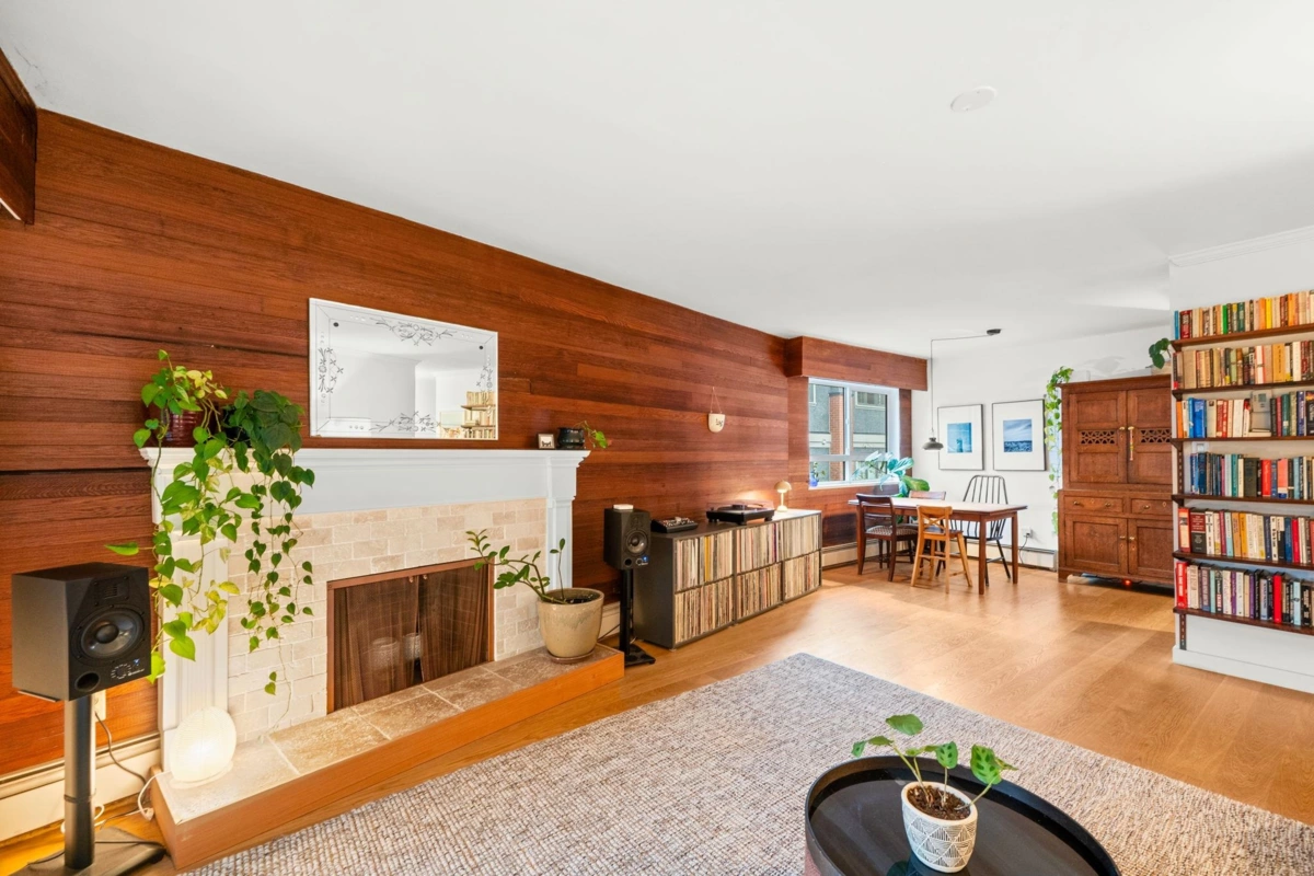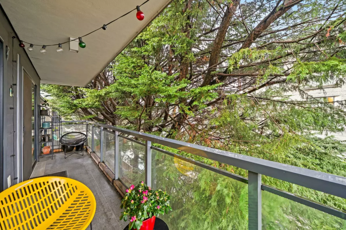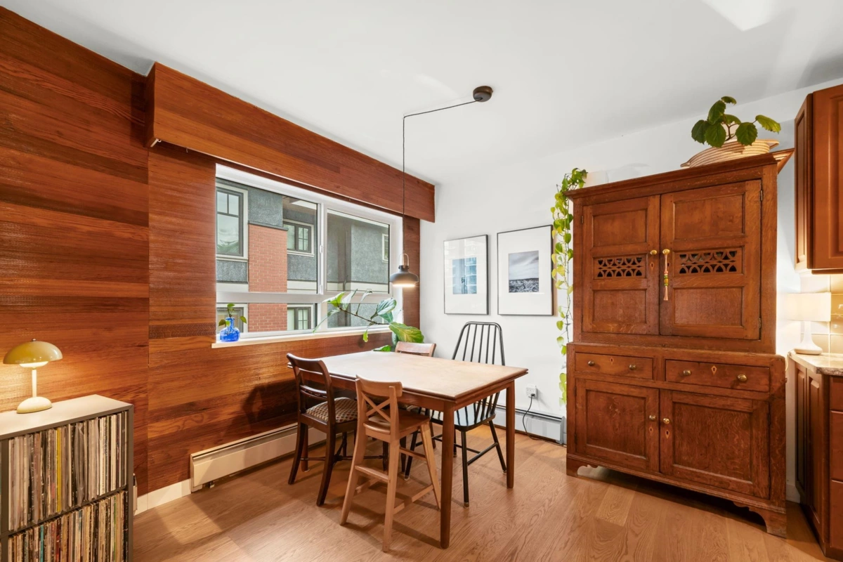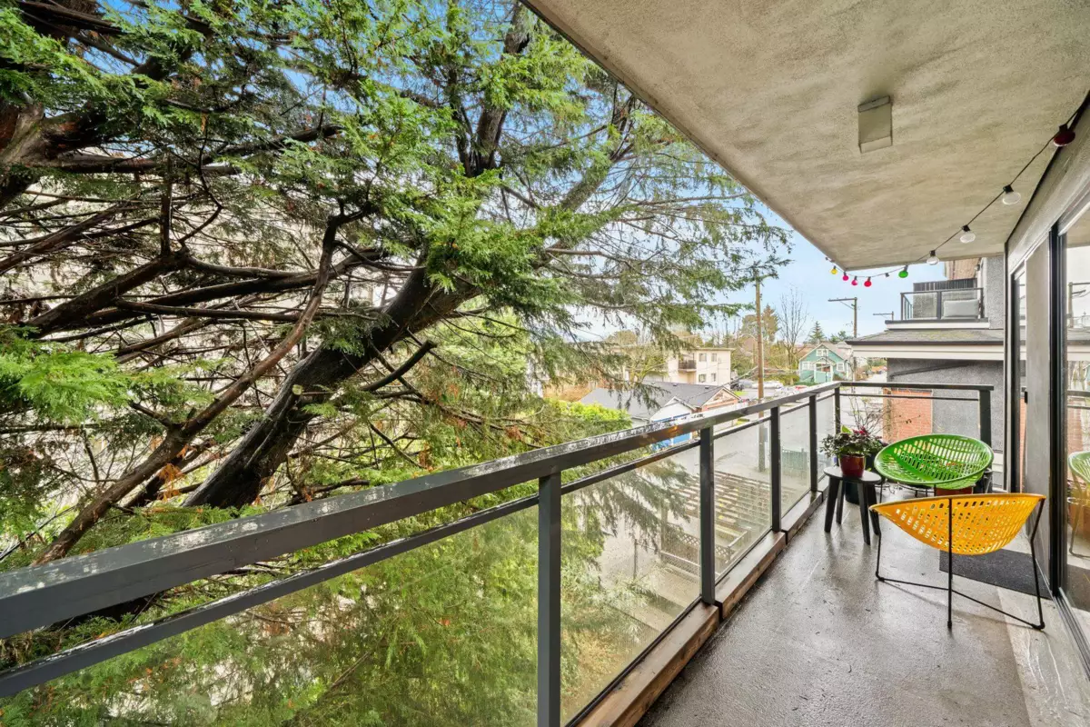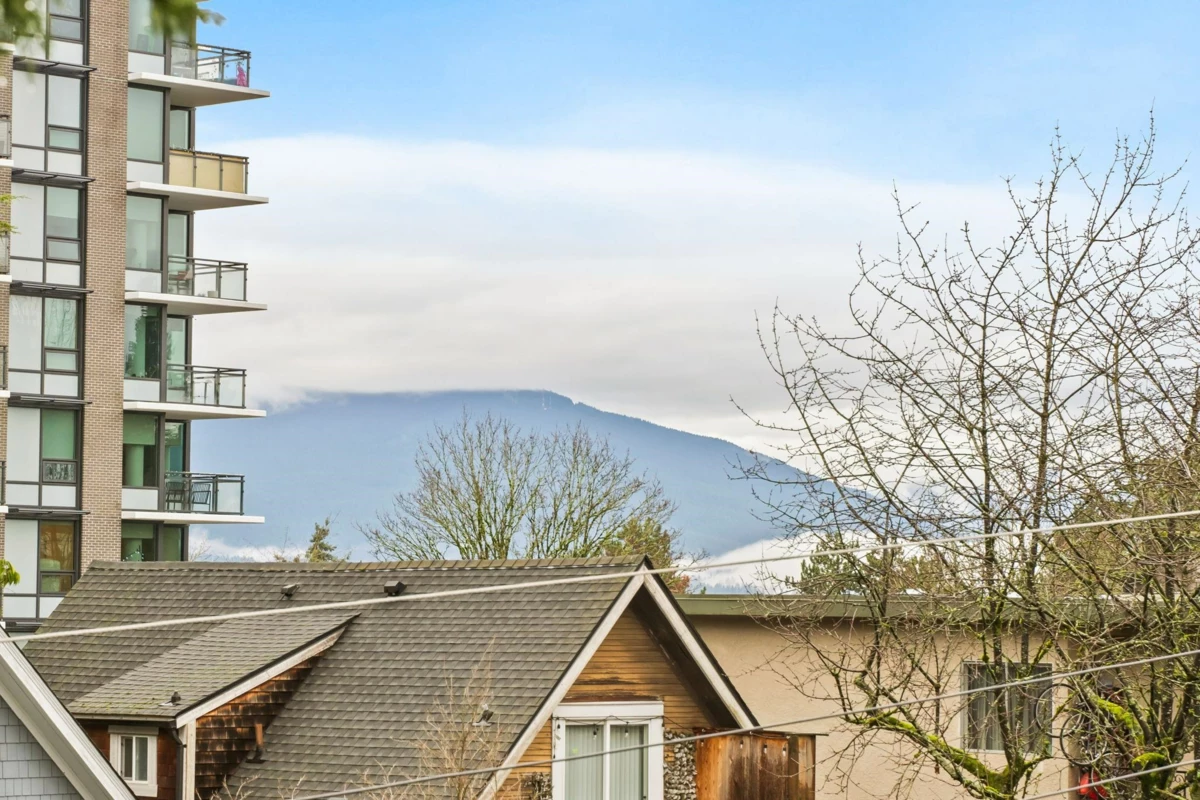 TOP FLOOR CORNER UNIT 1 block off Main! Fantastic location on quiet tree lined street - steps to the best restaurants, cafes, breweries, parks, schools, community centres in the city! Spacious 2 bed 1 bath 930sf Top Floor unit - large open living space feat beautiful white oak engineered hardwood, tons of windows being corner unit w/ beautiful natural light, wood burning fireplace, updated kitchen & bathroom! NE balcony with views of north shore mountains. In suite storage & california closet organizers. Hot water hear incl in strata fee. Proactive strata & well maintained/updated building: balcony railings 2016, windows & sliding doors 2022, common area carpets & boiler 2025. 1 parking included. Shared Laundry - 3rd floor across hall (new machines 2025). OH: Thurs 5-6pm & Sat 2-4pm!