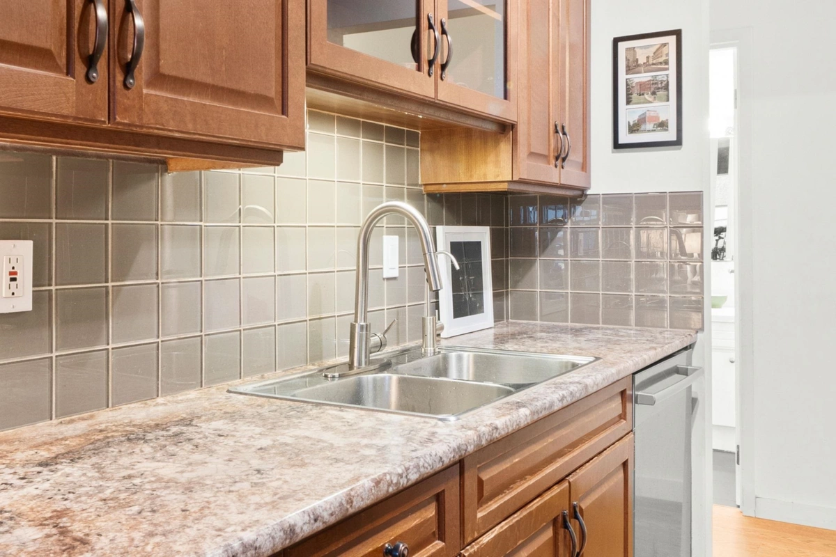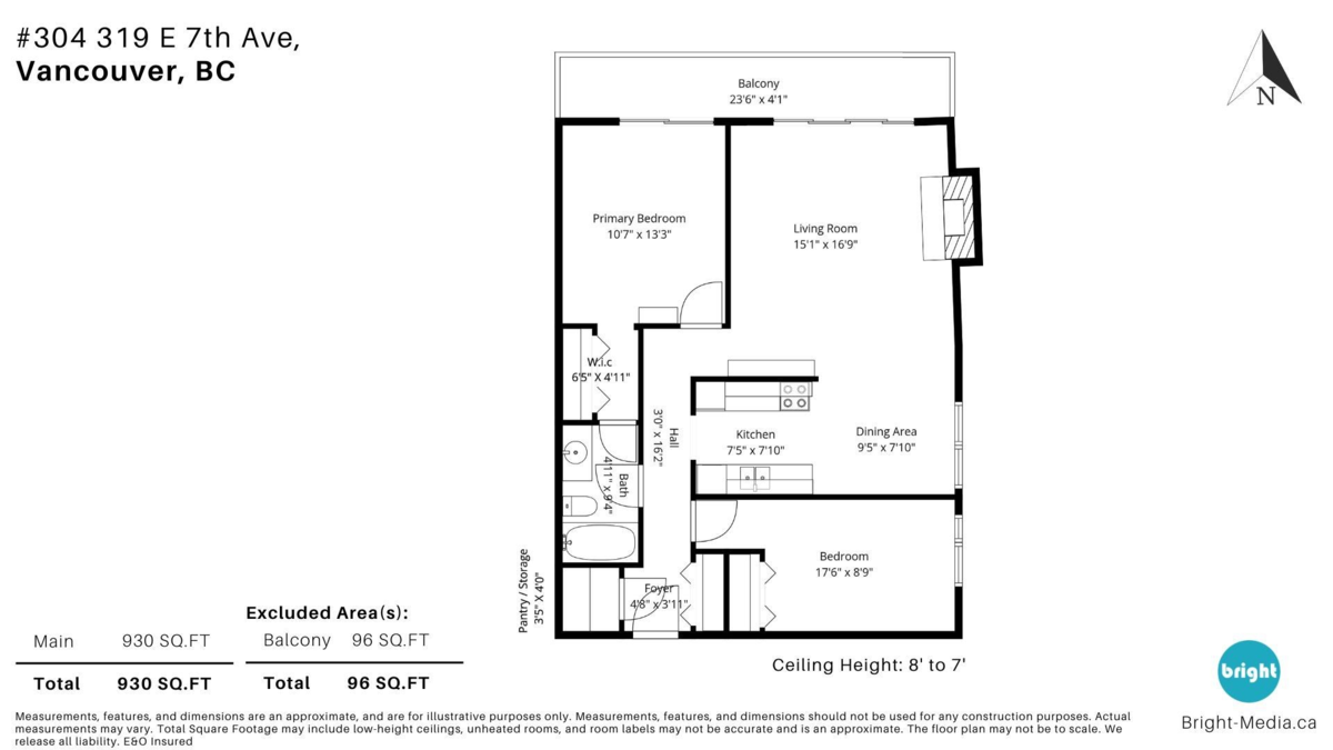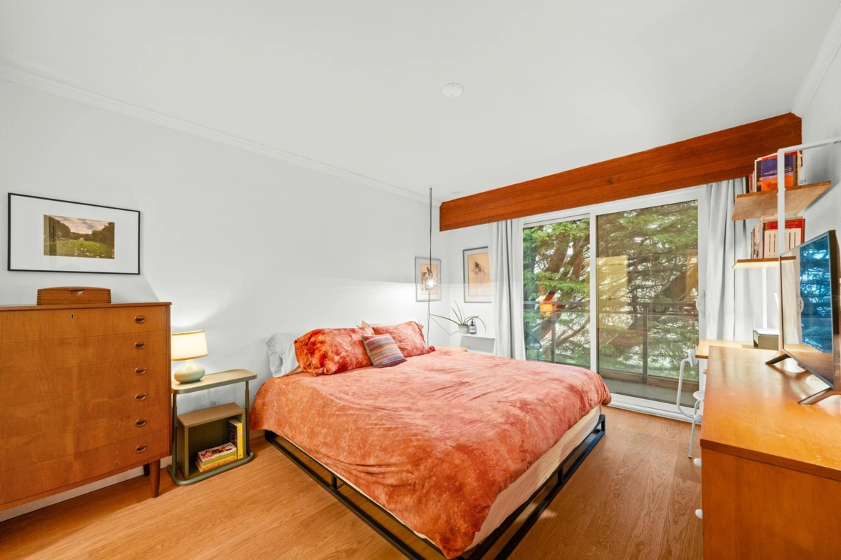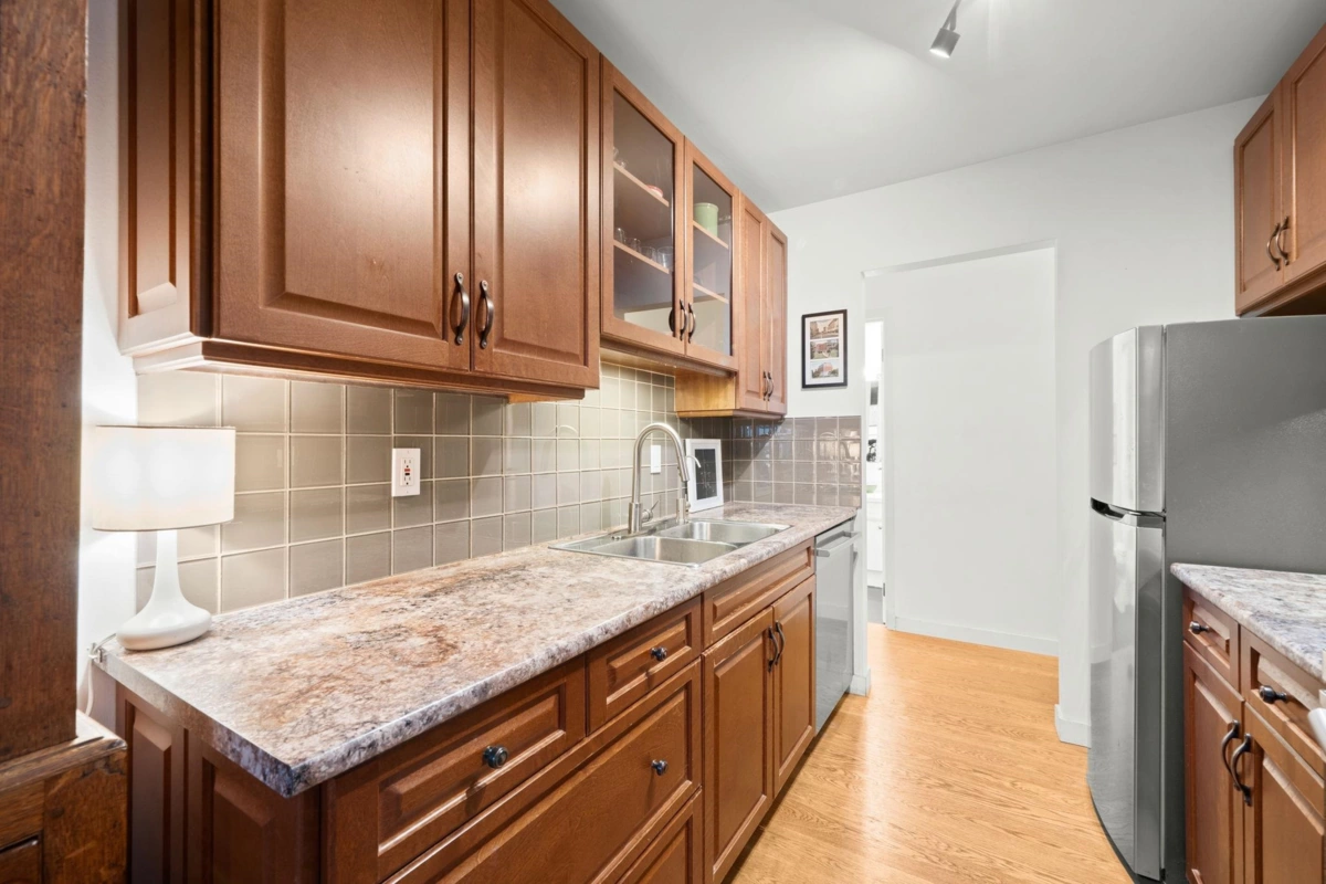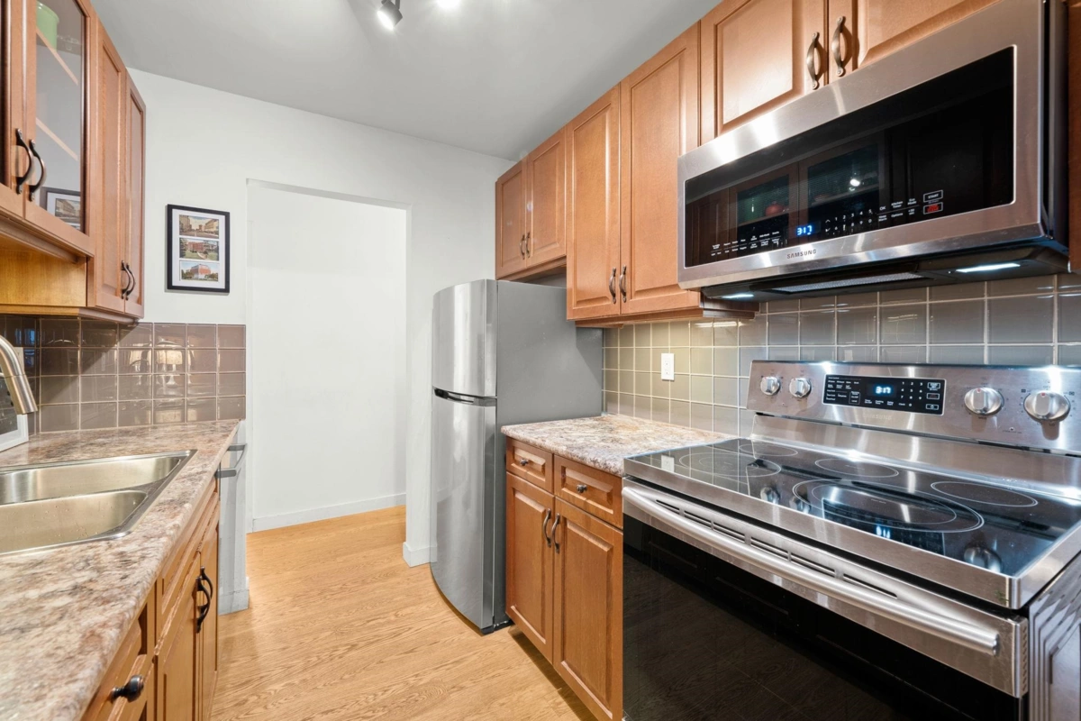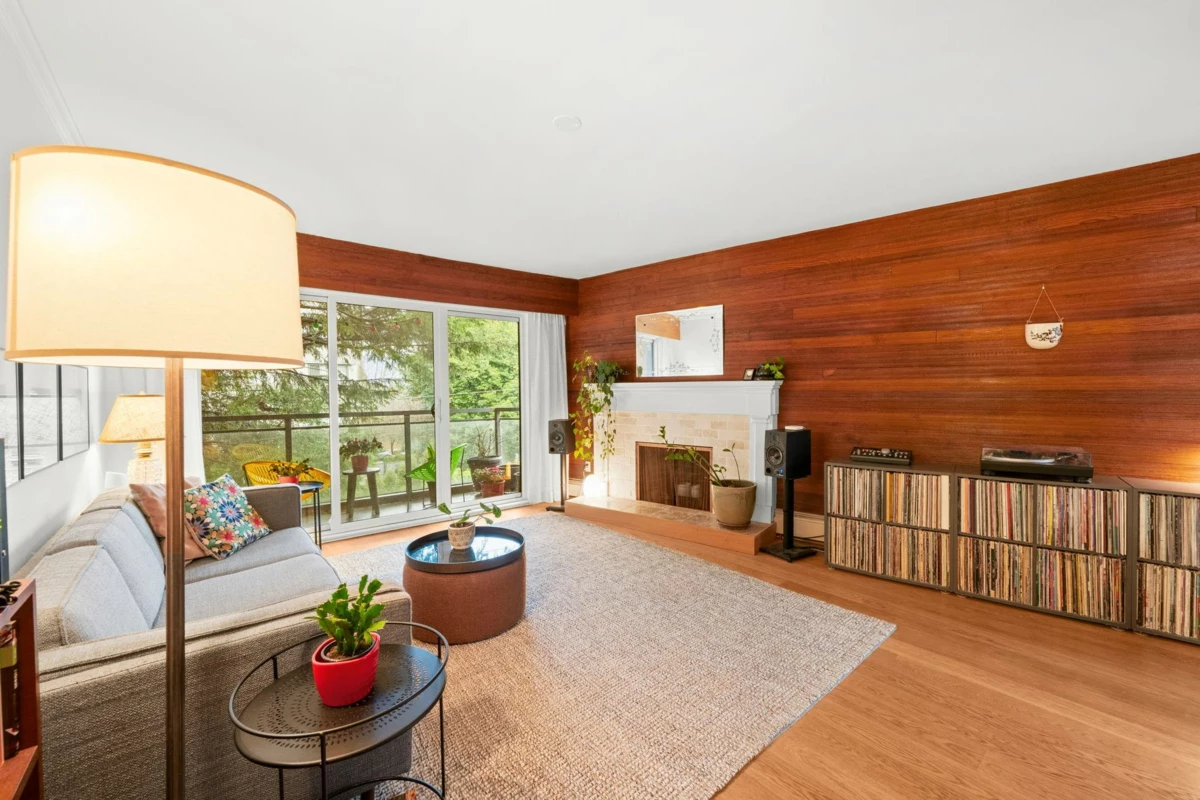 TOP FLOOR CORNER UNIT 1 block off Main! Fantastic location on quiet tree lined street - steps to the best restaurants, cafes, breweries, parks, schools, community centres in the city! Spacious 2 bed 1 bath 930sf Top Floor unit - large open living space feat beautiful white oak engineered hardwood, tons of windows being corner unit w/ beautiful natural light, wood burning fireplace, updated kitchen & bathroom! NE balcony with views of north shore mountains. In suite storage & california closet organizers. Hot water hear incl in strata fee. Proactive strata & well maintained/updated building: balcony railings 2016, windows & sliding doors 2022, common area carpets & boiler 2025. 1 parking included. Shared Laundry - 3rd floor across hall (new machines 2025). OH: Thurs 5-6pm & Sat 2-4pm!