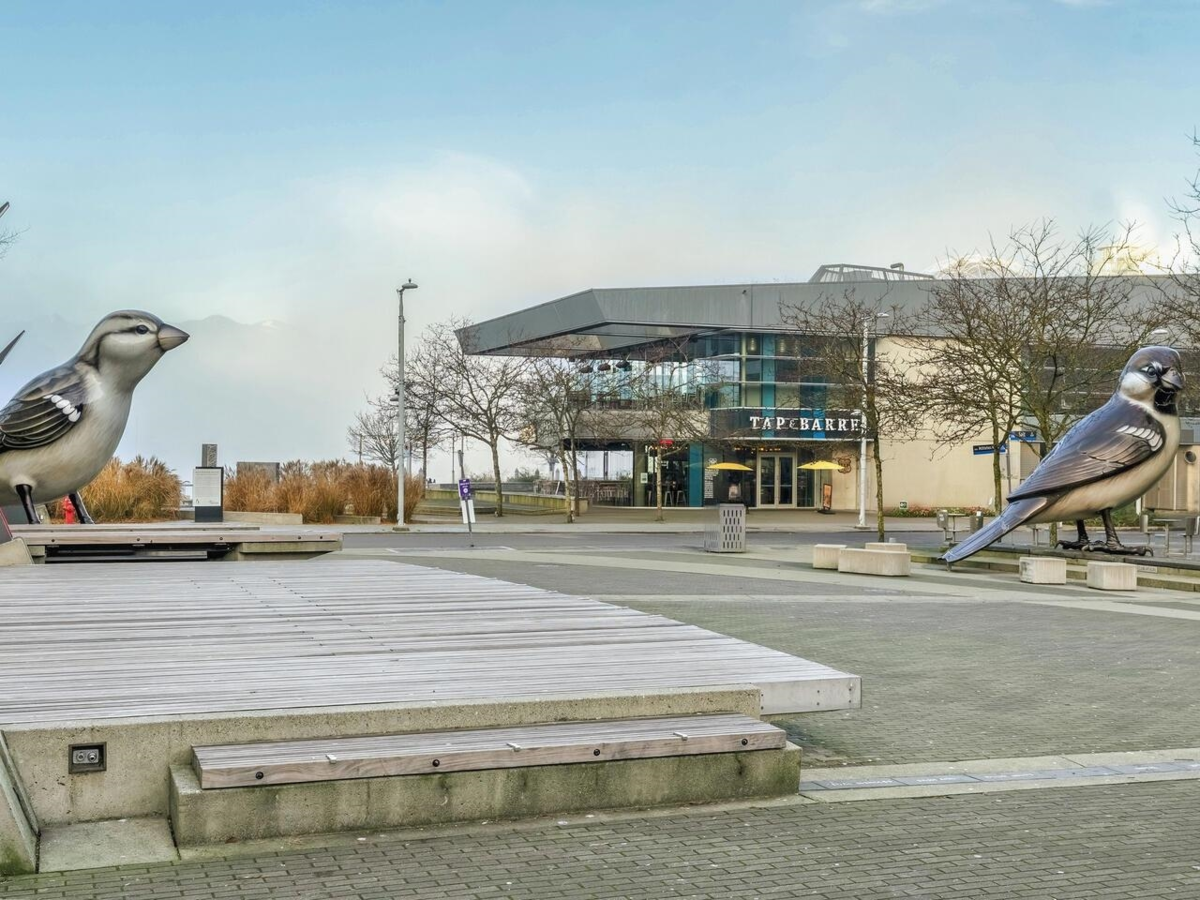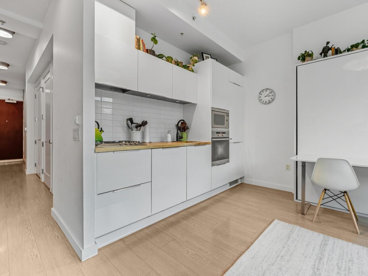 Compass in Olympic Village. The Condo - Great layout with bedroom and walk-in closet with custom organizers. The kitchen has been updated with high gloss cabinetry and butcher block countertop, gas cooktop, and wall oven. Contemporary laminate flooring, nearly 10 foot ceilings, and a private outlook toward Craft Brewing (The historic Vancouver Salt Co). Peak at the water from the spacious patio. The Location - steps to the seawall, shops, theatres, coffee, and some of Vancouver's best seaside dining. The Building - leed certified, with open breezeways, secure parking (including for visitors), storage, and access to the world class amenities at The Gold Club for swimming, whirlpool, sauna, and a fully equipped fitness centre. Pets OK. Open House Saturday Jan 24 from 2:30pm-4pm.